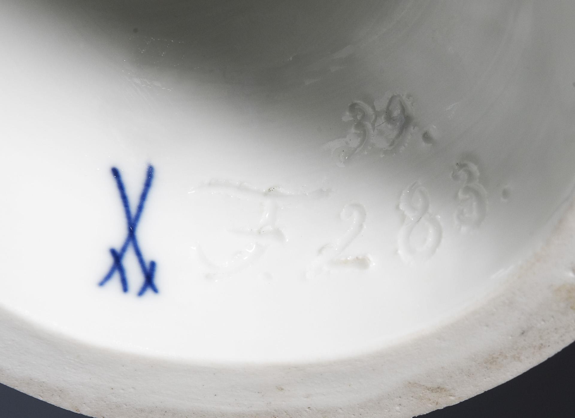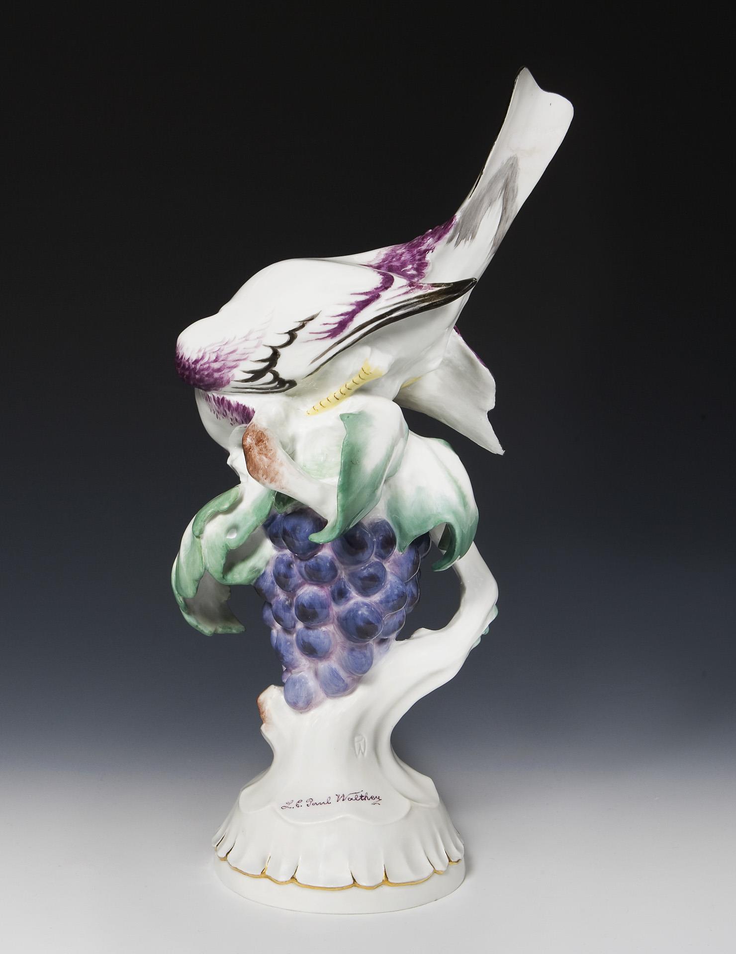 Modell-Jahr: 1920, farbig bemalt, gold staffierter Sockel. Ritzmarke, Pressmarke: von 11 Urstücken Nr. 8, Schwertermarke, Künstler-Signet: PW, handschriftliches Künstler-Signet: L C. Paul Walther (Louis Clemens Paul Walther). 1918 wurde die Herstellung von Urstücken (Künstler-Exemplare) eingeführt. Die Ausformung und Staffierung dieser Exemplare wurde vom Künstler selbst überwacht oder nochmals überarbeitet. Daher sind Urstücke meist vom Künstler in Überglasurfarbe signiert. Schwanzfeder, ein Flügel restauriert, ein Flügel minimal bestoßen.