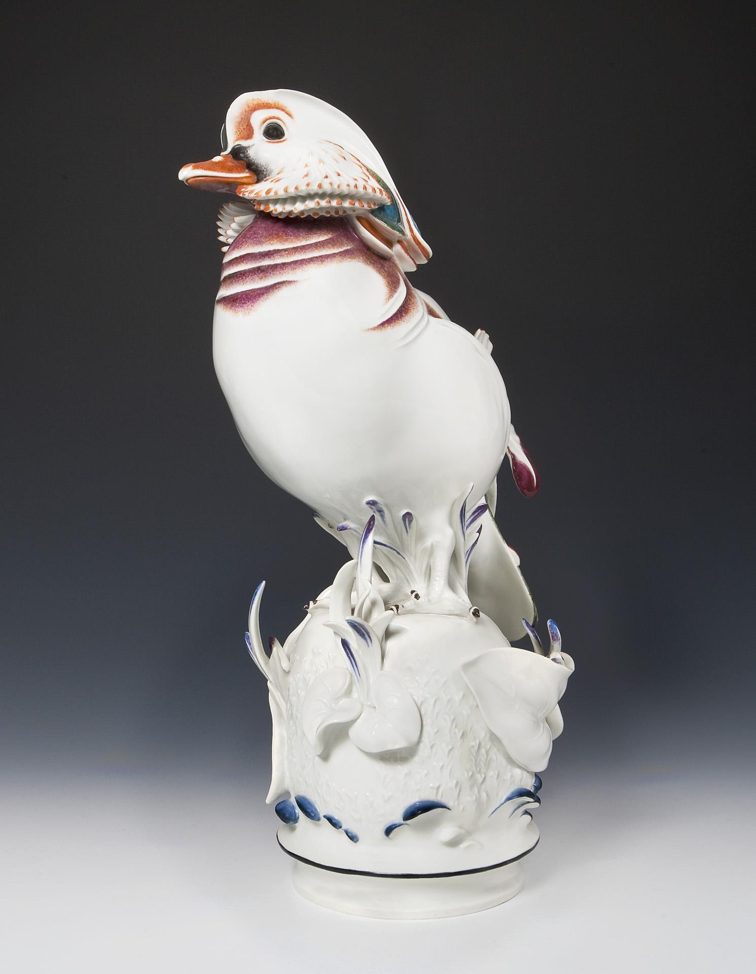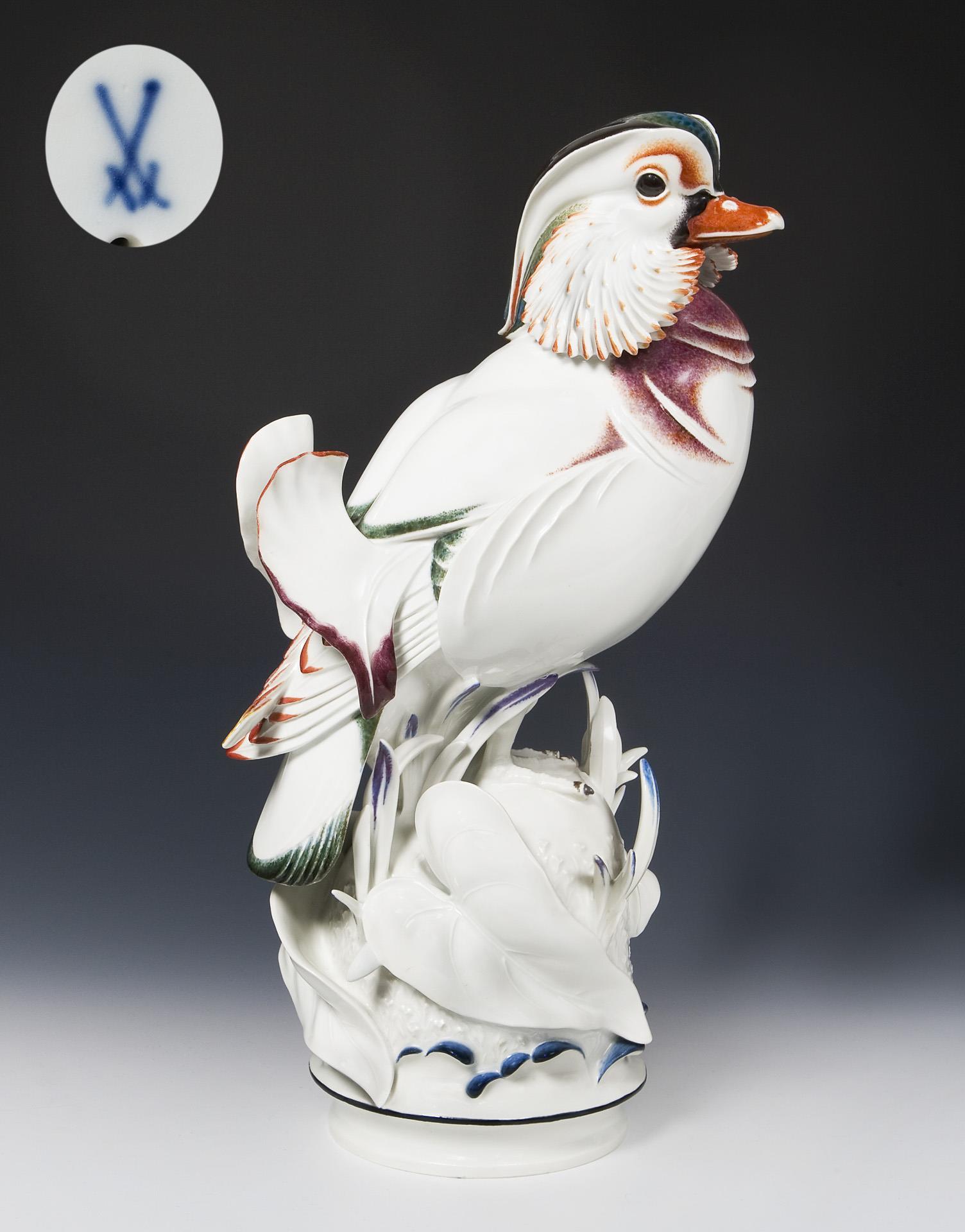 Art déco-Tierfigur: Mandarinente auf Blattsockel. Meissen.