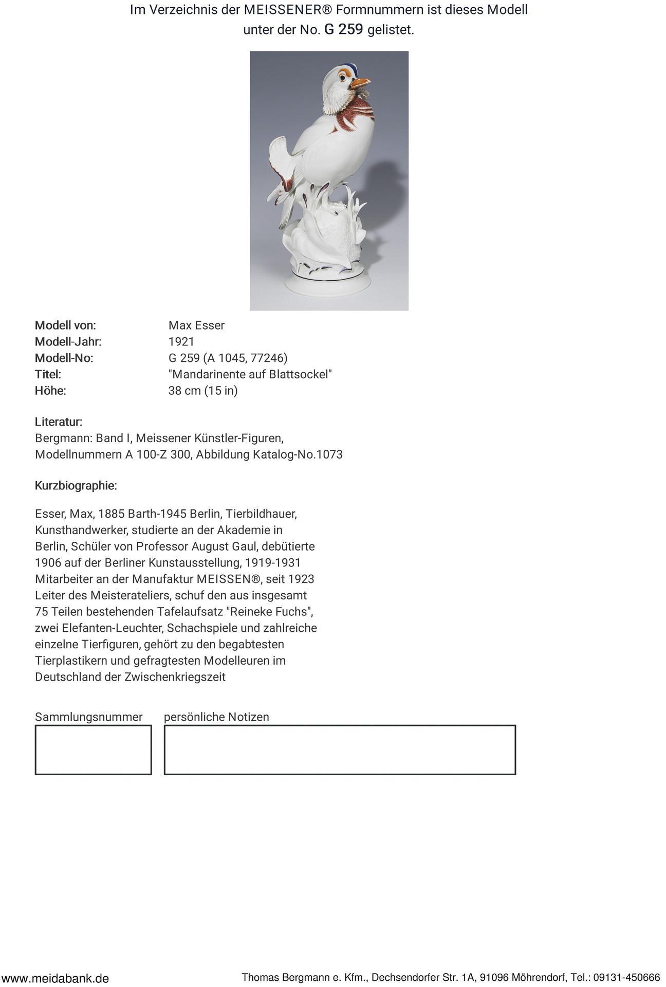 Esser, Tierbildhauer, Kunsthandwerker, studierte an der Akademie in Berlin. 1919-1931 Mitarbeiter an der Manufaktur Meissen, seit 1923 Leiter des Meisterateliers. Meissen-Manufaktur-Preis: 10.500,- Euro * Partnerauktion Bergmann.