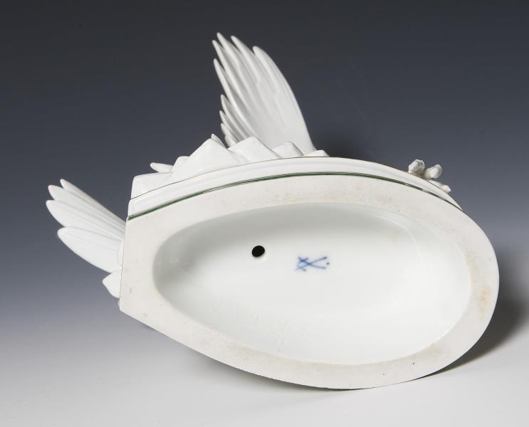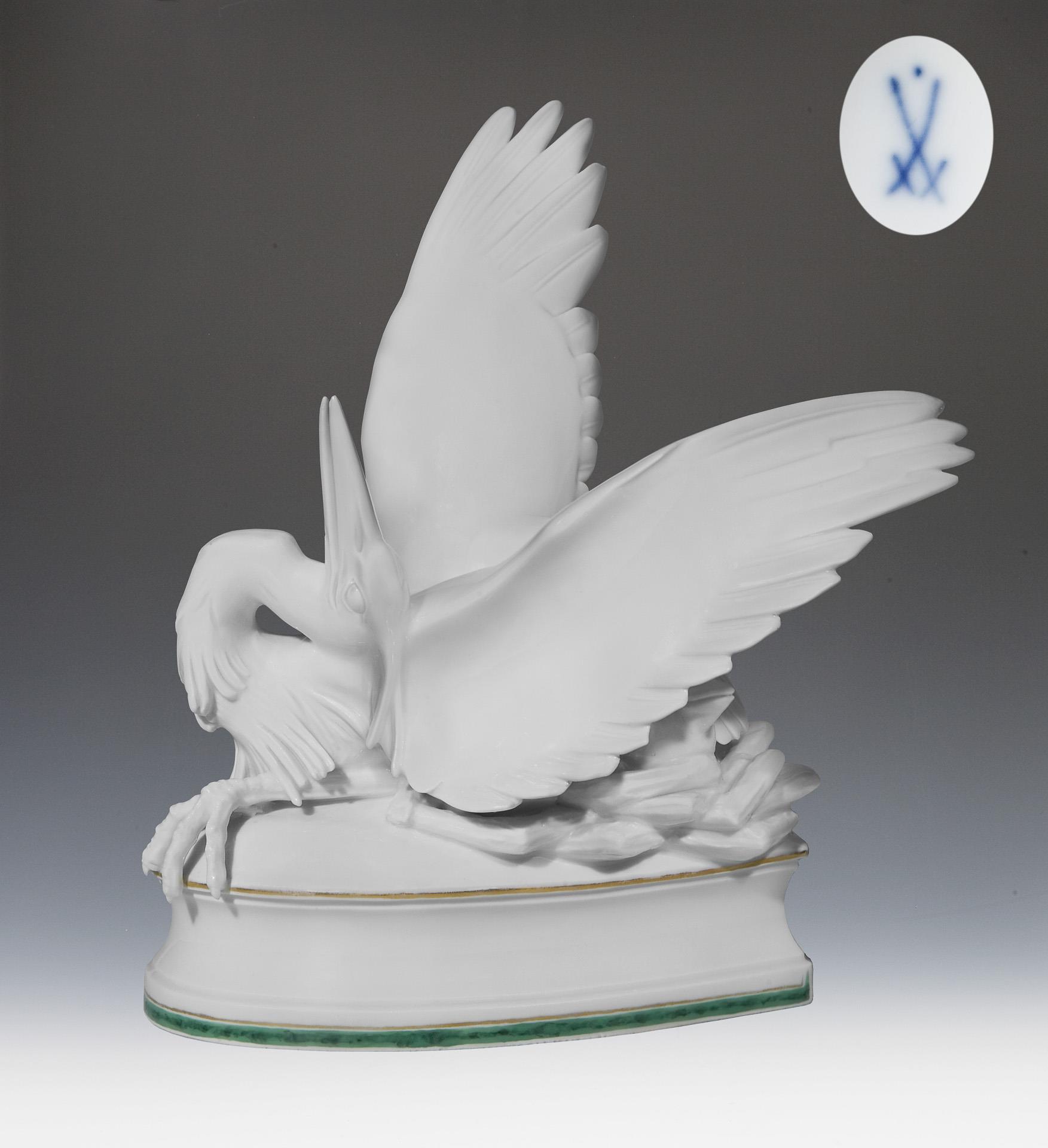 Modell-Jahr: 1927, Weißporzellan, grün-gold staffierter Rand. Ritzmarke, Pressmarke, Schwertermarke mit Punkt. Zwei Krallen, eine kleine Flügelspitze, eine kleine Jungvogel-Schnabelspitze restauriert, minimale Brandrisse.
