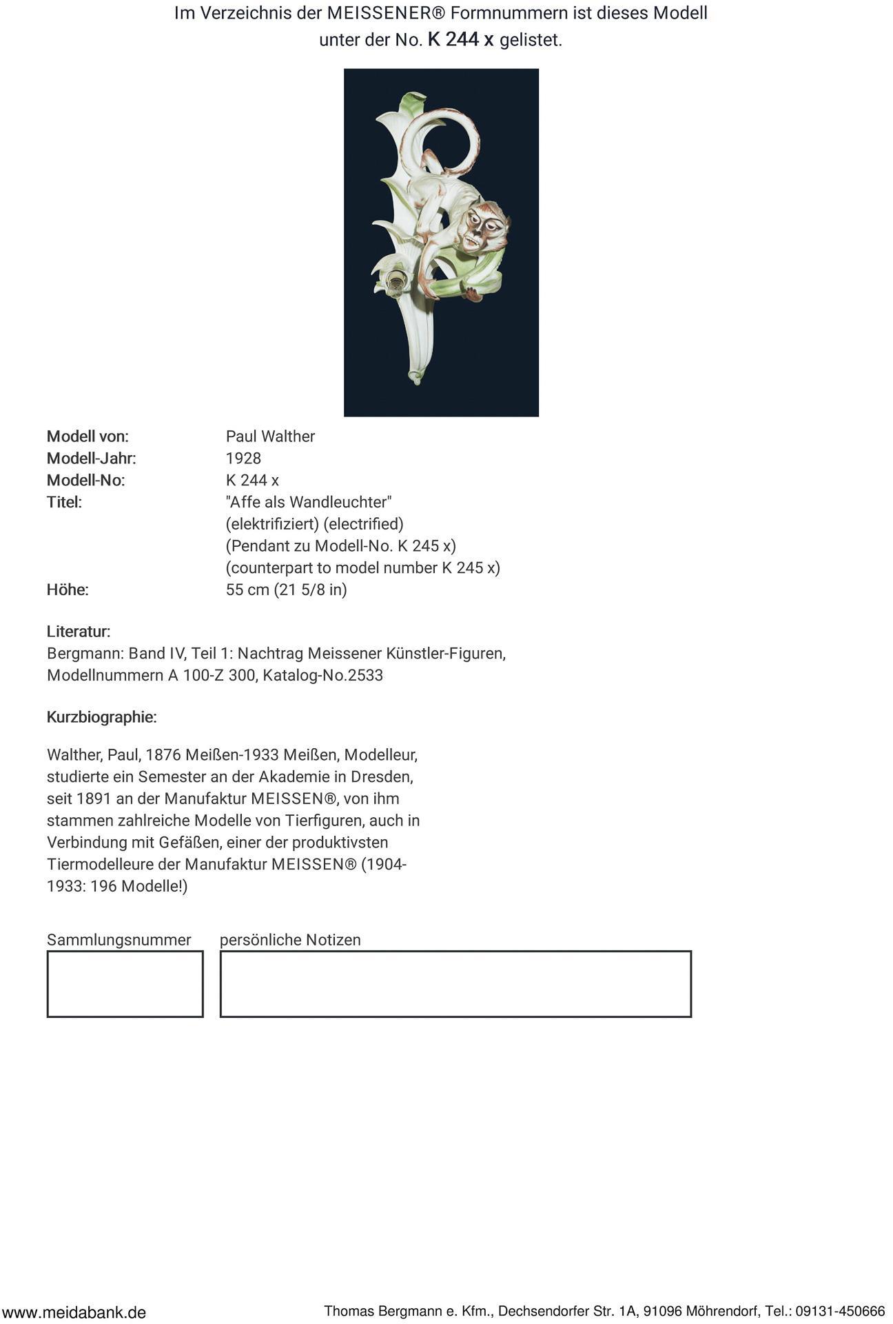 Walther, Modelleur, seit 1891 an der Manufaktur. Von ihm stammen zahlreiche Modelle von Tierfiguren, auch in Verbindung mit Gefäßen, einer der produktivsten Tiermodelleure * Partnerauktion Bergmann.