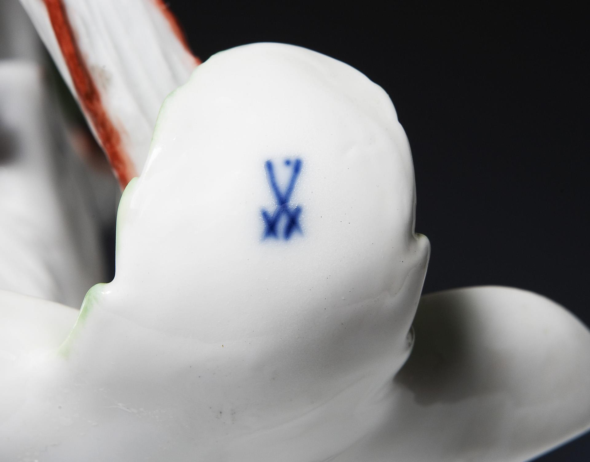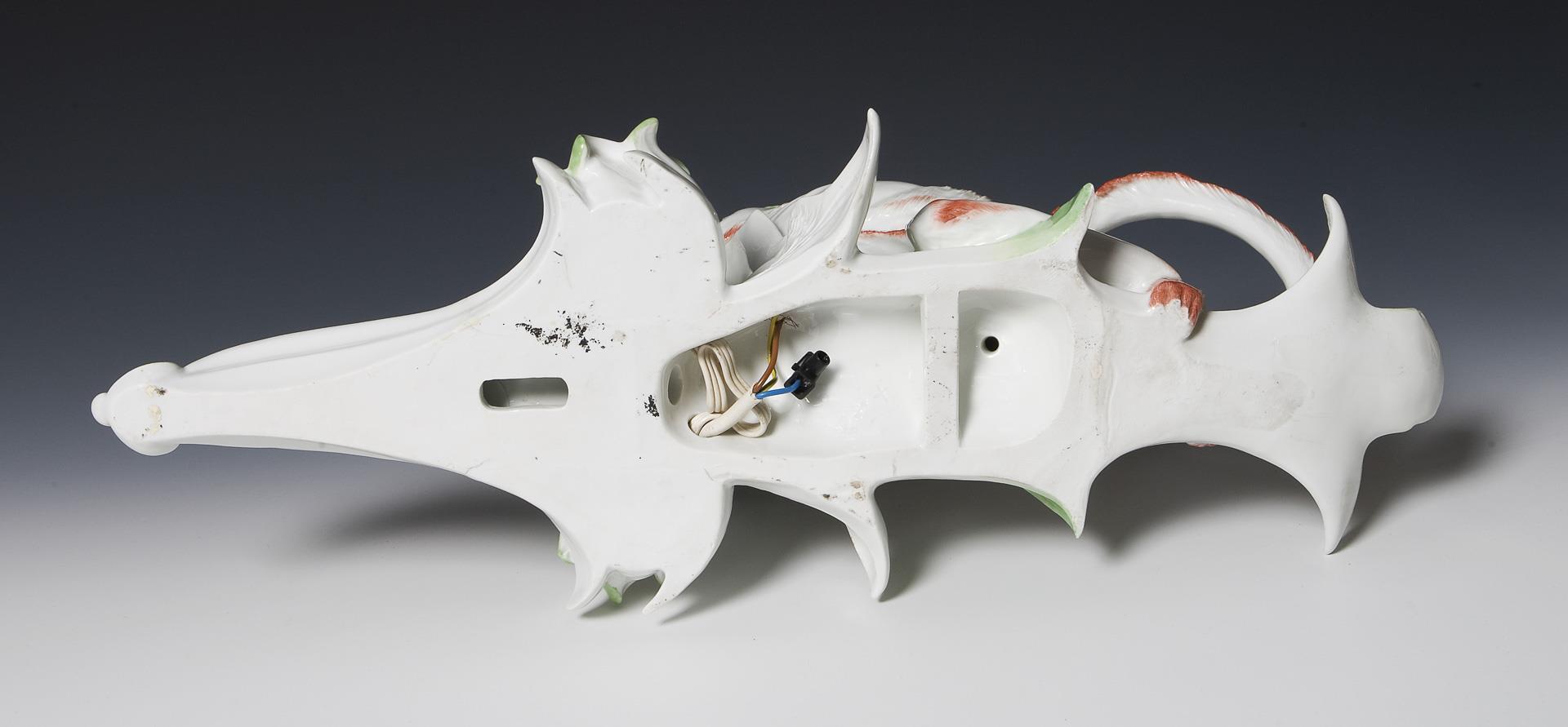 Modell-Jahr: 1928, Pendant zu Modell-Nr. K 245 x. Farbig bemalt, elektrifiziert, unglasierter Boden, Ritzmarke, Pressmarke, Schwertermarke mit Punkt. Die alte Elektrifizierung muss erneuert werden, zwei Blätter oben, eine Hand mit der Bananenschalenspitze restauriert, kleiner Glasurdefekt an der unteren Spitze, kleine Brandrisse.
