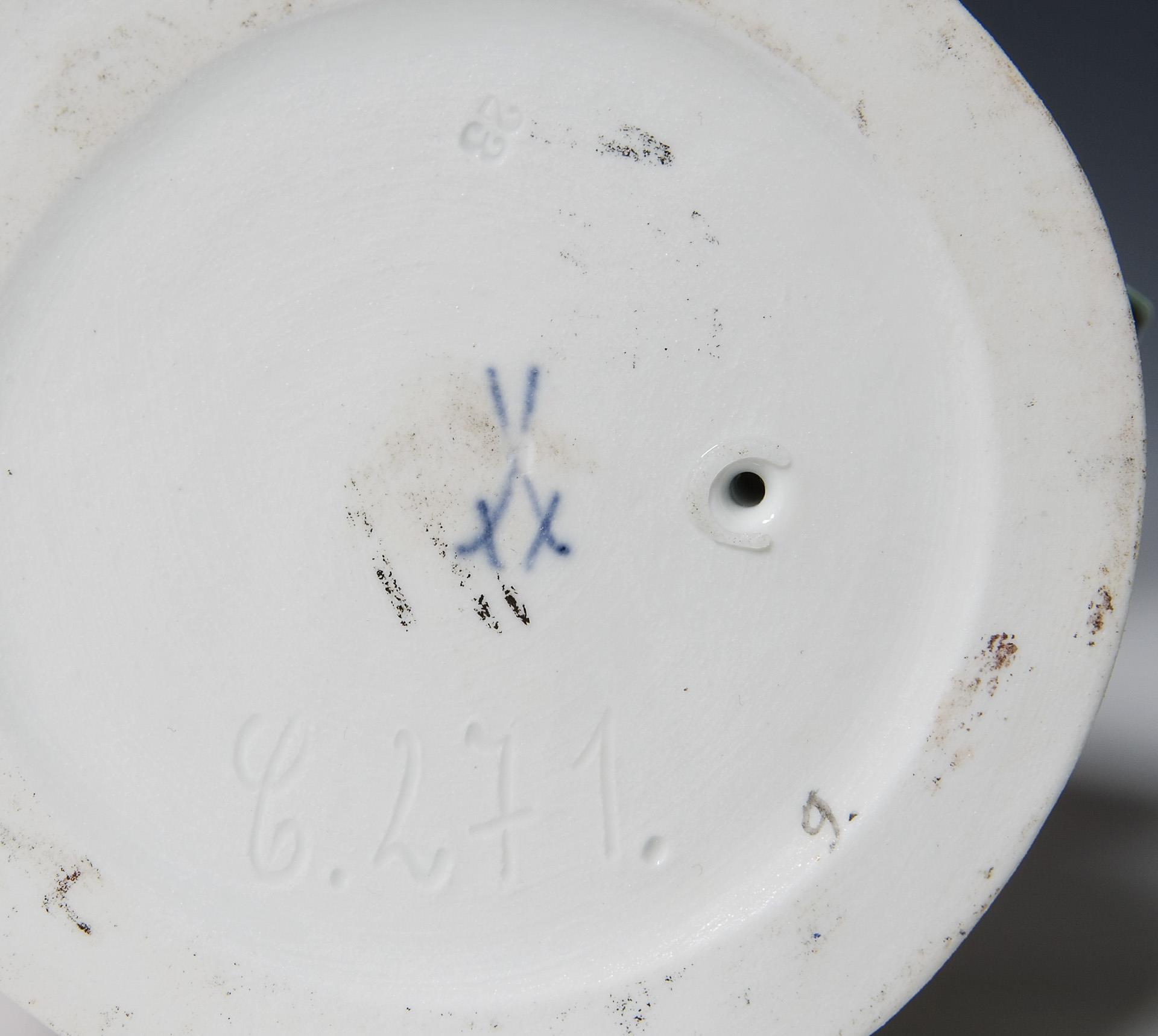 Modell-Jahr: 1912, aus einer Serie von 9 Figuren. Farbig bemalt, gold staffiert. Unglasierter Boden mit glasierten Flecken, Ritzmarke, Pressmarke, Malermarke, Schwertermarke mit kleinem Glasurpunkt, undeutliches Künstler-Signet.