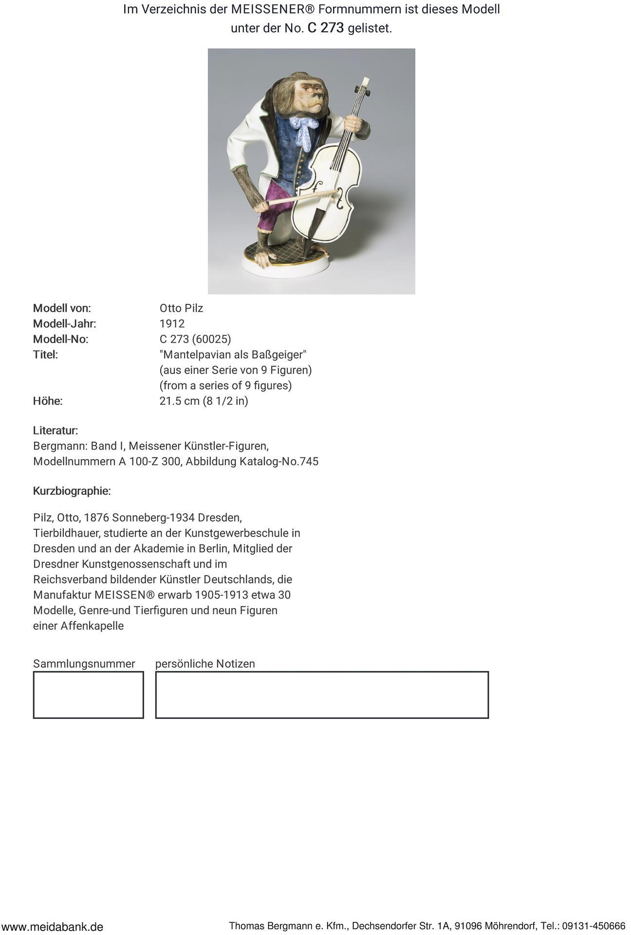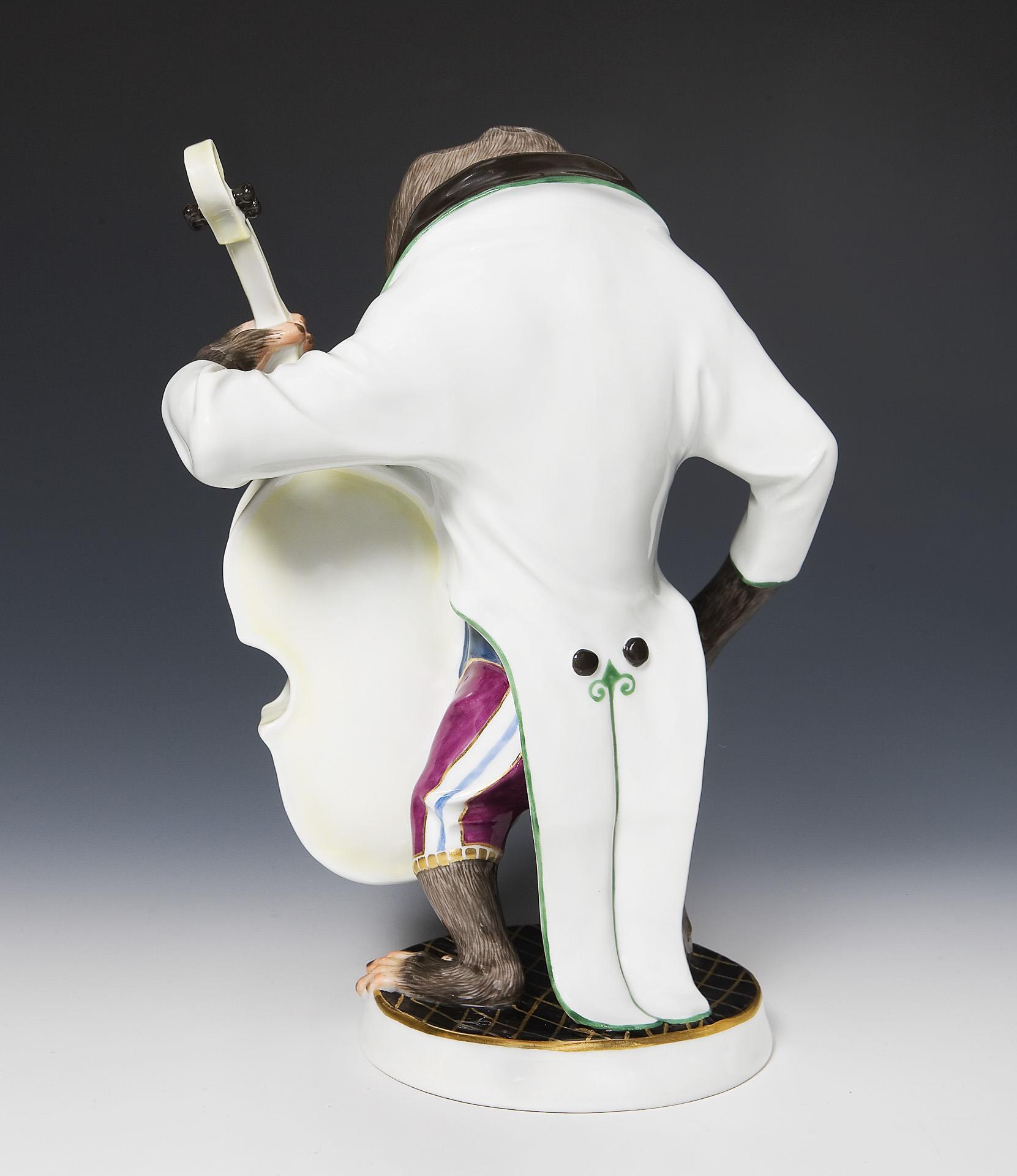 Jugendstil-Figur der Affenkapelle: Mantelpavian als Bassgeiger. Meissen.