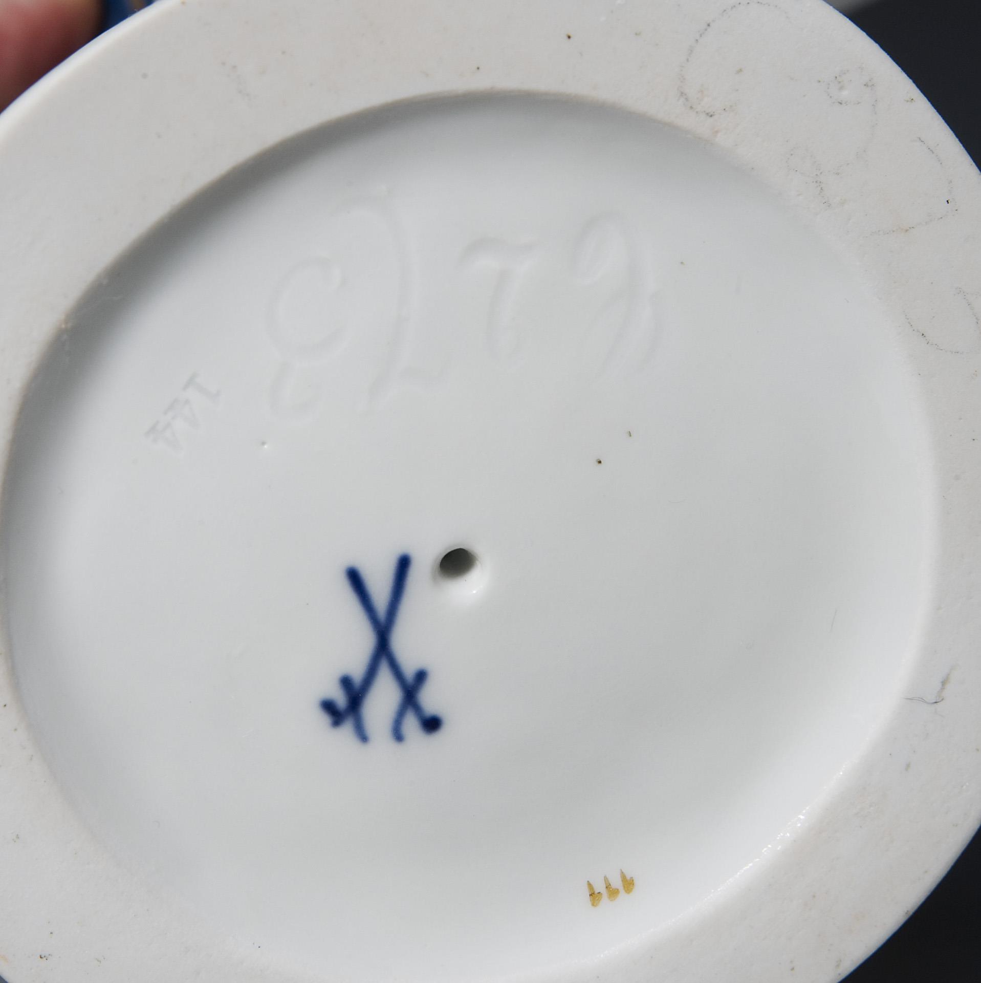 Modell-Jahr: 1912, aus einer Serie von 9 Figuren. Farbig bemalt, gold staffiert. Ritzmarke, Pressmarke, Malermarke, Schwertermarke.