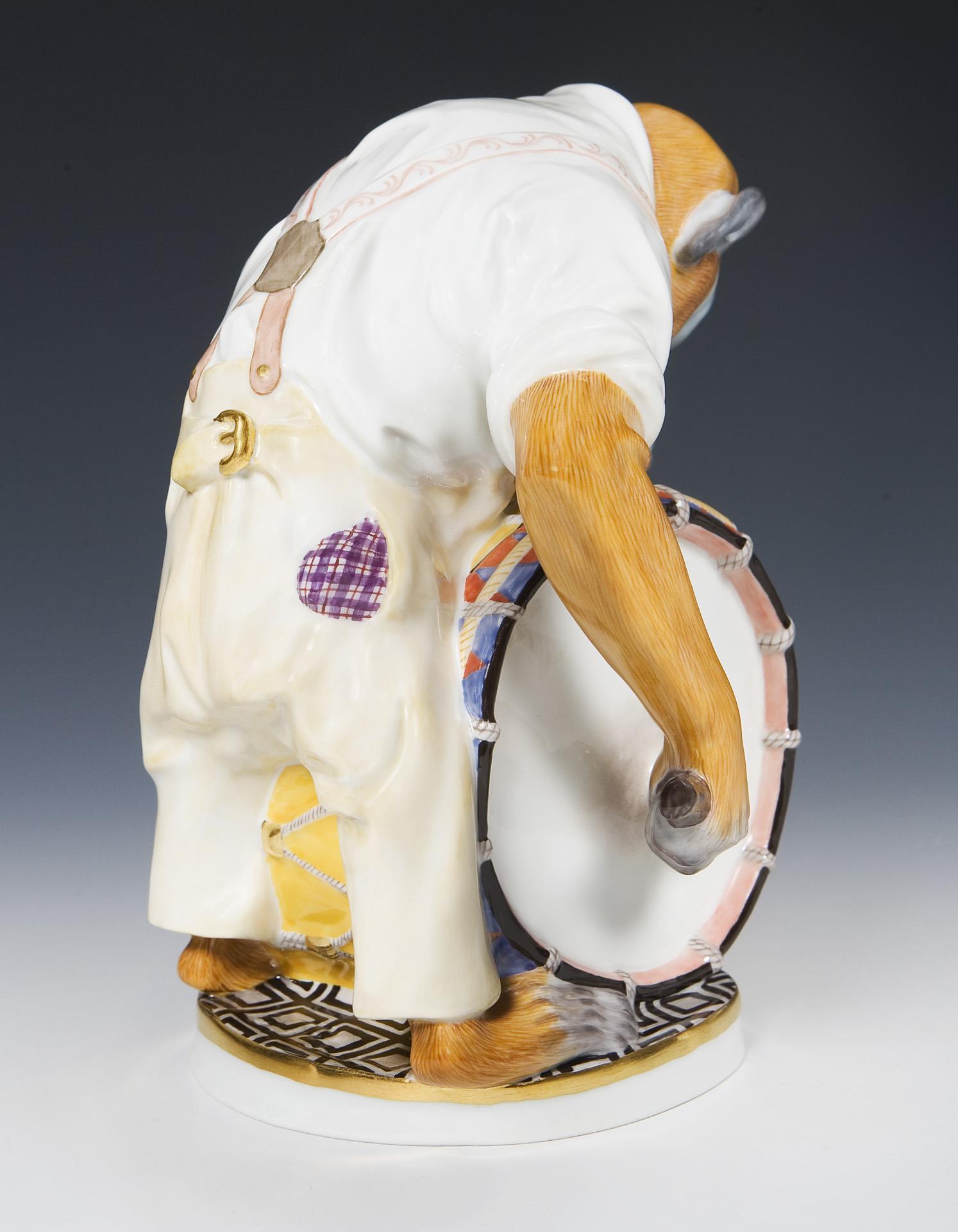 Figur der Affenkapelle: Rhesusaffe als Paukenschläger. Meissen.