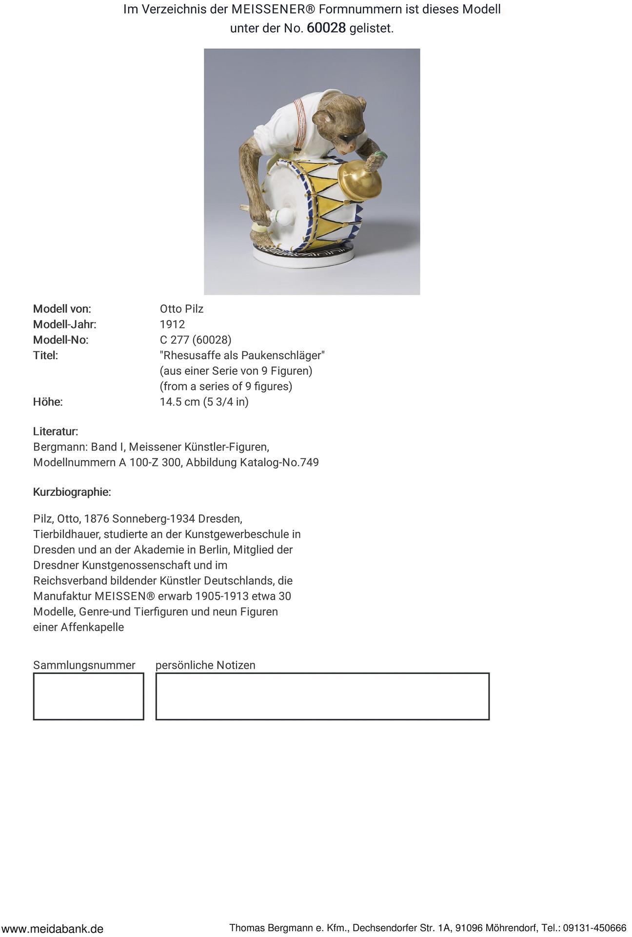 Pilz, Tierbildhauer, studierte an der Akademie in Berlin. Die Manufaktur Meissen erwarb 1905-1913 etwa 30 Modelle. Meissen-Manufaktur-Preis: 7490,- Euro * Partnerauktion Bergmann.