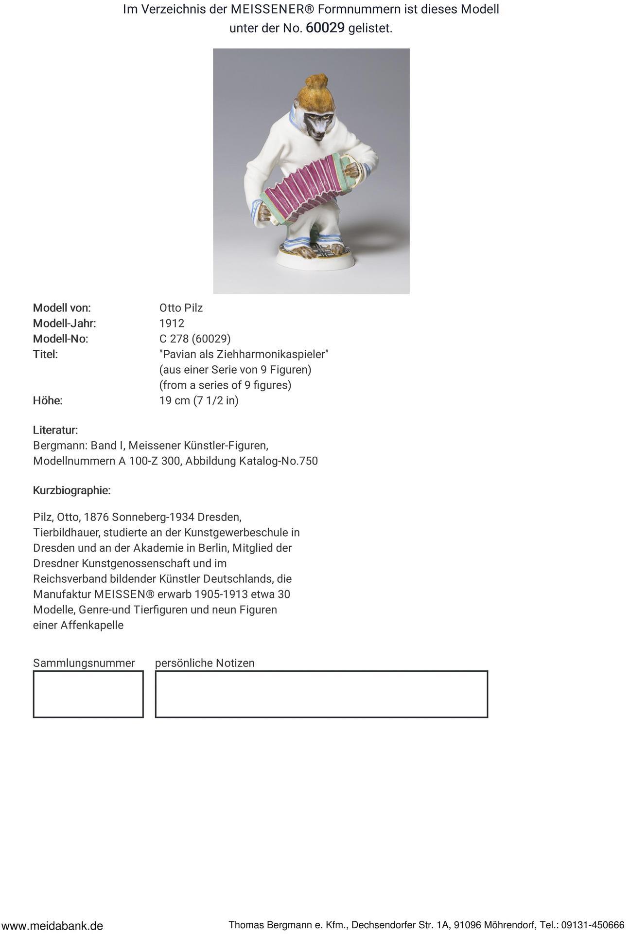 Pilz, Tierbildhauer, studierte an der Akademie in Berlin. Die Manufaktur Meissen erwarb 1905-1913 etwa 30 Modelle. Meissen-Manufaktur-Preis: 7490,- Euro * Partnerauktion Bergmann.