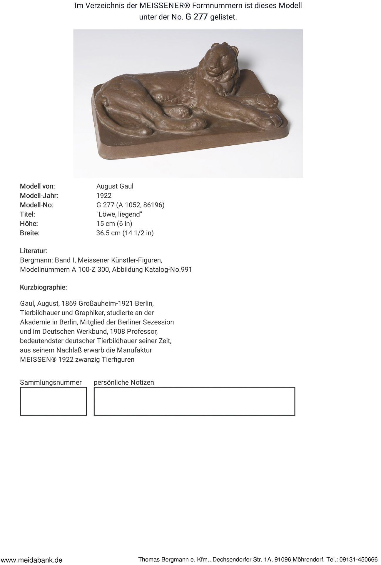 Gaul, Tierbildhauer und Graphiker, studierte an der Akademie in Berlin. Meisterschüler von Reinhold Begas, 1908 Professor. Bedeutendster deutscher Tierbildhauer seiner Zeit. Meissen-Manufaktur-Preis: 1690,- Euro * Partnerauktion Bergmann.