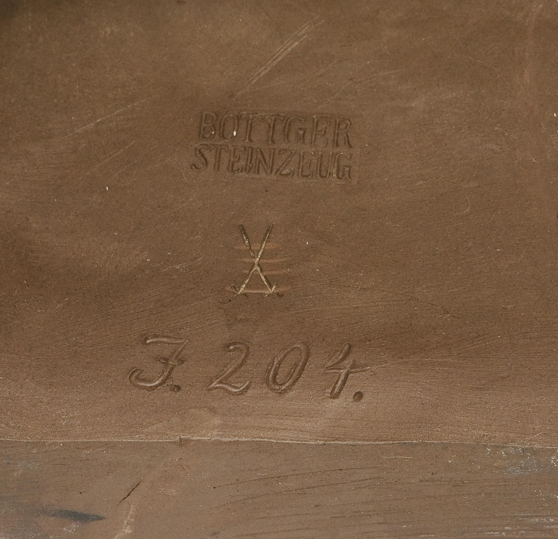 Modell-Jahr: 1922, Böttgersteinzeug, Ritzmarken, Pressmarken, Schwertermarken viermal gestrichen. Seitlich keilförmige sichtbare Restaurierung, Länge: circa 13 cm, Sockelrand bestoßen, rückseitig restaurierter Brandriss.