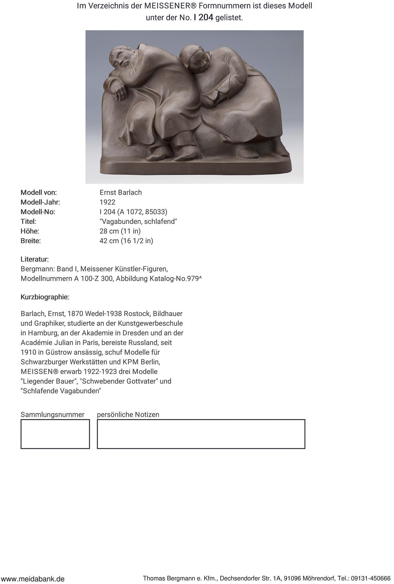 Barlach, Bildhauer, Zeichner, Graphiker, studierte an der Akademie in Dresden. Meisterschüler von Robert Diez, seit 1897 freischaffend tätig, bereiste Russland. Ab 1910 regelmäßig auf den Ausstellungen der Berliner Sezession vertreten. Meissen-Manufaktur-Preis: 6990,- Euro * Partnerauktion Bergmann.