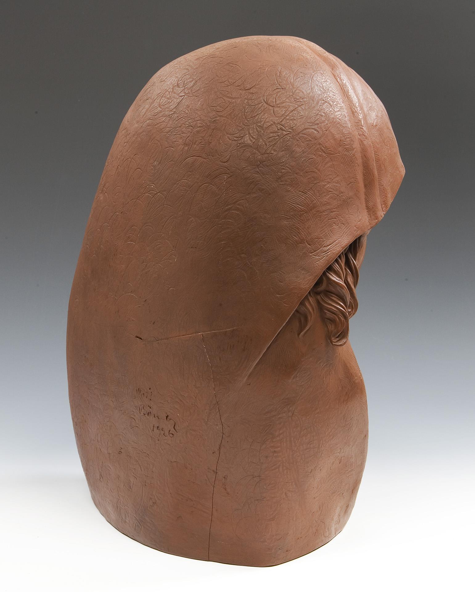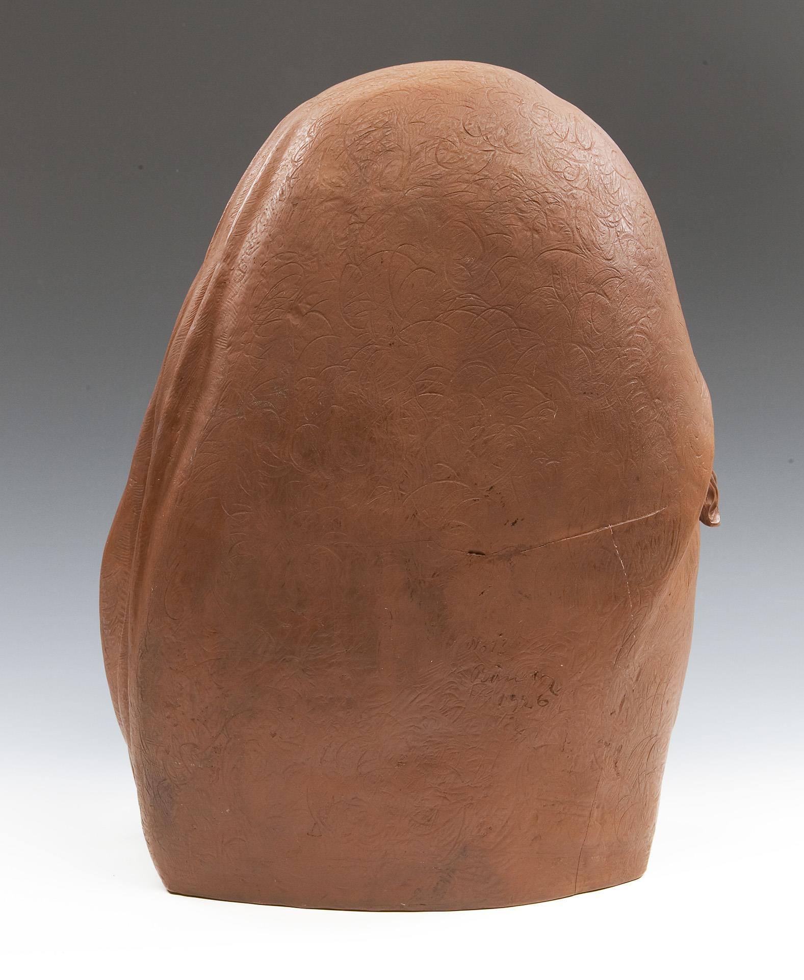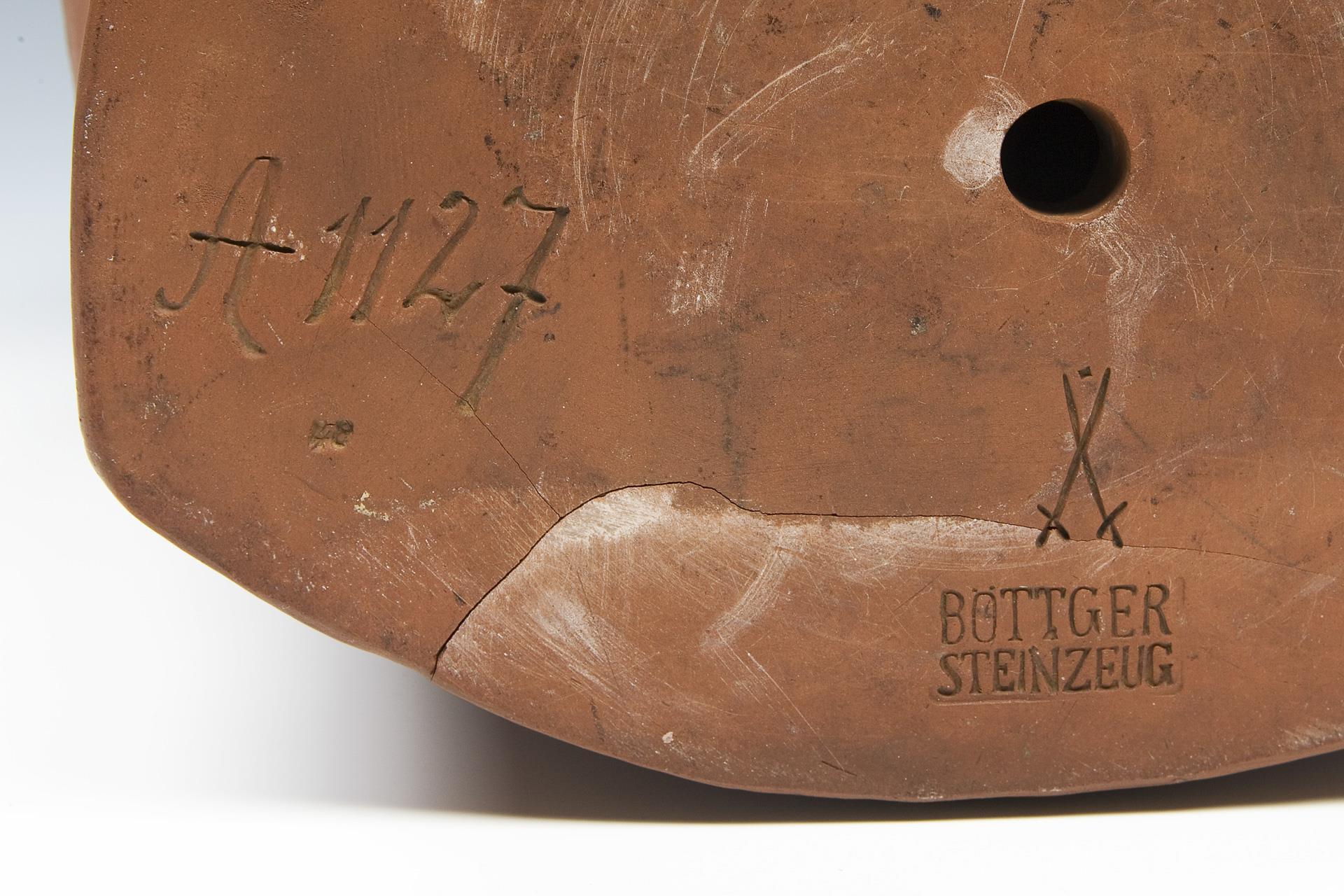 Modell-Jahr: 1925, Böttgersteinzeug, Ritzmarke, Pressmarke, Schwertermarke mit Punkt, Künstler-Signet, rückseitig geritzte Signatur, datiert: 1926, nummeriert: 13. Rückseitig vertikaler Riss, Länge: circa 17 cm, horizontaler Riss, Länge: circa 10 cm, minimal bestoßen, im Boden Riss, Länge: circa 9 cm.