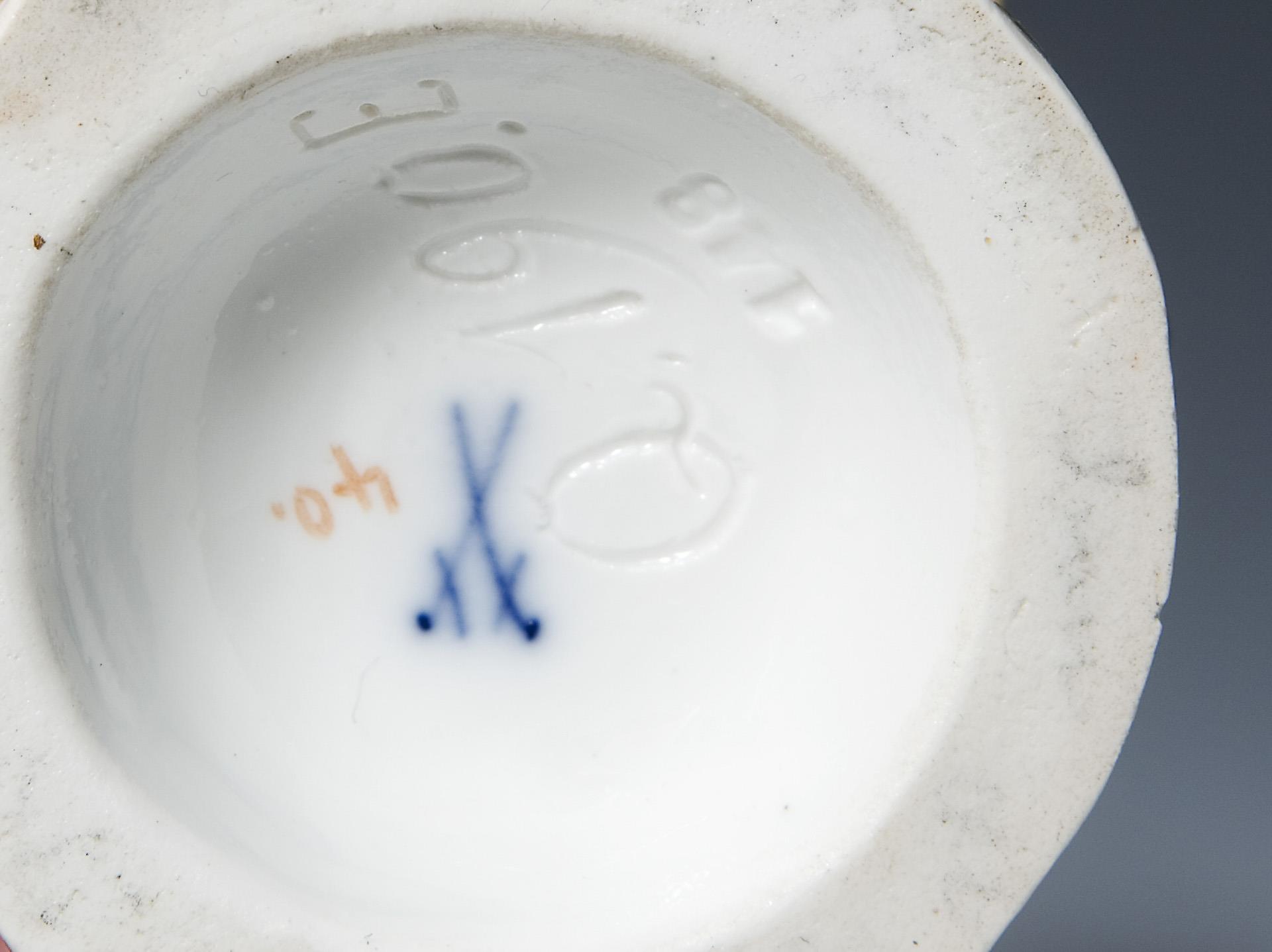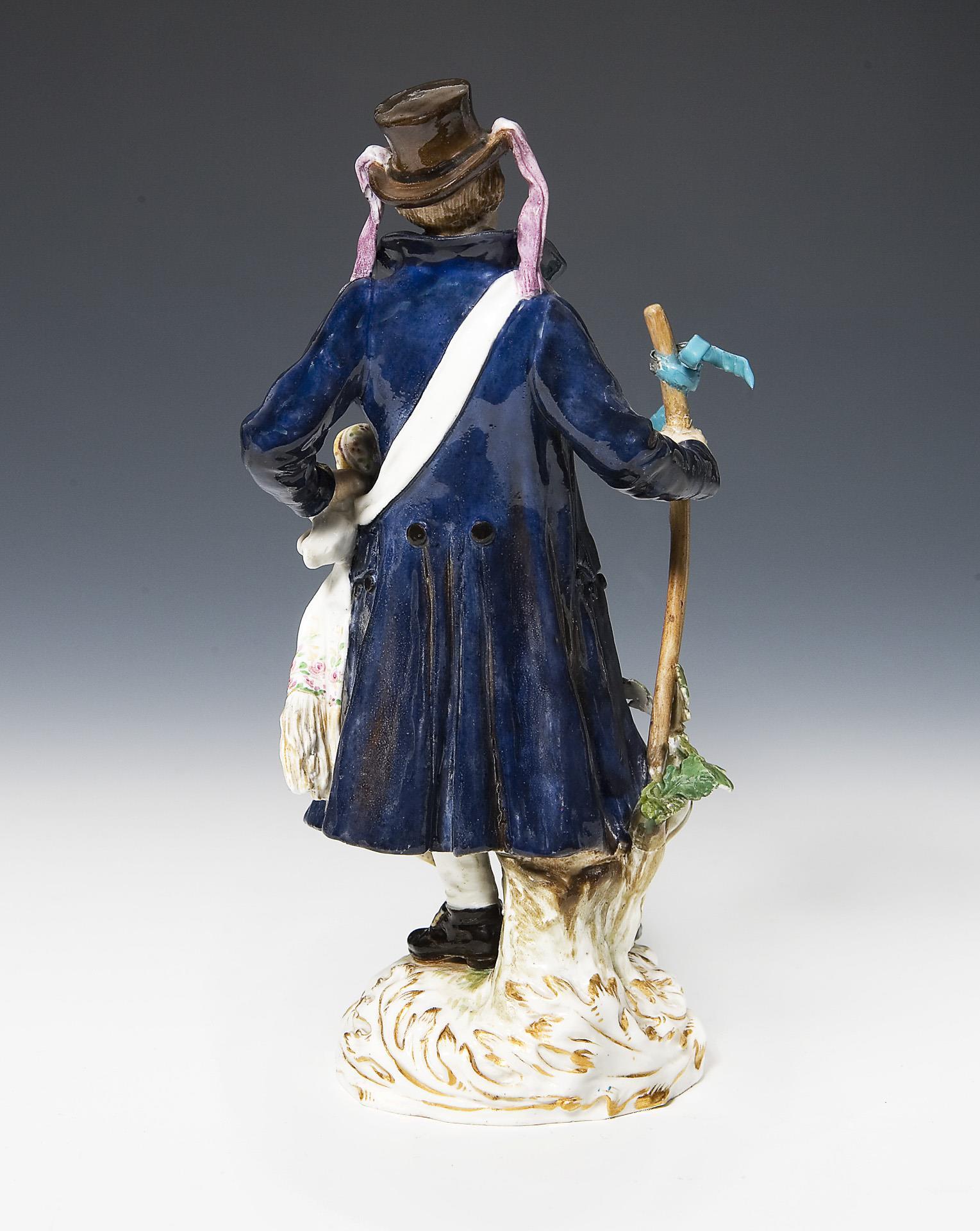 Modell-Jahr: 1897-1898, aus einer Serie von 25 Figuren. Farbig bemalt, gold staffiert, Ritzmarke, Pressmarke, Malermarke, Schwertermarke,. Stabspitze mit Schleife, einige Blätter, eine Mantelecke, vordere Hutkrempe restauriert, einige Blätter bestoßen.