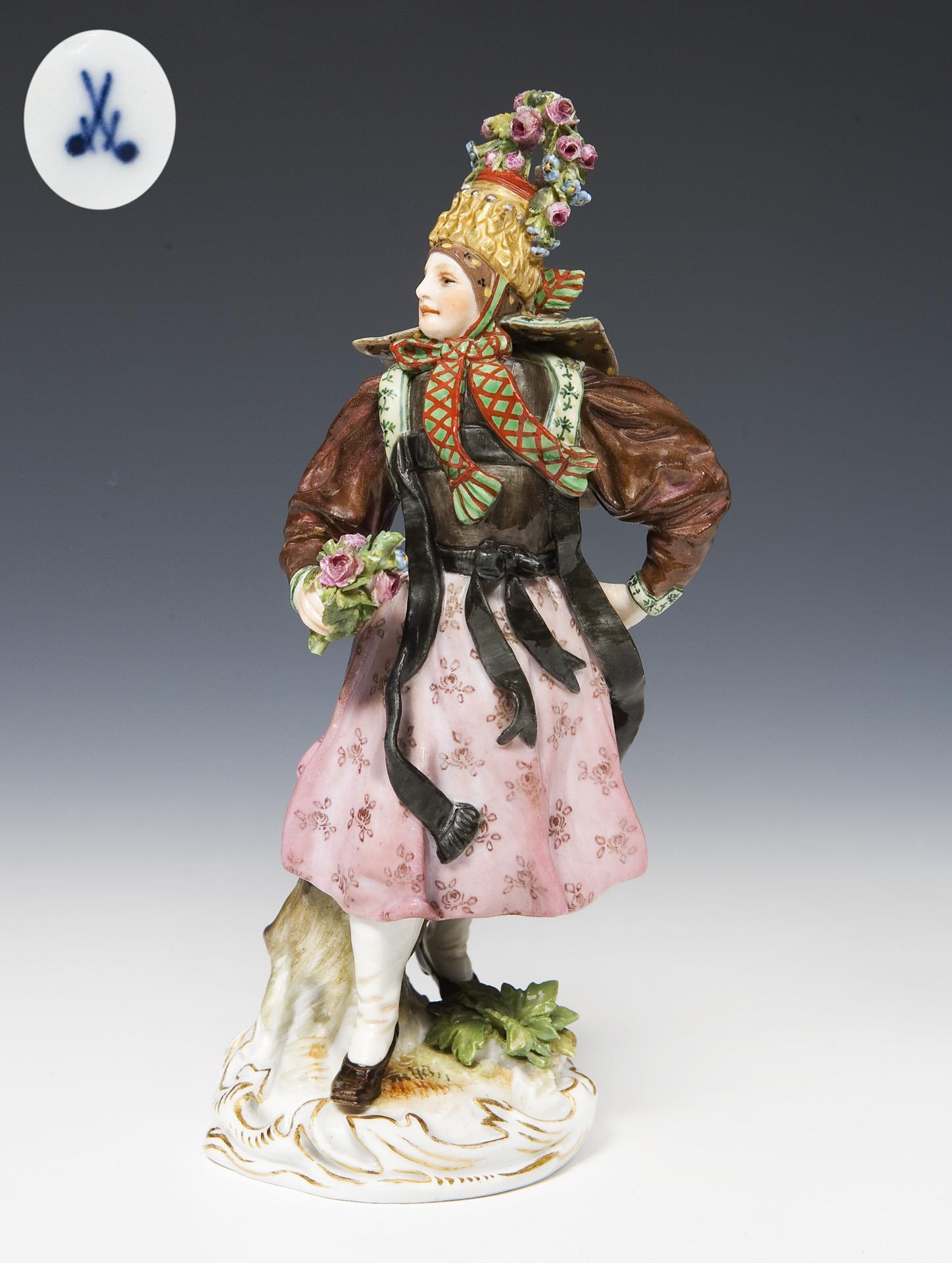 Modell-Jahr: 1897-1898, aus einer Serie von 25 Figuren. Farbig bemalt, gold staffiert, Ritzmarke, Pressmarke, Malermarke, Schwertermarke. Eine Rockecke, weinige Blättchen bestoßen, ein Handgelenk restauriert.