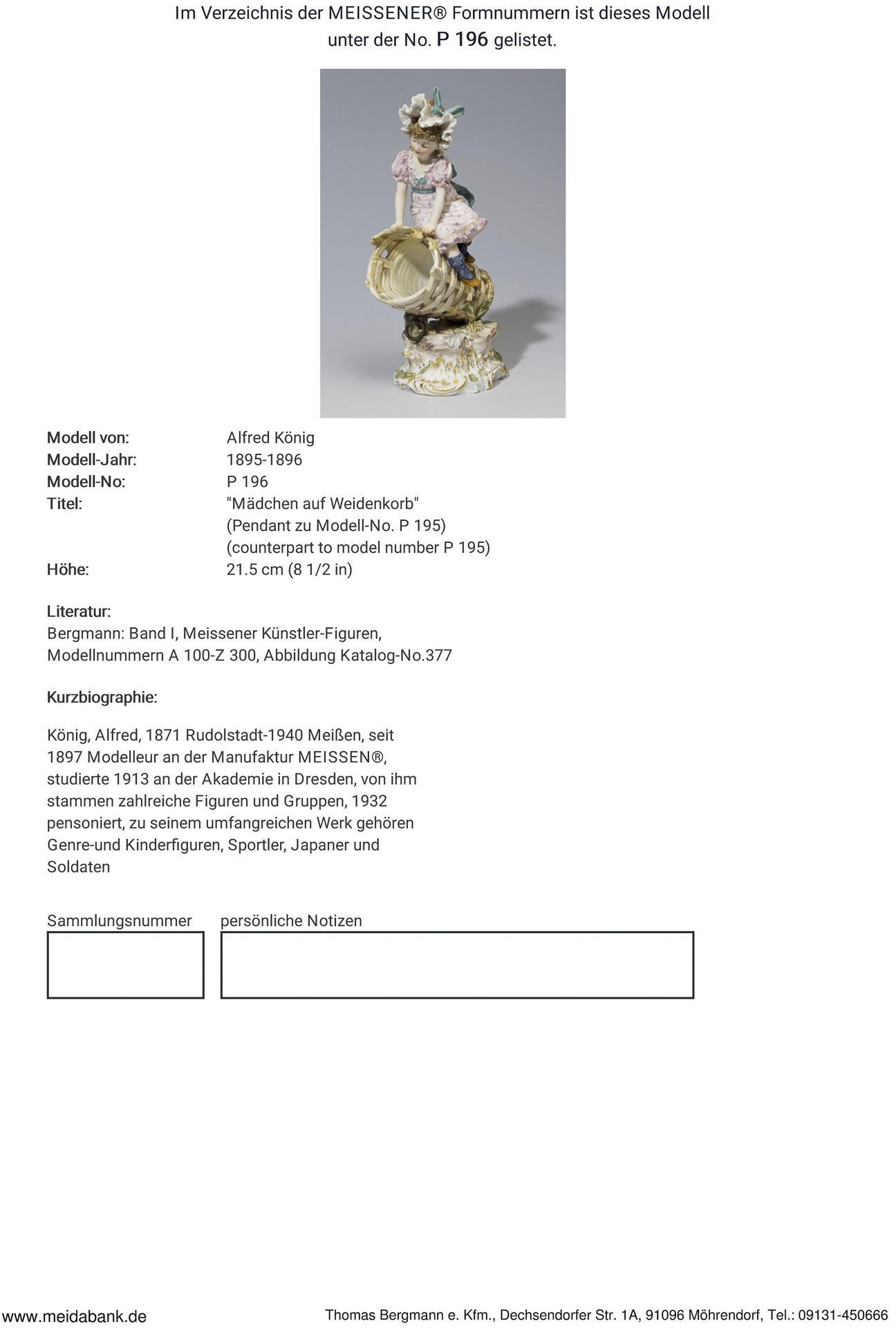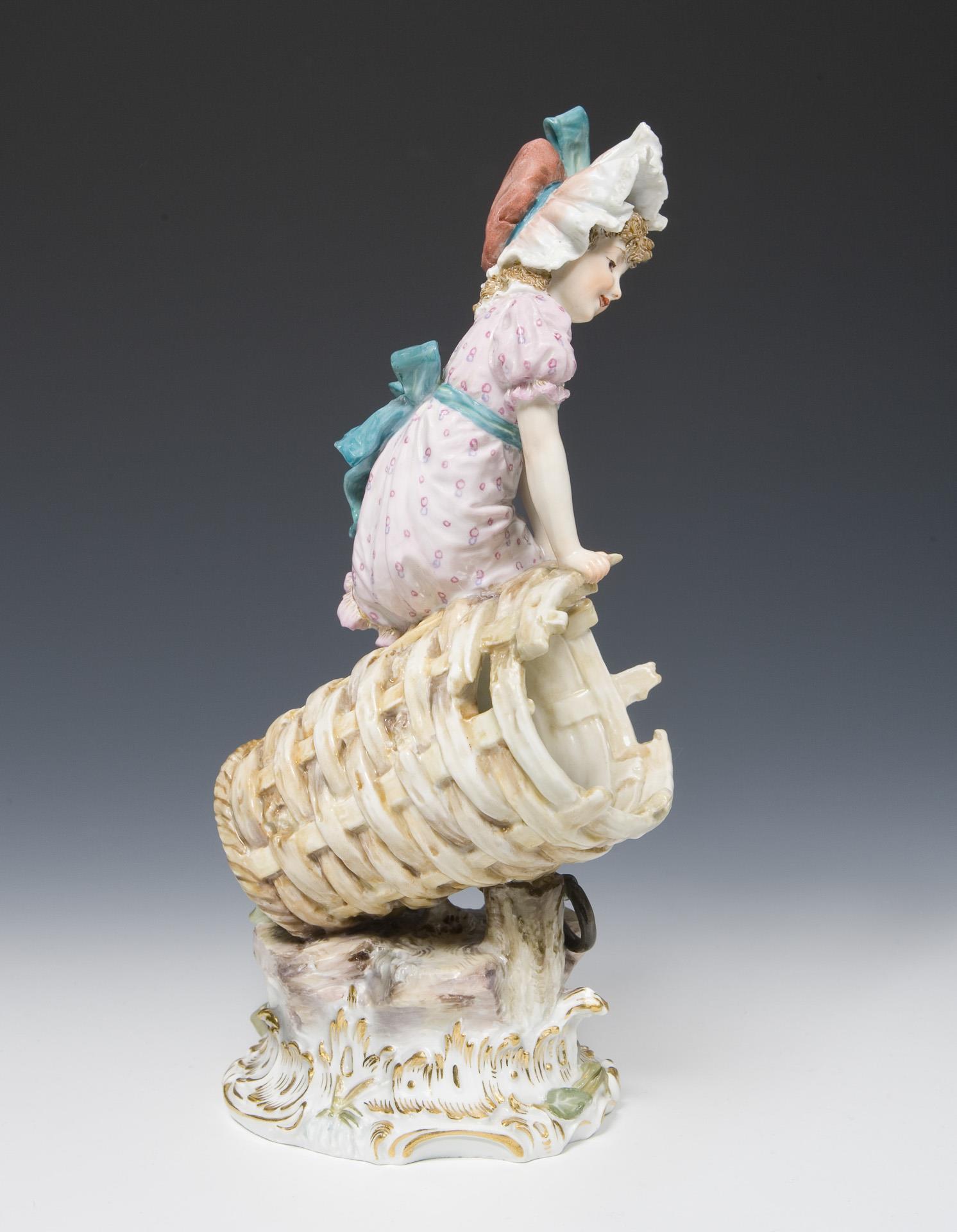 Modell-Jahr: 1895-1896, Pendant zu Modell-Nr. P 195 "Knabe auf Weidenkorb". Farbig bemalt, gold staffiert. Ritzmarke, Pressmarke, Malermarke, Schwertermarke. Zwei Schlaufen der Schleifen partiell restauriert.