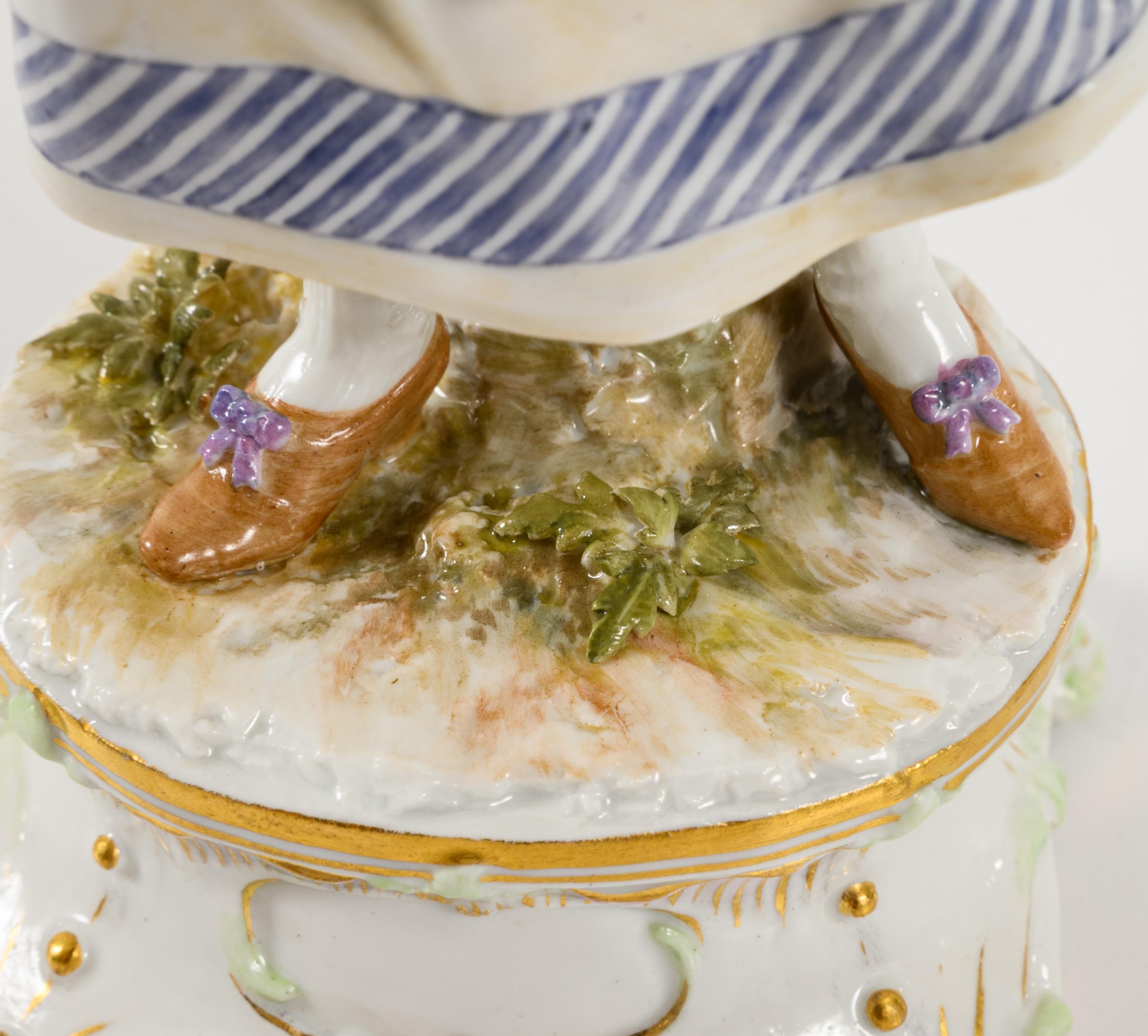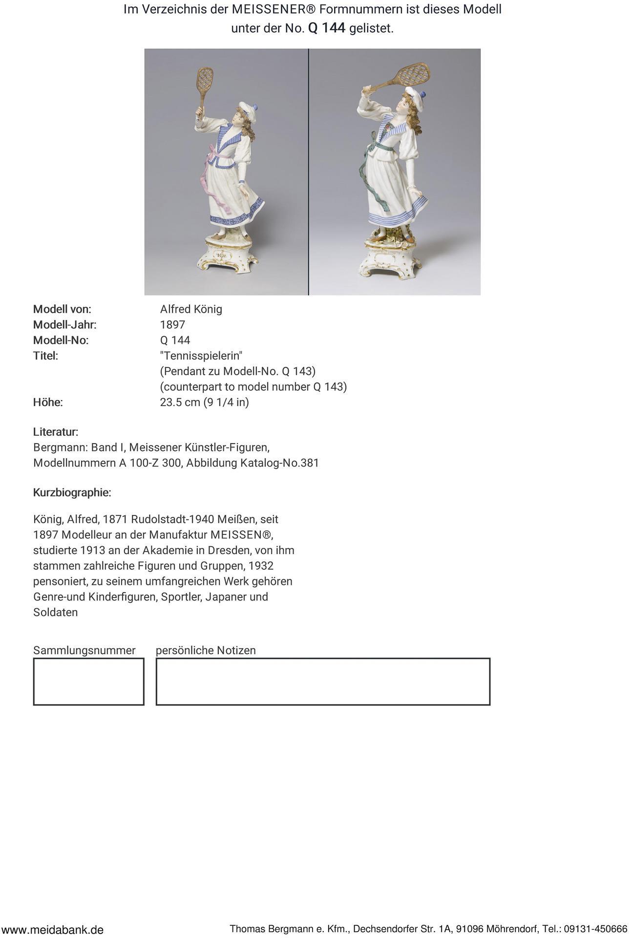 Modell-Jahr: 1897, Pendant zu Modell-Nr. Q 143 "Tennisspieler". Farbig bemalt, gold staffiert, Ritzmarke, Pressmarke, Malermarke, Schwertermarke. Eine Hand, Tennisschläger restauriert, Kleid von unten minimal bestoßen.