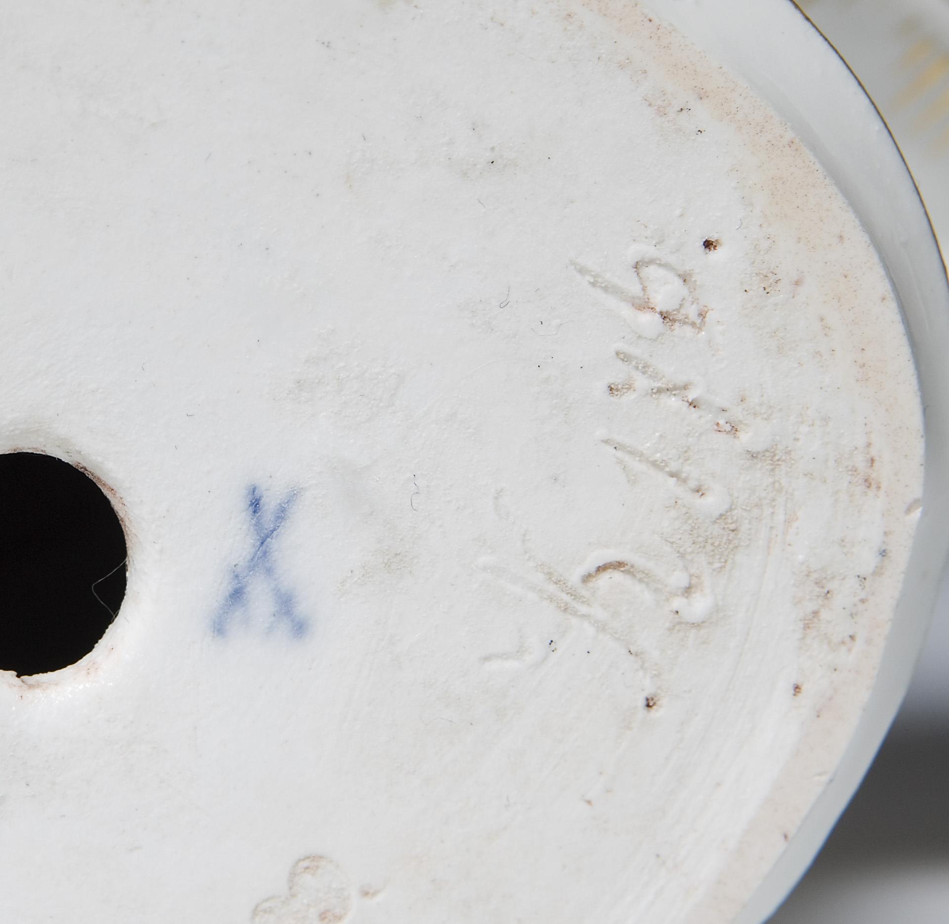 Modell-Jahr: 1876-1877, farbig bemalt, gold staffiert. Unglasierter Boden, Ritzmarke, Pressmarke, Schwertermarke. Eine Blüte bestoßen, drei dunkle Glasurpünktchen.