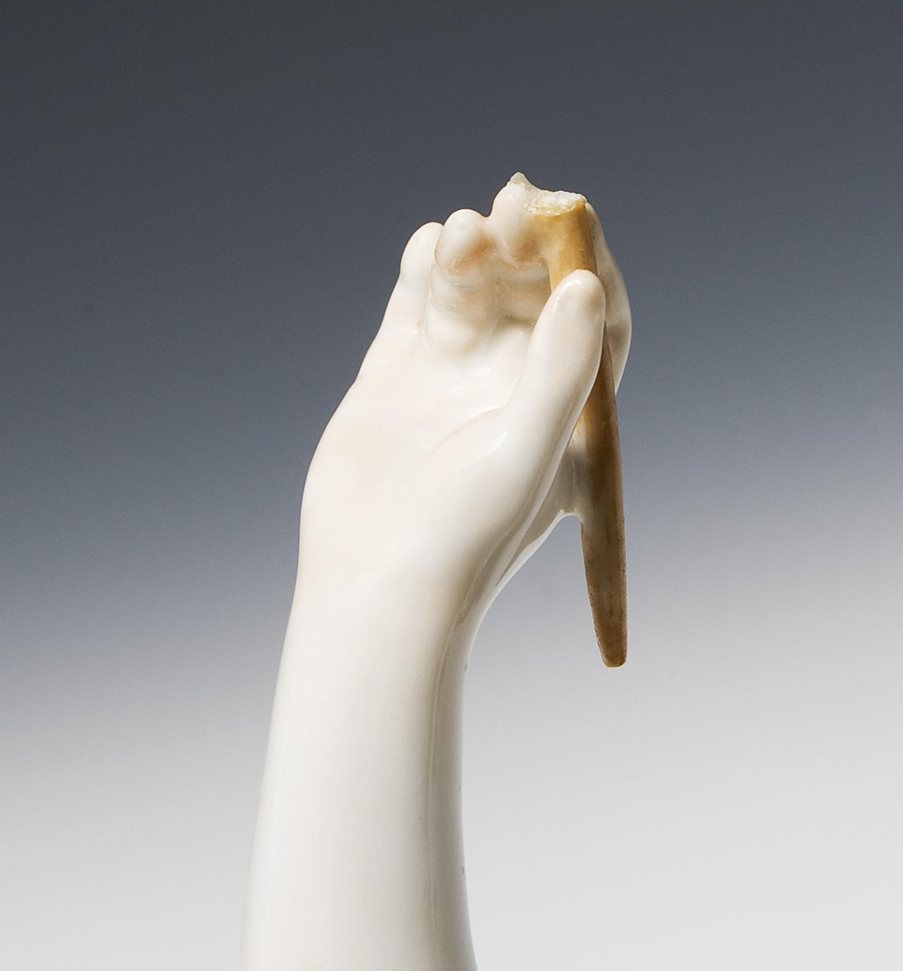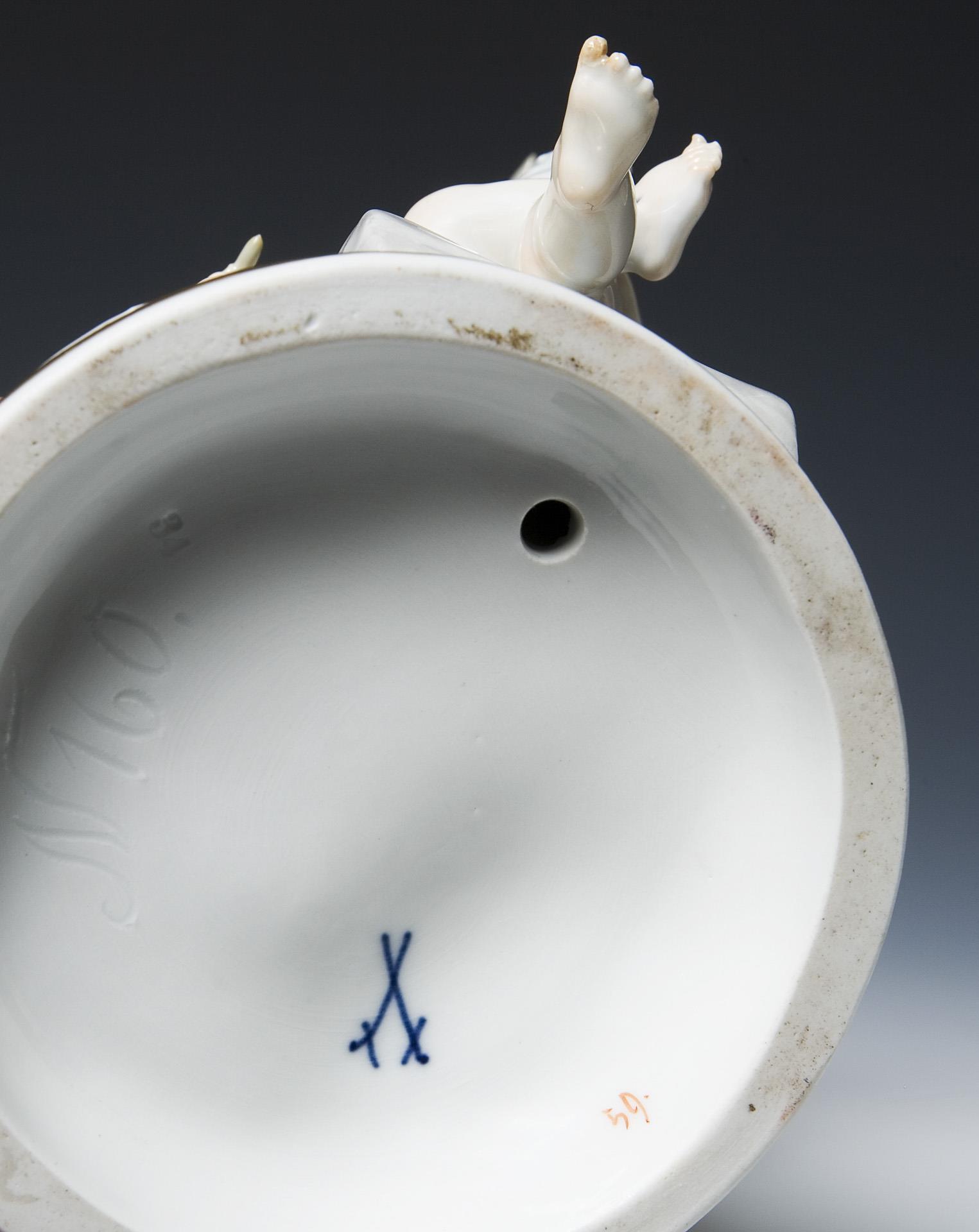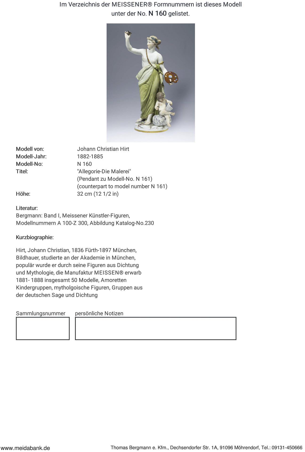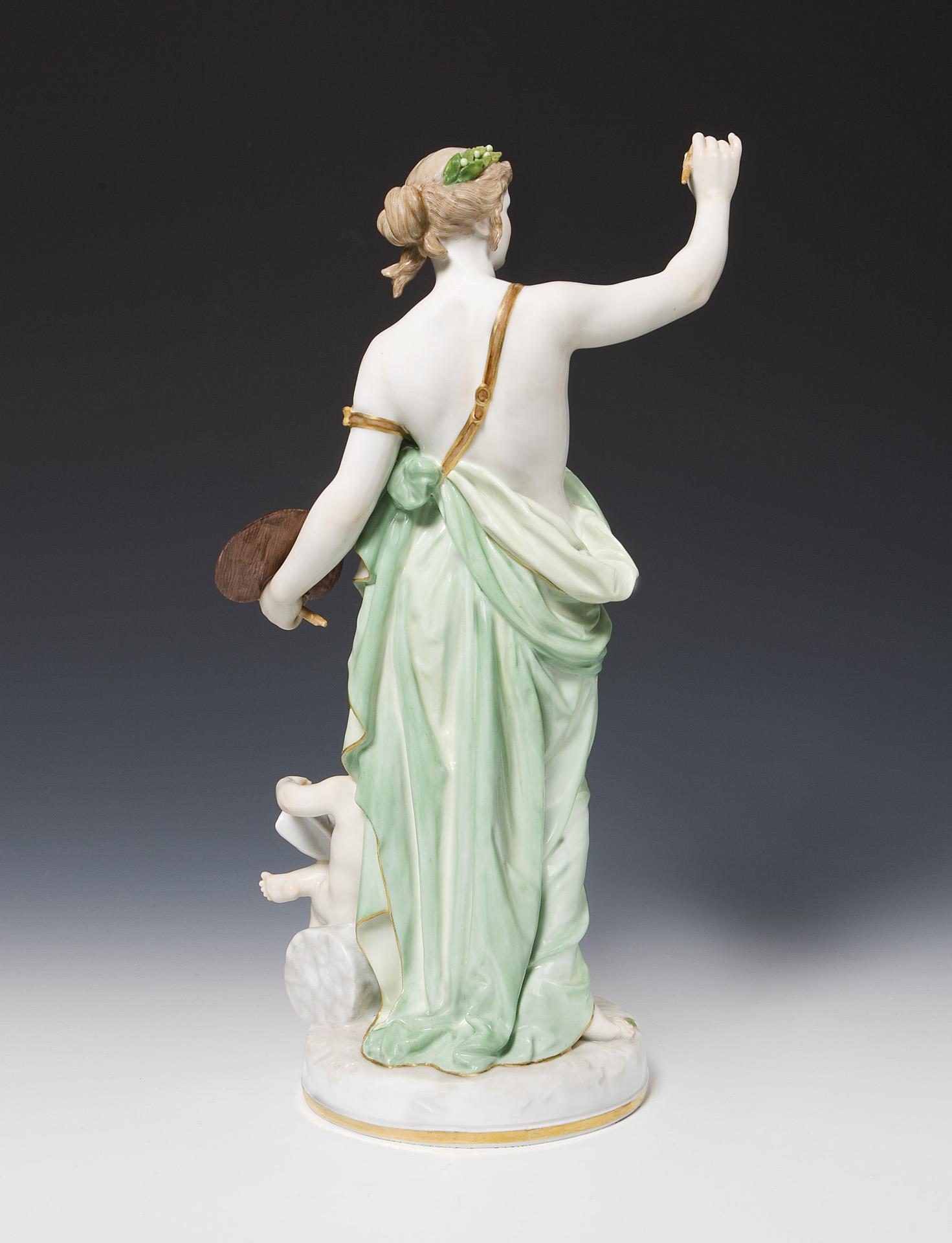 Modell-Jahr: 1882-1885, Pendant zu Modell-Nr. N 161 "Allegorie-Die Musik". Farbig bemalt, gold staffiert, Ritzmarke, Pressmarke, Malermarke, Schwertermarke. Pinsel, Lorbeerblätter, Finger einer Hand, oberer Rand der Maske, ein Zeh restauriert, eine Pinselspitze bestoßen.