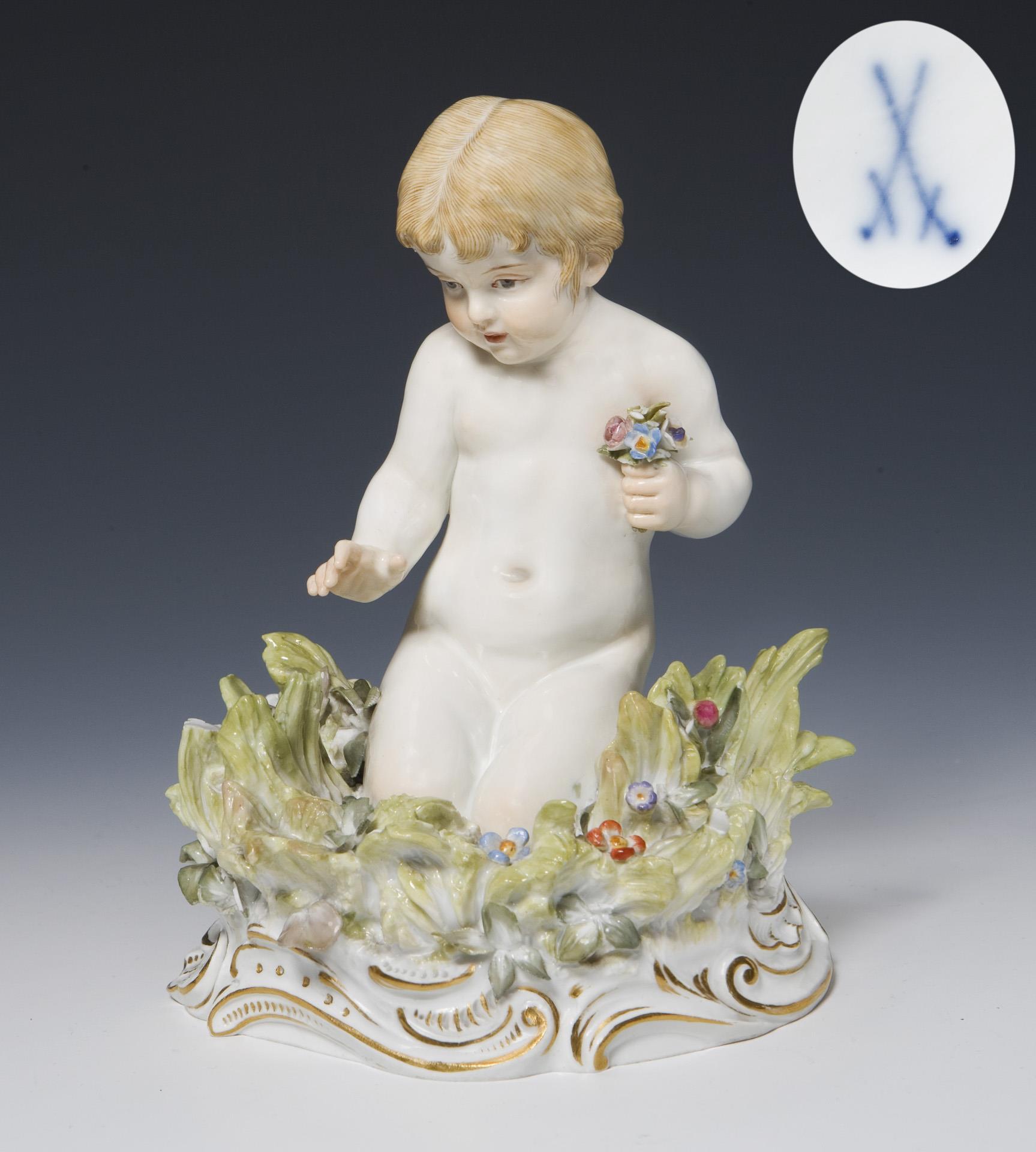 Modell-Jahr: 1898, Farbig bemalt, gold staffiert. Ritzmarke, Pressmarke, Malermarke, Schwertermarke. Schmetterling fehlt, Blätter partiell bestoßen, rückseitig am Sockel kleiner Brandriss.