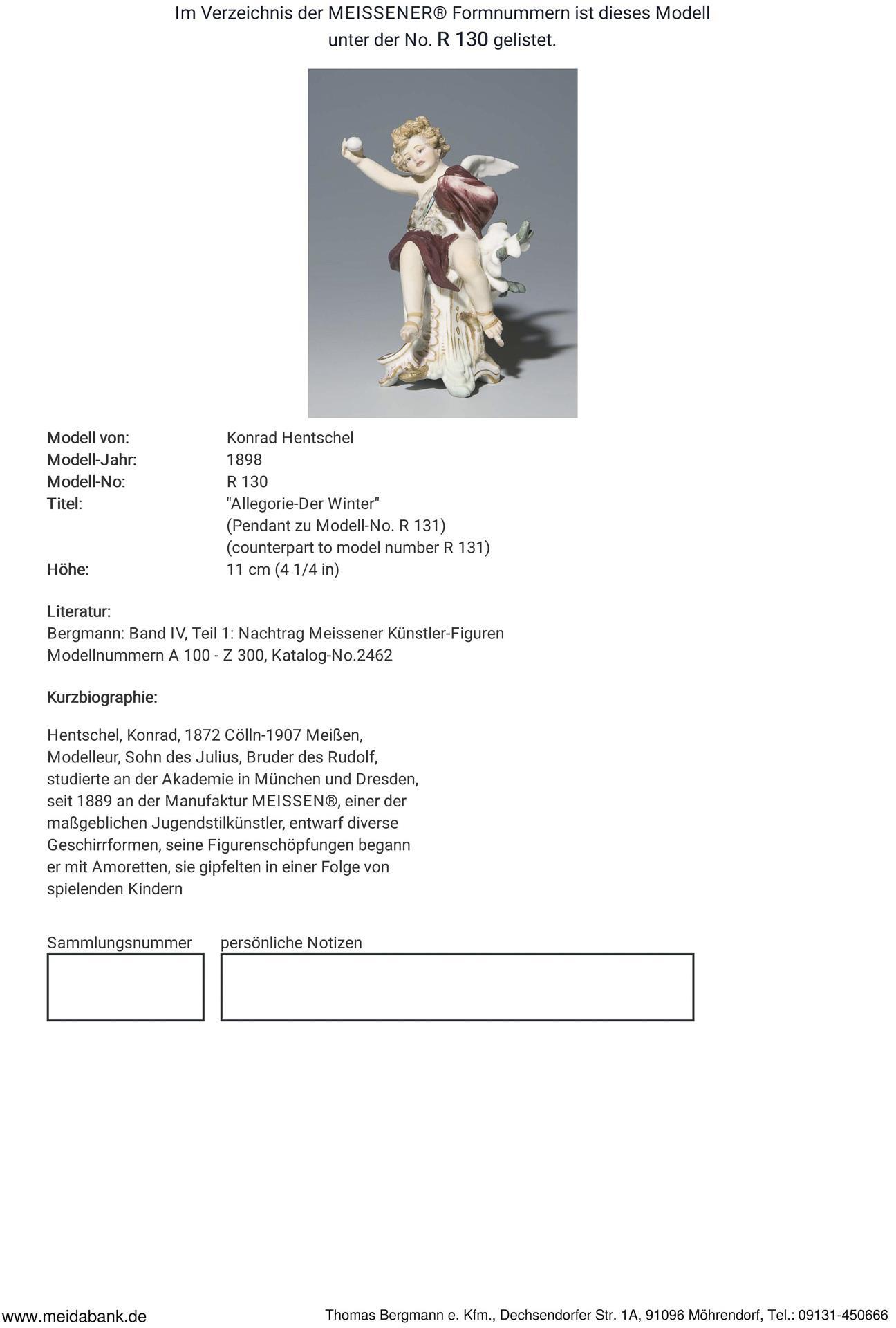 Modell-Jahr: 1898, Pendant zu Modell-Nr. R 131 "Allegorie-Der Sommer", farbig bemalt, gold staffiert. Ritzmarke, Pressmarke, Malermarke, Schwertermarke.