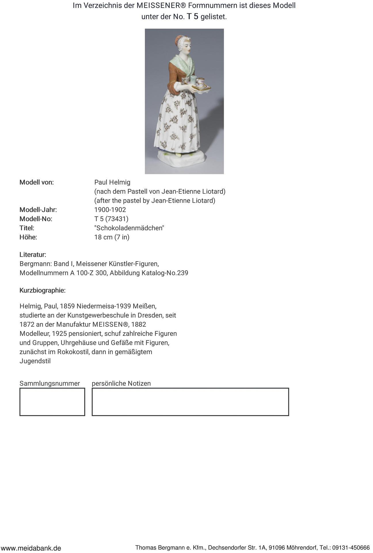 Helmig, studierte an der Kunstgewerbeschule in Dresden, seit 1872 an Manufaktur Meissen, 1882 Modelleur, 1925 pensioniert, schuf zahlreiche Figuren, Uhrgehäuse und Gefäße mit Figuren. Meissen-Manufaktur-Preis: 3990,- Euro * Partnerauktion Bergmann.