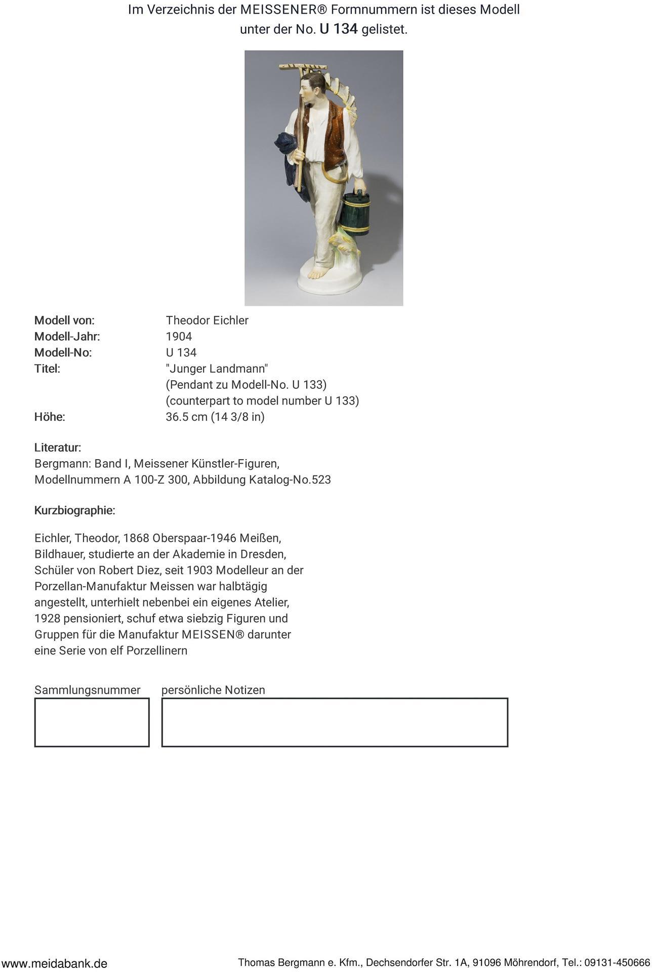 Modell-Jahr: 1904, Pendant zu Modell-Nr. U 133 "Junge Landfrau". Farbig bemalt, Ritzmarke, Pressmarke, Malermarke, Schwertermarke. Oberer Teil von Rechen und Sichelstiel, Stielenden, ein kleiner Tuchzipfel, rückseitig Messergriff restauriert, einige Zinken bestoßen.