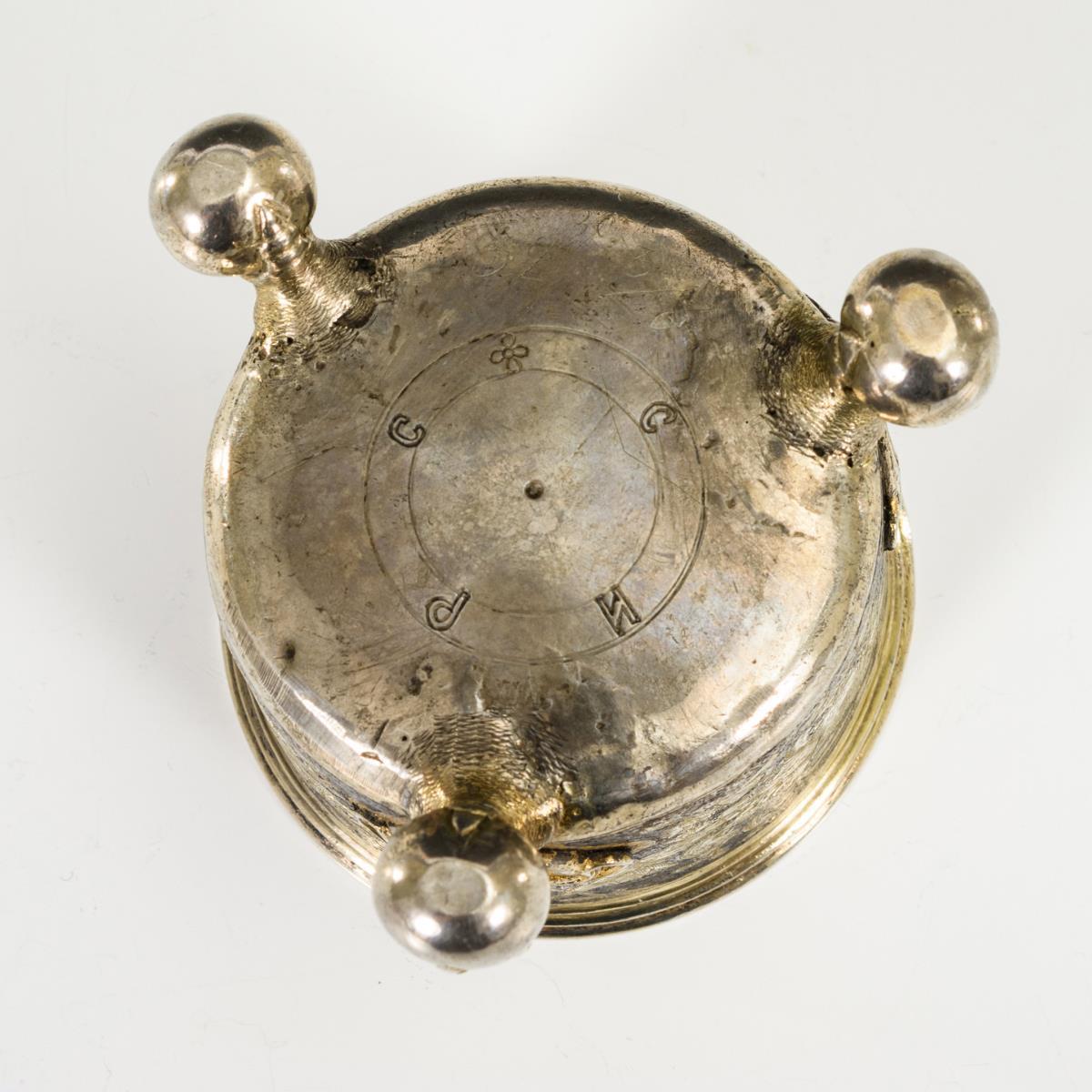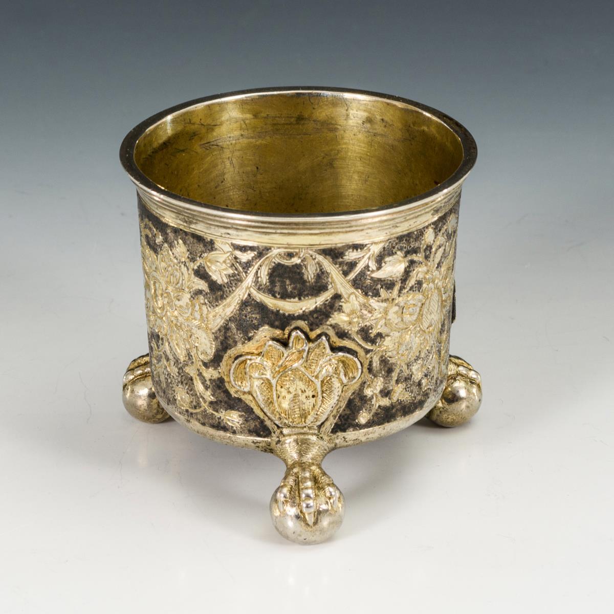 Flacher, floral gravierter Becher, auf 3 Klauenfüßen mit Kugel. Gebrauchsspuren.