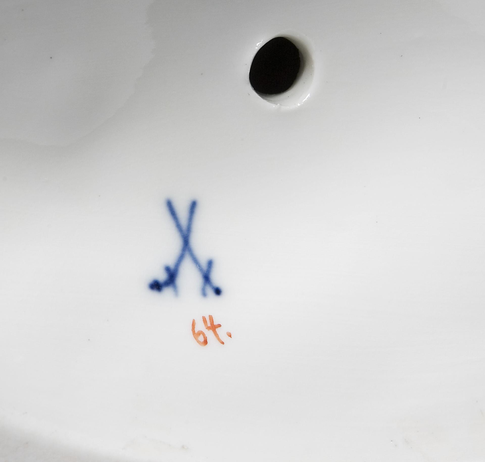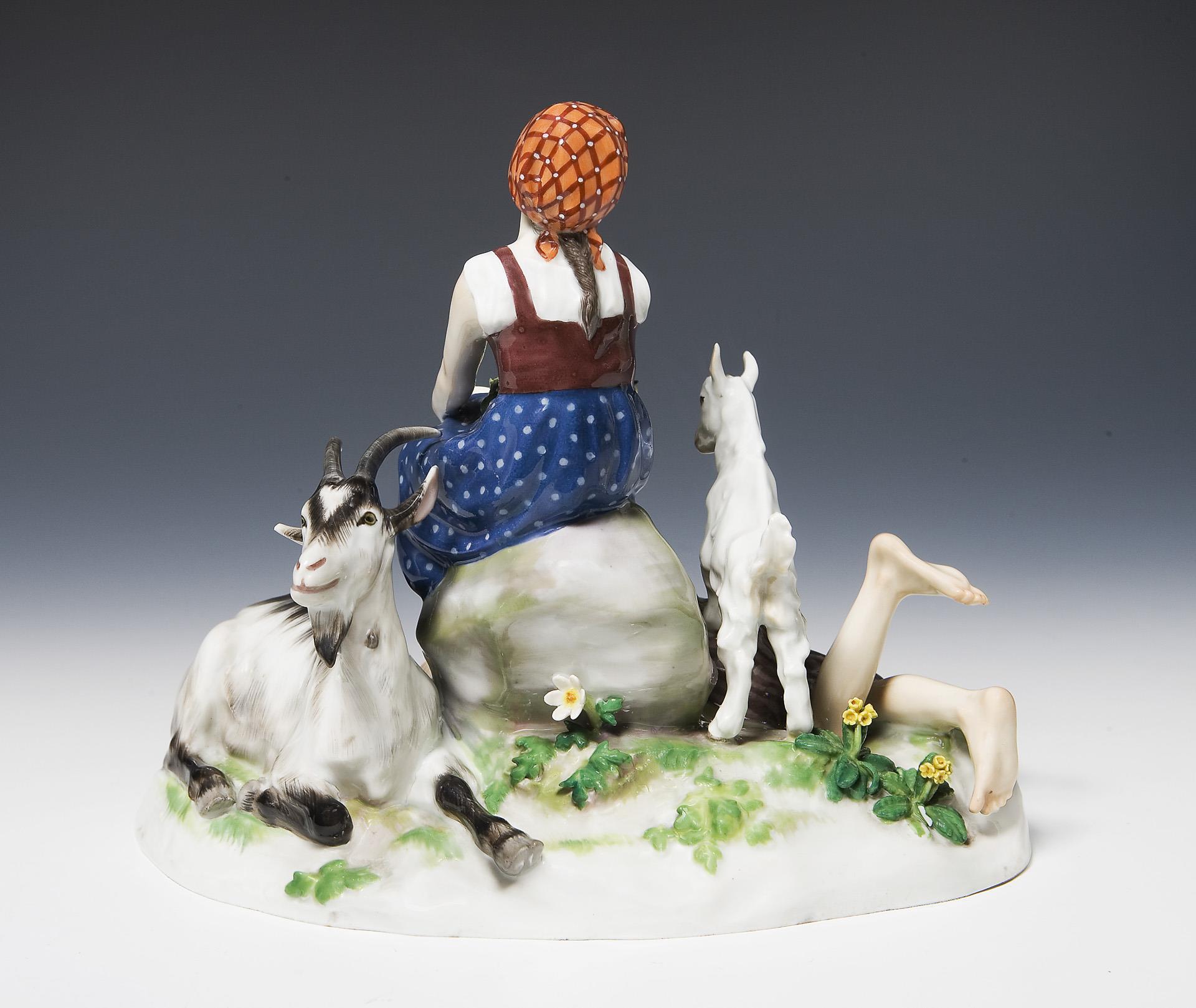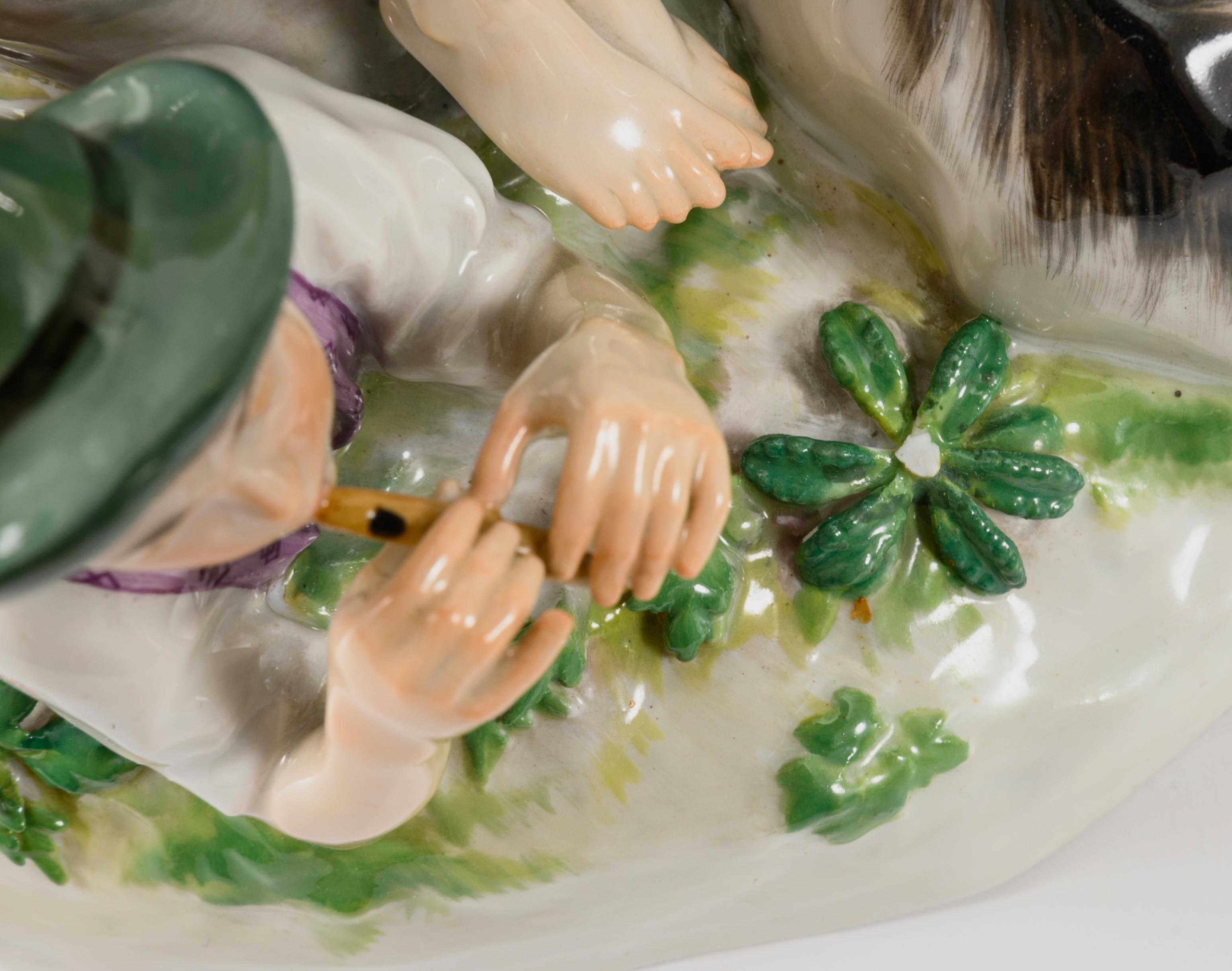 Modell-Jahr: 1905-1910, farbig bemalt, Ritzmarke, Pressmarke, Malermarke, Schwertermarke. Flöte, rückseitig ein Blatt bestoßen, Sockelrand mit kleinem Ausschliff, ein Daumen mit kleinem Brandriss.