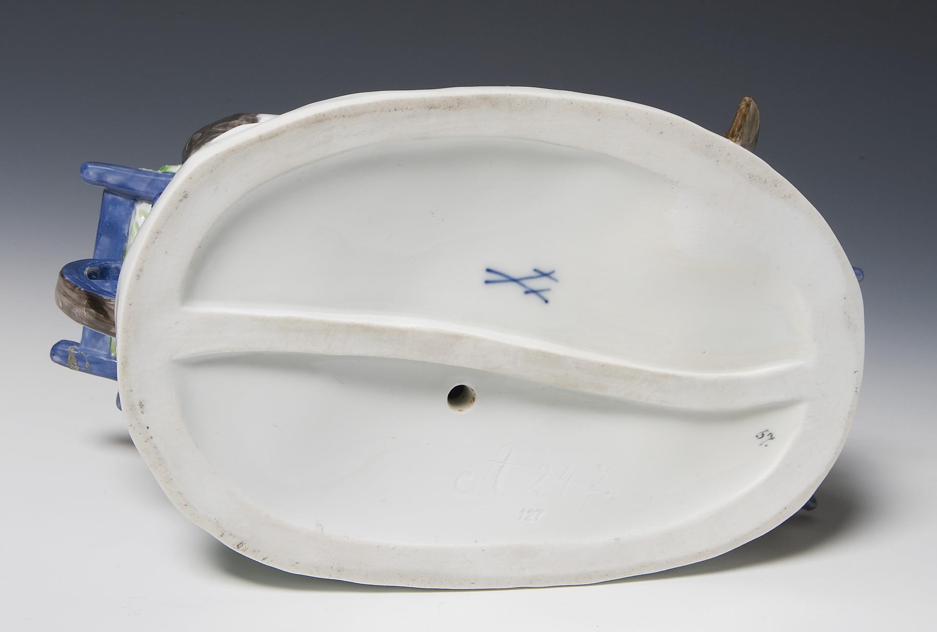 Modell-Jahr: 1909-1911, farbig bemalt, Ritzmarke, Pressmarke, Malermarke, Schwertermarke. Ein Ohr bestoßen, rückseitig eine kleine Ecke am Wagen geklebt.