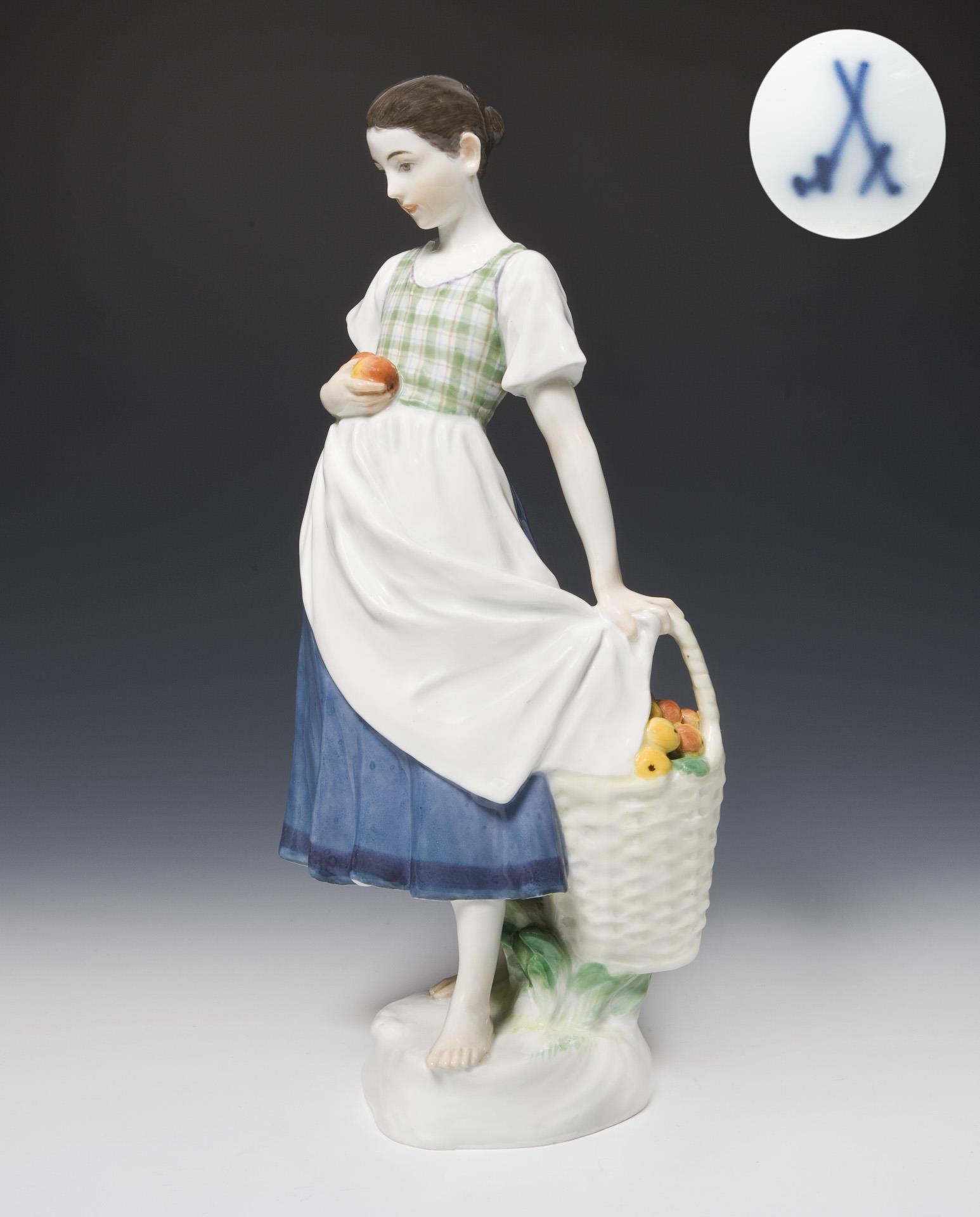 Modell-Jahr: 1904, Pendant zu Modell-Nr. U 138 "Knabe mit Apfelsack". Farbig bemalt, Ritzmarke, Pressmarke, Malermarke, Schwertermarke. Glasurdefekt am Blatt unter dem Rock, minimaler Kratzer auf dem Kopf.