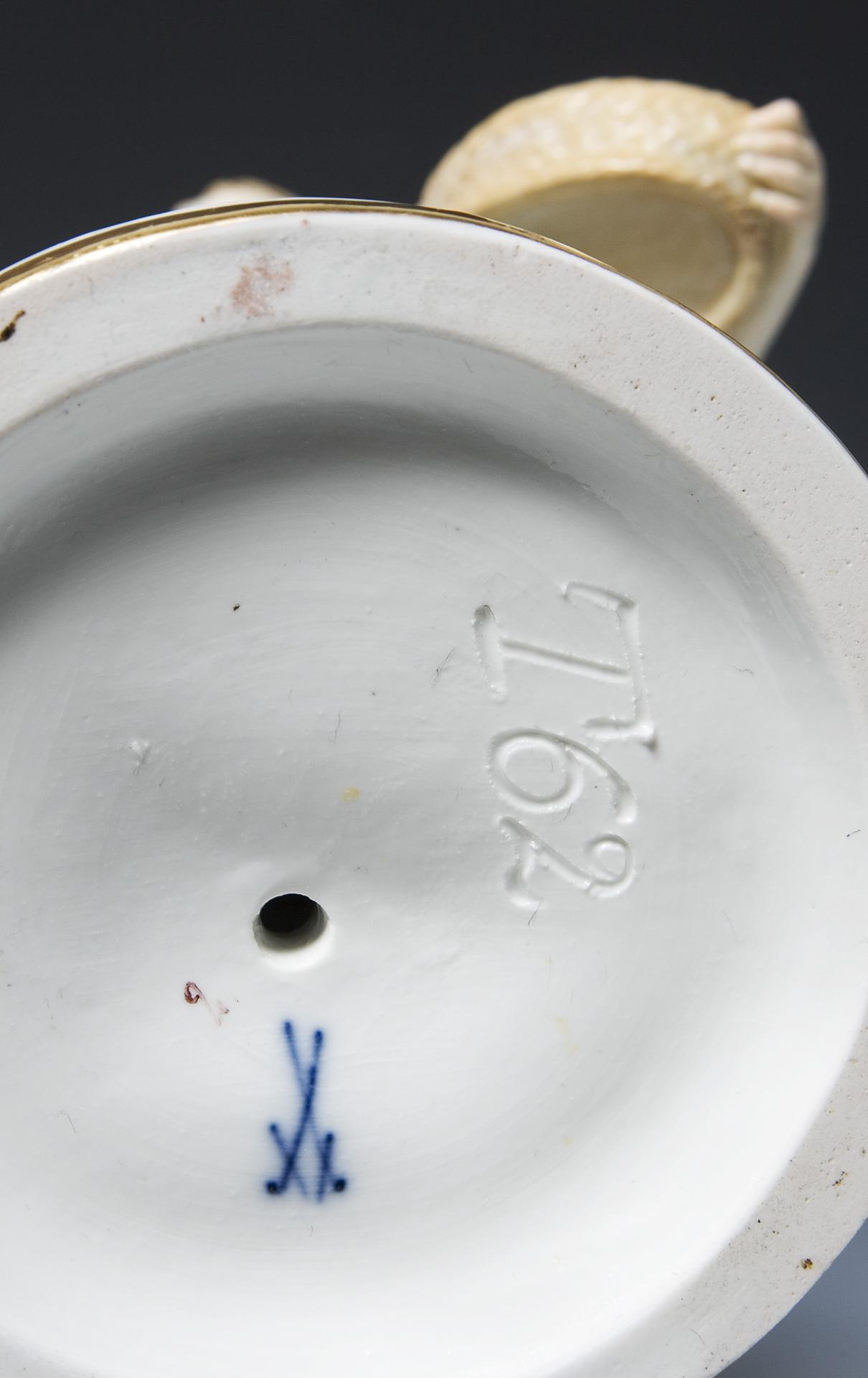 Modell-Jahr: 1901-1904, farbig bemalt, gold staffiert, Ritzmarke, Malermarke, Schwertermarke. Einige Blättchen minimal bestoßen.