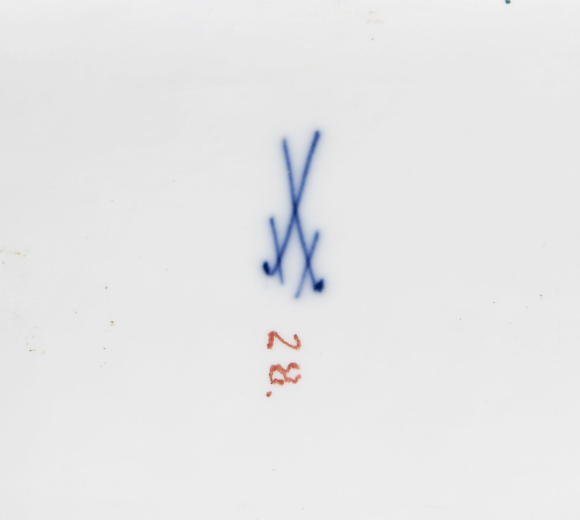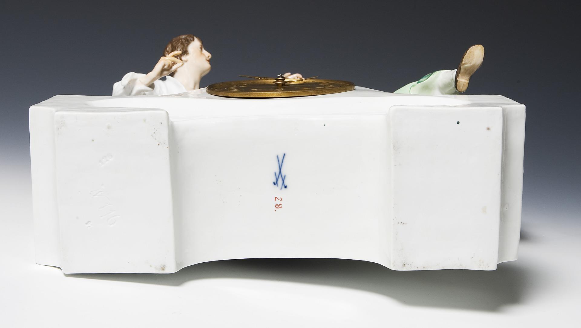 Modell-Jahr: 1905-1910, farbig bemalt, gold staffiert, Ritzmarke, Pressmarke, Malermarke, Schwertermarke. Lenzkirch-Uhrwerk mit Schlüsselaufzug defekt, Messing-Zifferblatt mit geprägten arabischen Zahlen. Ein Fuß mit Wade, zwei Finger restauriert, Schlüssel fehlt.