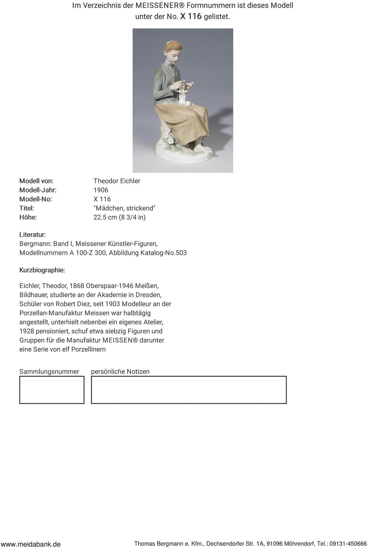 Eichler, Bildhauer, studierte an der Akademie in Dresden. Schüler von Robert Diez, seit 1903 Modelleur an der Manufaktur, war halbtägig angestellt, unterhielt nebenbei ein eigenes Atelier, 1928 pensioniert * Partnerauktion Bergmann.