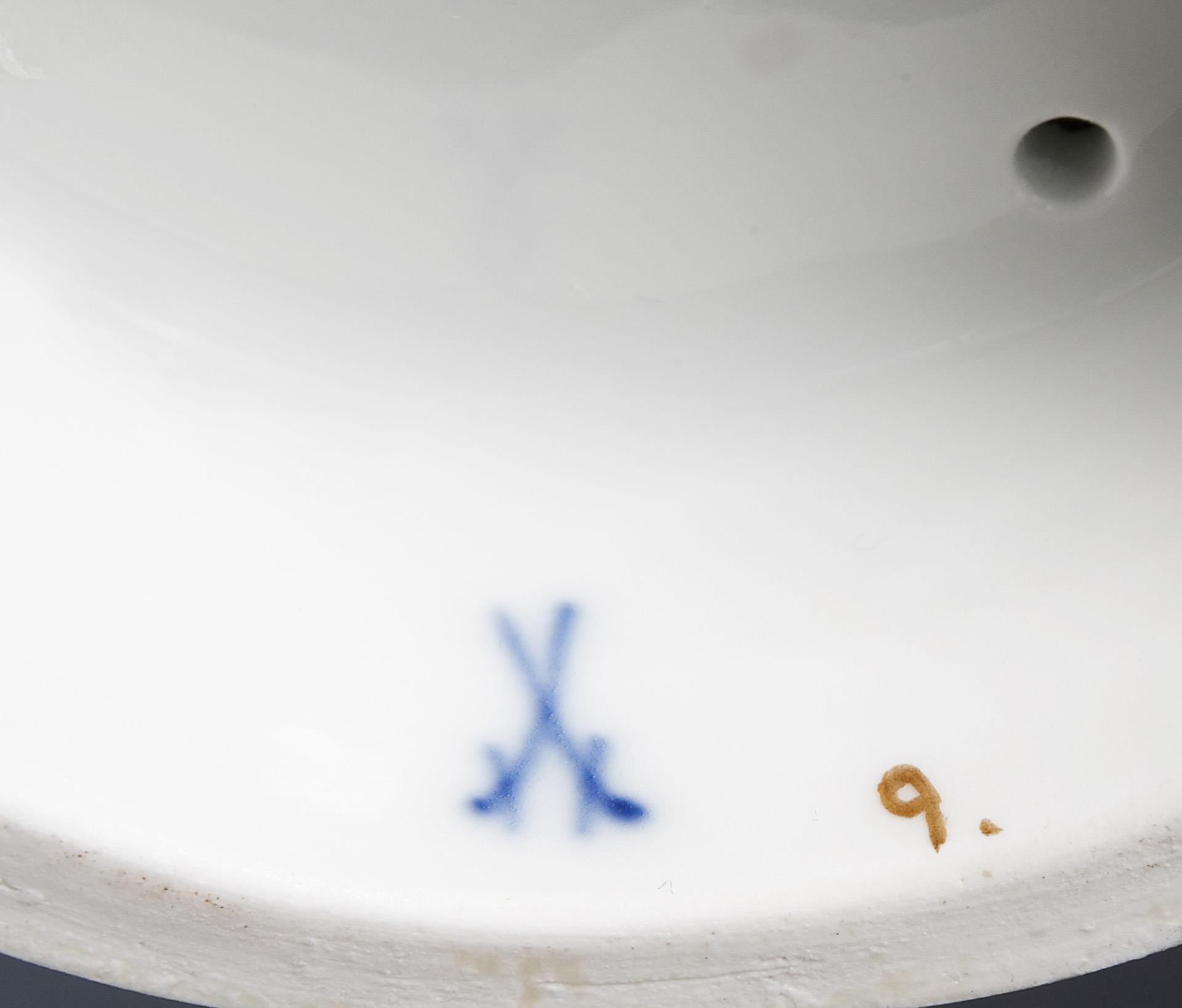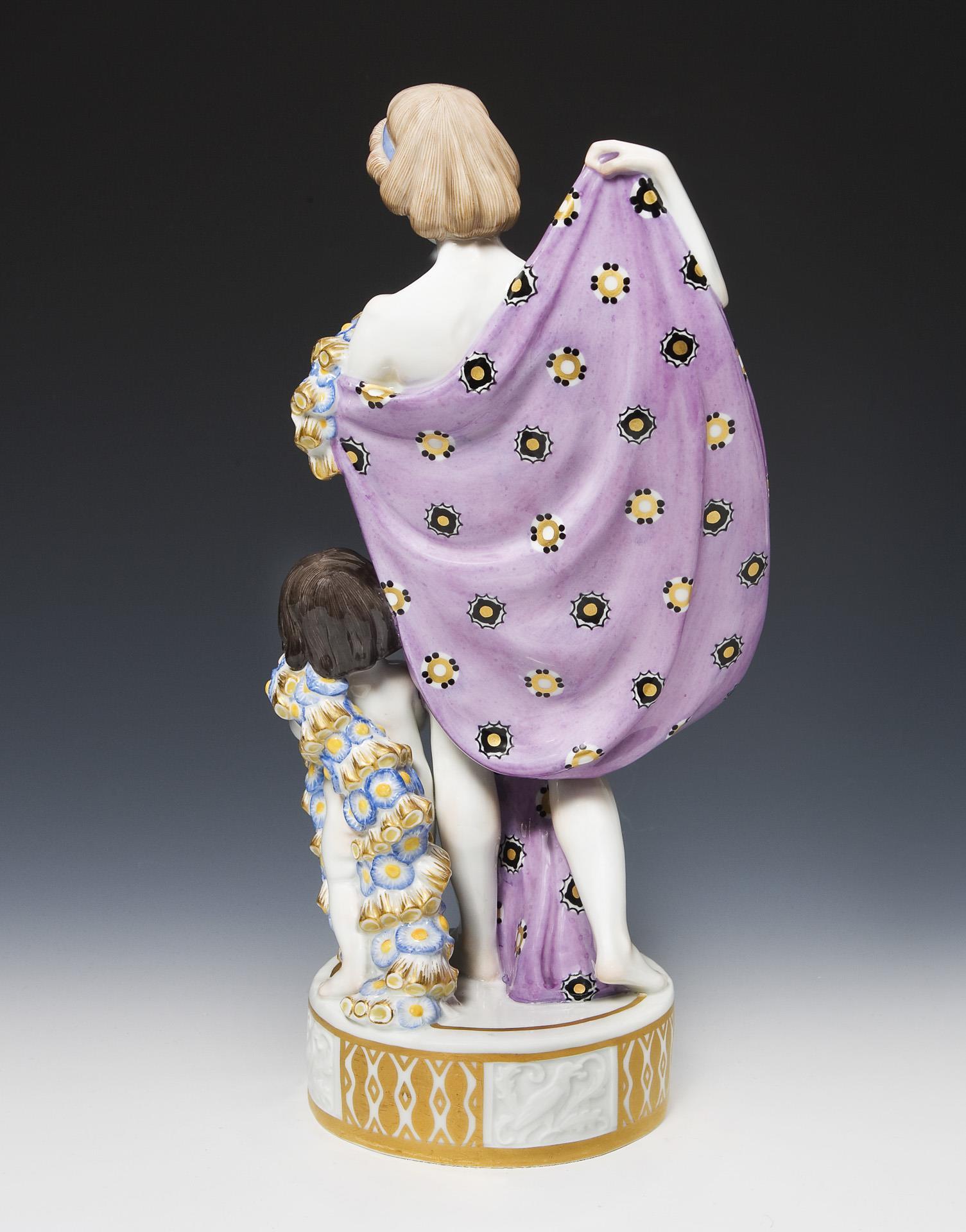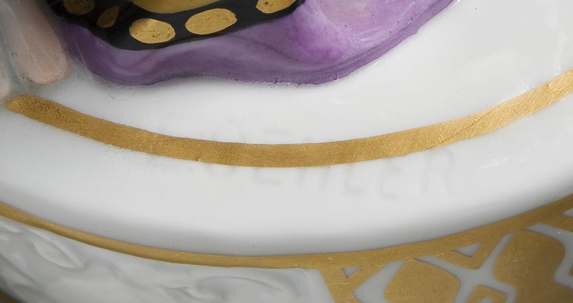 Modell-Jahr: 1912-1913, farbig bemalt, gold staffiert. Rundsockel mit reliefierten Reserven und ornamentalem Golddekor. Ritzmarke, Pressmarke, Malermarke, Schwertermarke, Künstler-Signet.