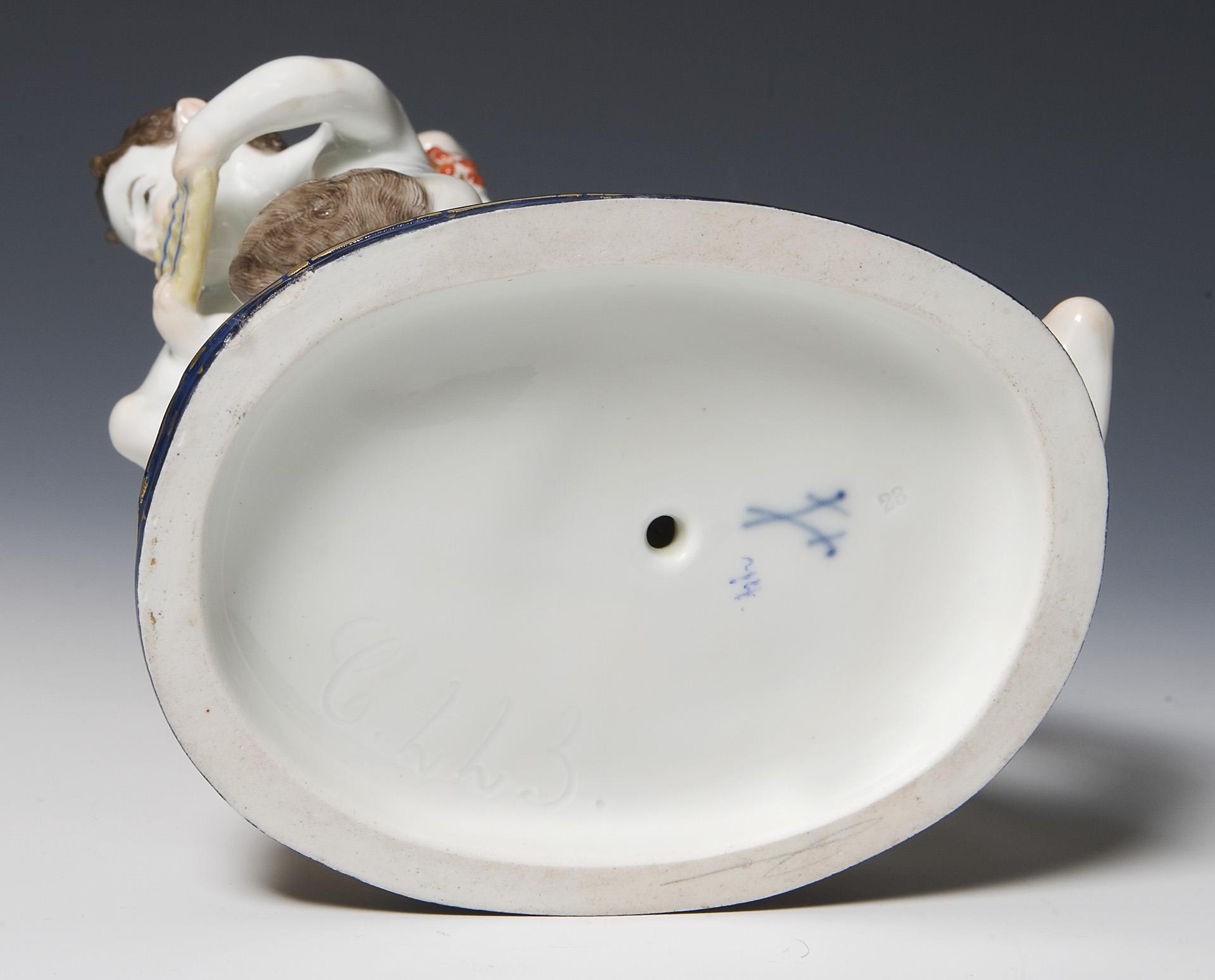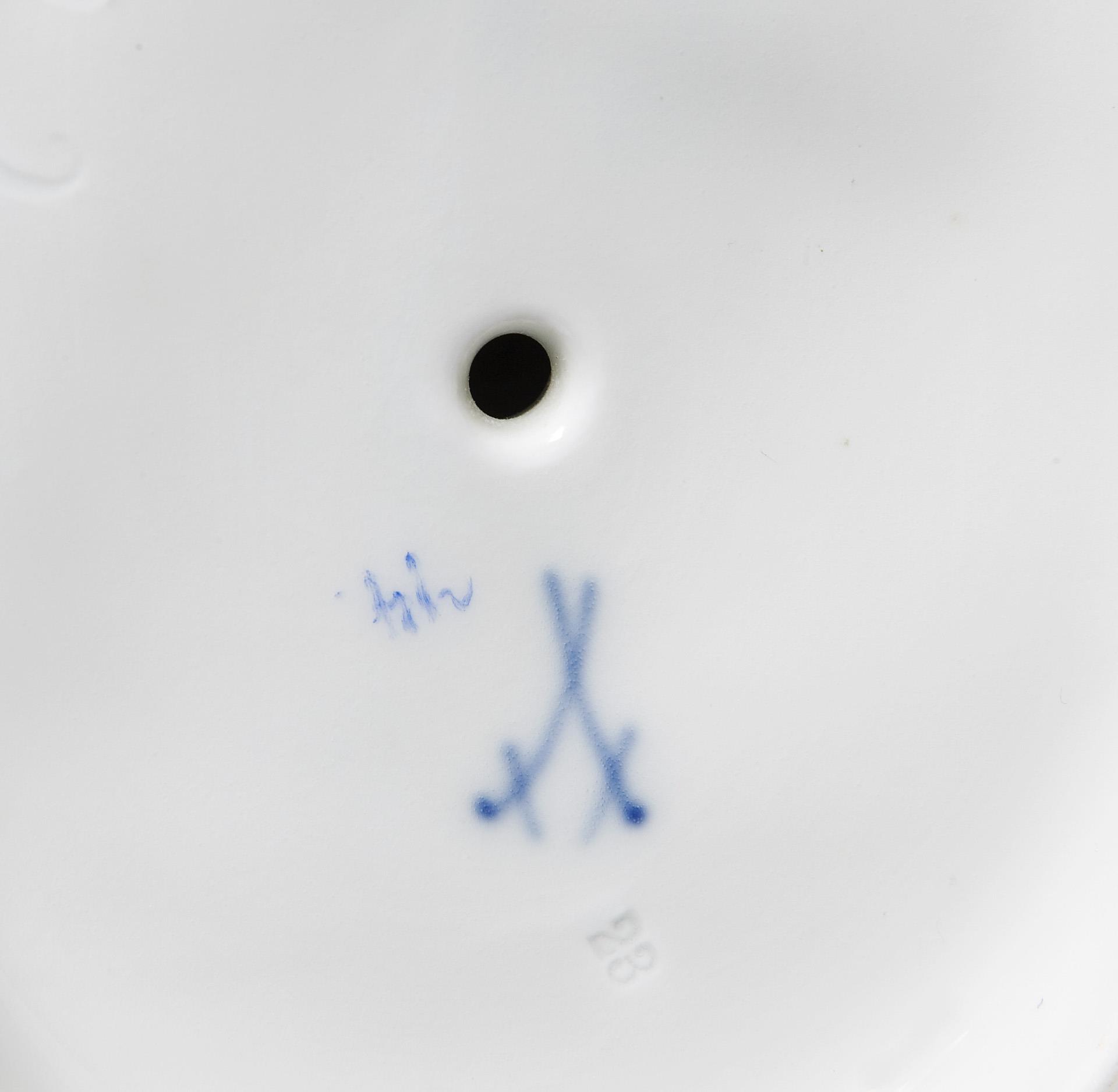 Modell-Jahr: 1912-1913, farbig bemalt, gold staffiert. Ritzmarke, Pressmarke, Malermarke, Schwertermarke. Ein Ohr restauriert.