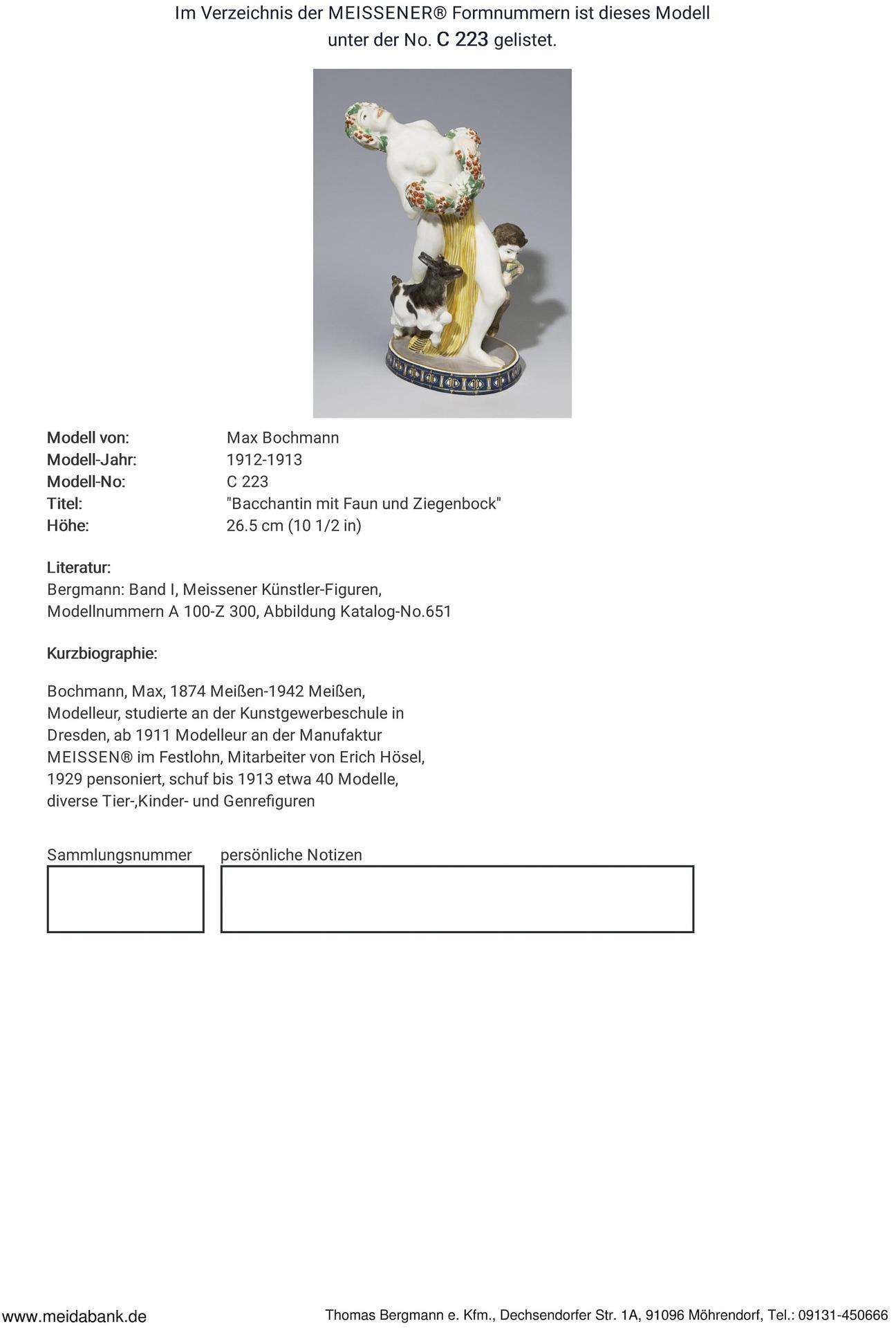 Bochmann, Modelleur, studierte an der Kunstgewerbeschule in Dresden, ab 1911 Modelleur an der Manufaktur im Festlohn, Mitarbeiter von Erich Hösel, 1929 pensioniert * Partnerauktion Bergmann | Update 15.06.25: Beschrieben ist "Ein Ohr restauriert", richtig ist: "Kleine Bestoßung am rechten Ziegenohr" (Ø ca. 3 mm); das Ohr ist nicht restauriert).