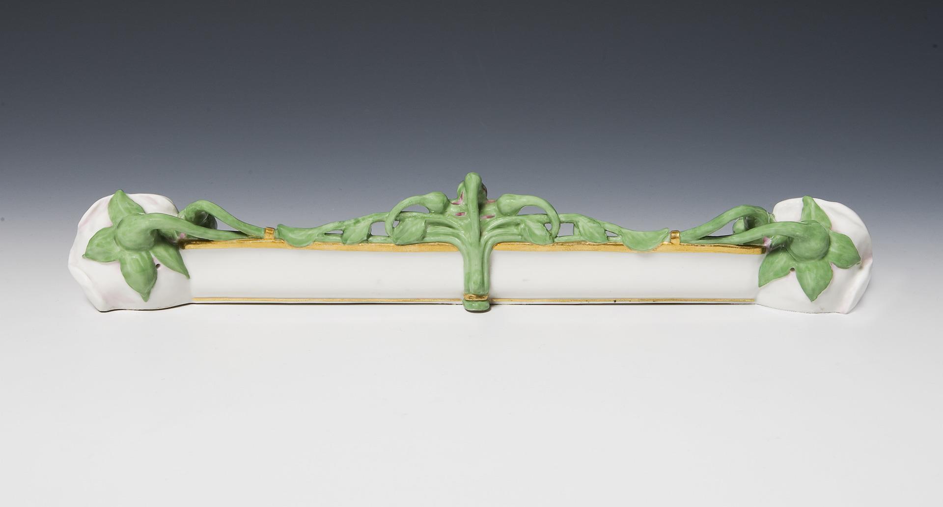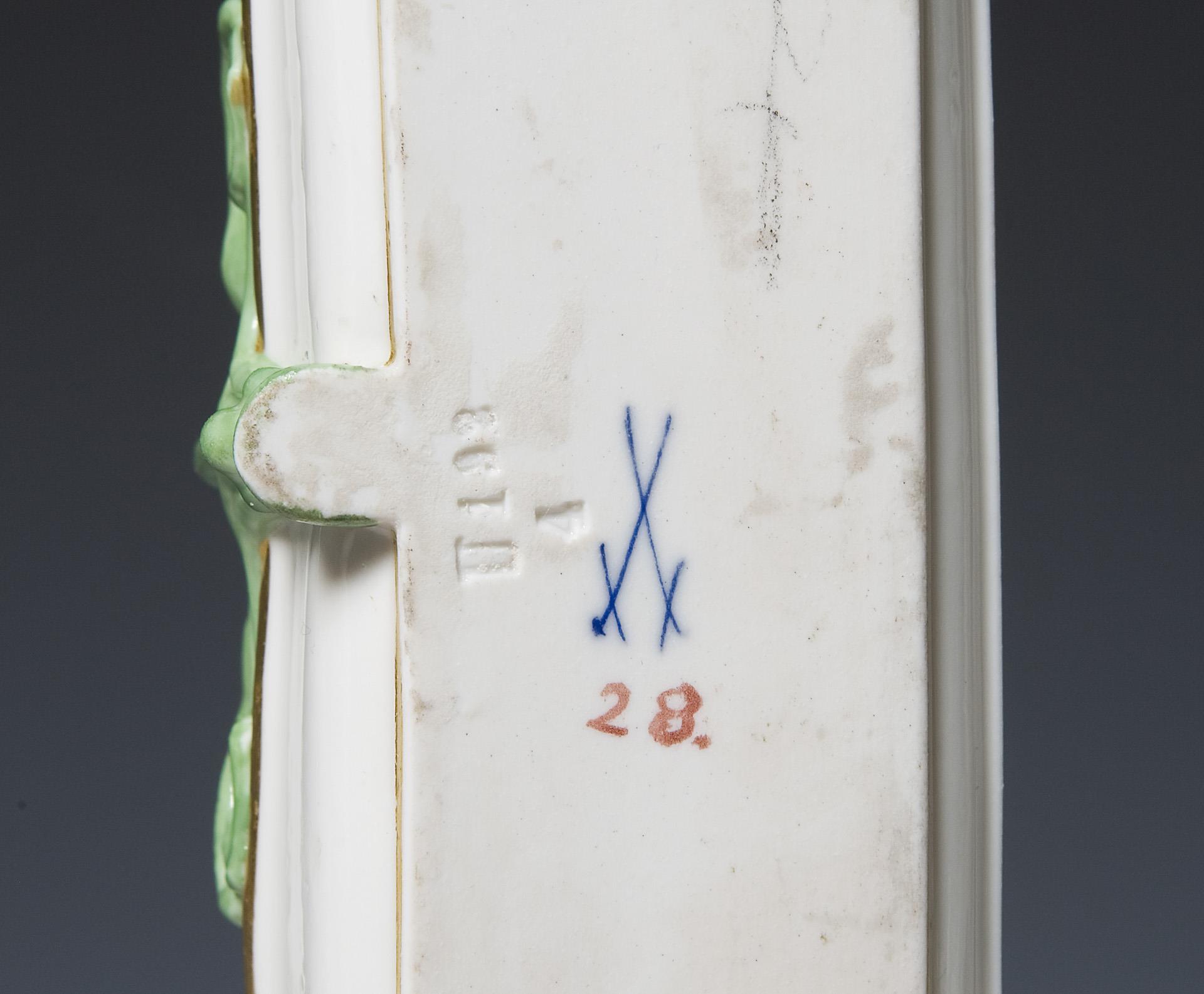 Modell-Jahr: 1905, naturalistisch bemalt, gold staffiert. Unglasierter Boden, Pressmarken, Malermarke, Schwertermarke. Rückseitig kleiner Brandriss, minimale Glasurausschliffe, kleine Glasurdefekte.