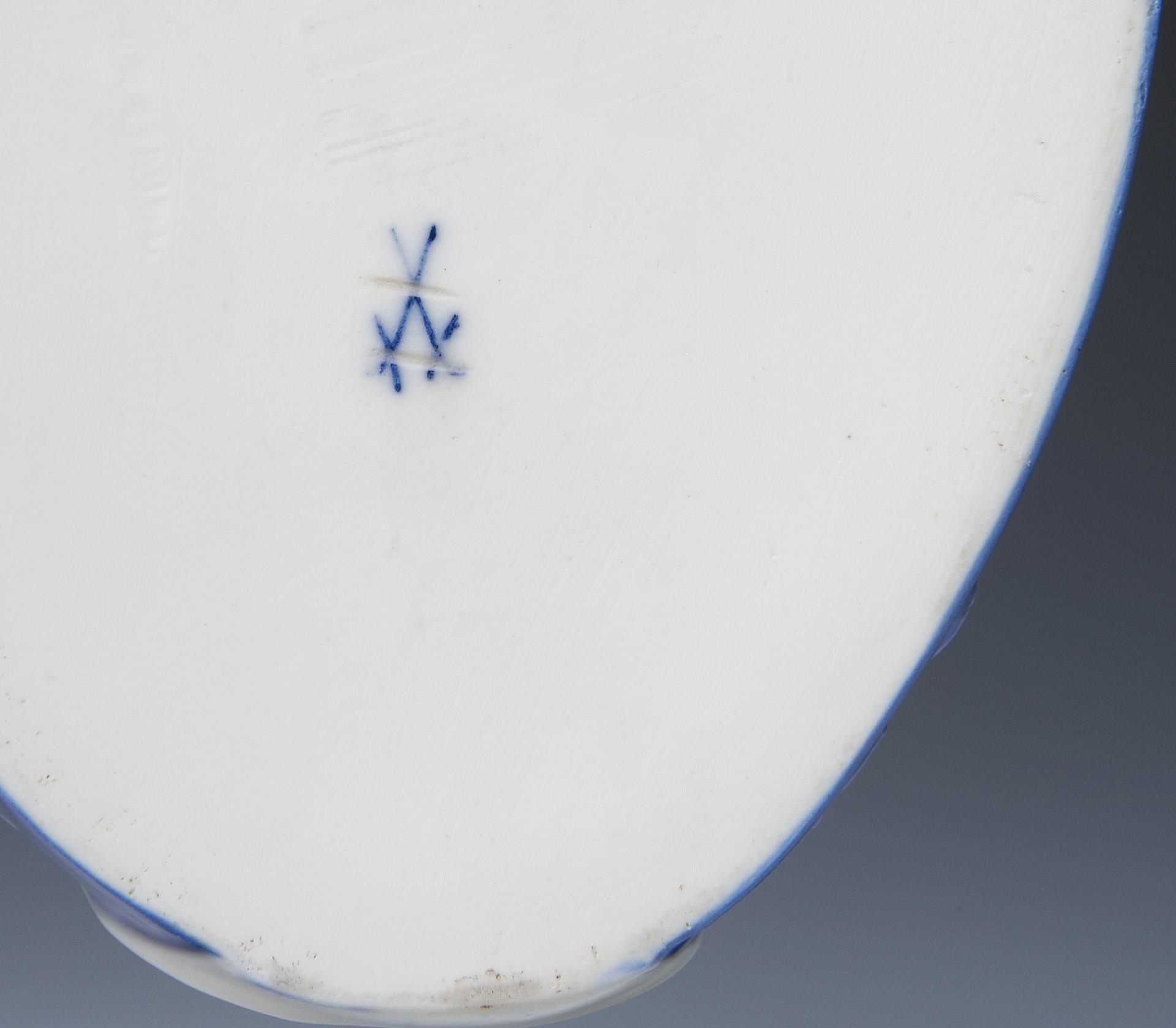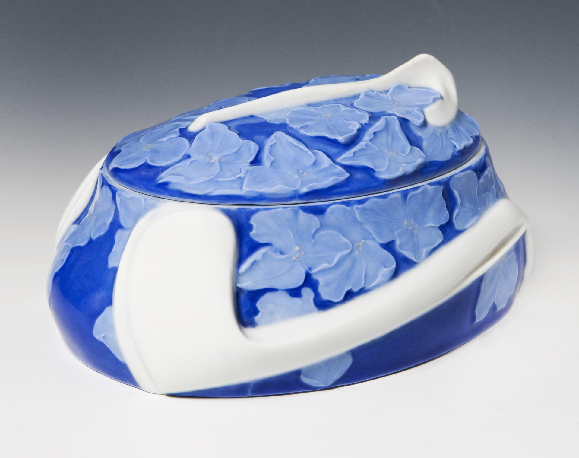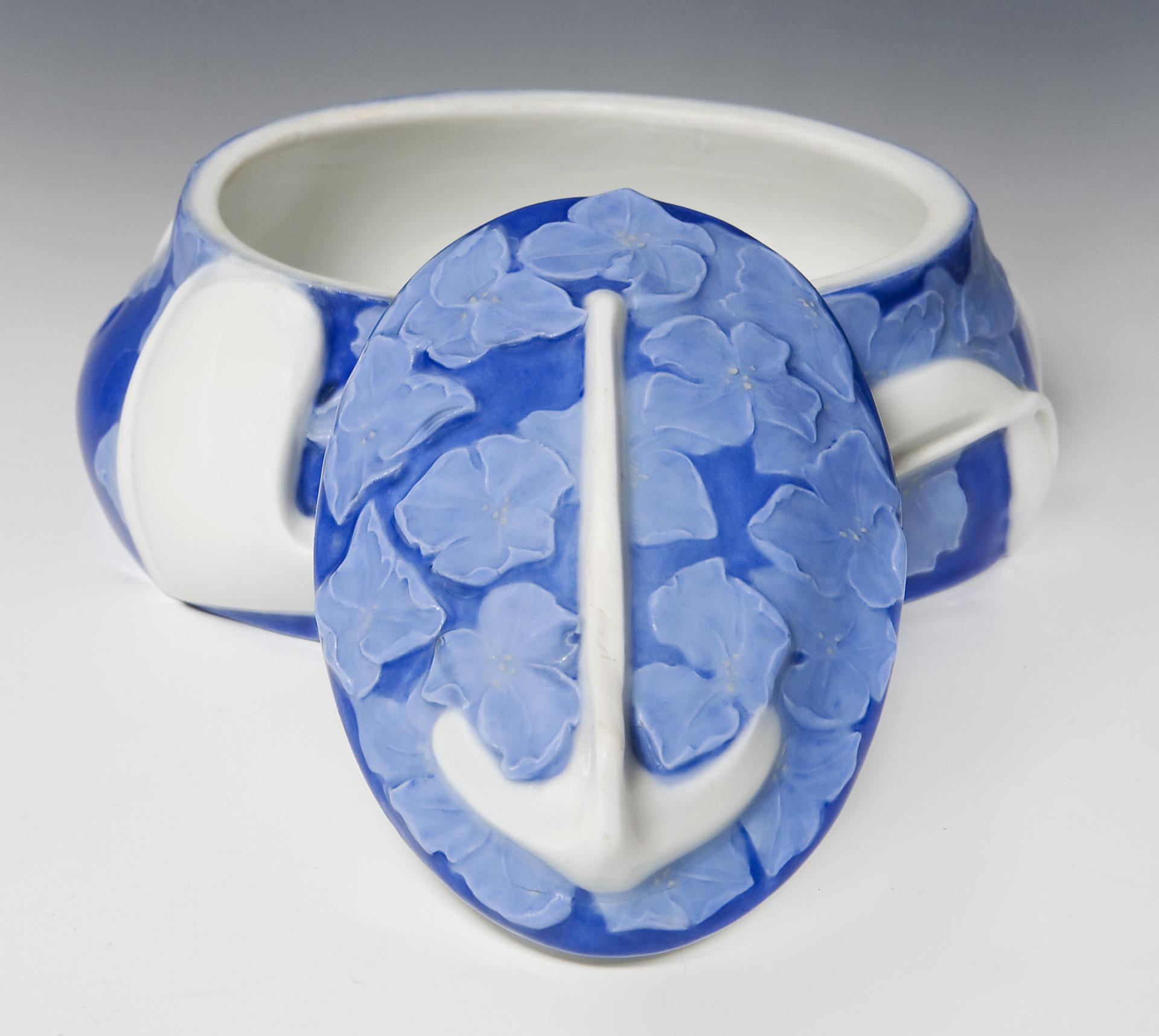 Modell-Jahr: 1901, floral und ornamental reliefiert, partiell blauer Fond. Unglasierter Boden, Pressmarken, Schwertermarke zweimal gestrichen. Wandung mit einem Brandriss und einem Haarriss, Handhabe mit Glasurdefekt, minimaler Haarriss, Deckel mit minimalem Brandriss.