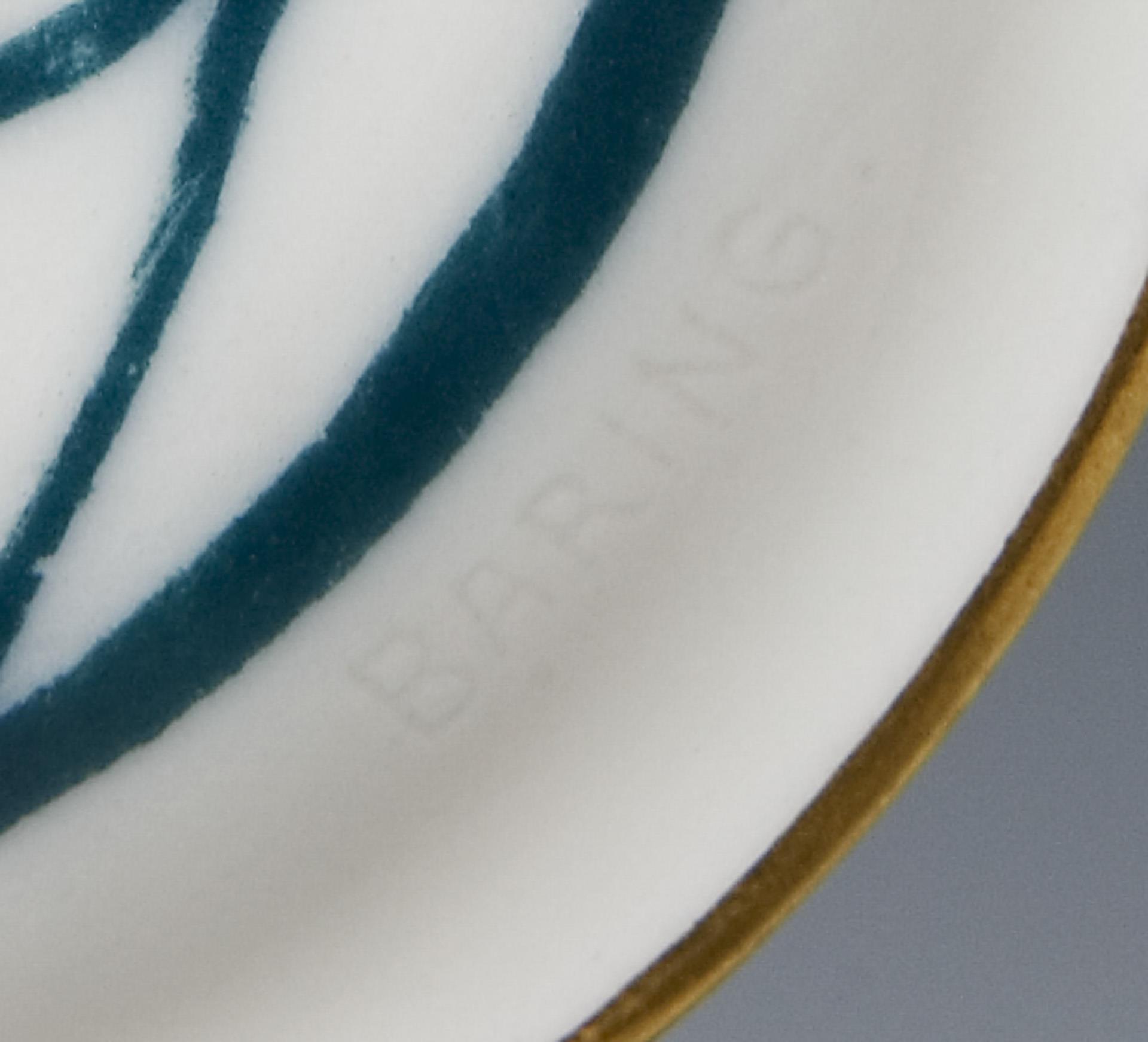Modell-Jahr: 1911-1912, farbige Unterglasurbemalung, Ornamentdekor in Gold. Unglasierter Boden, Ritzmarke, Pressmarke, Schwertermarke zweimal gestrichen, auf dem Deckel Künstler-Signet.