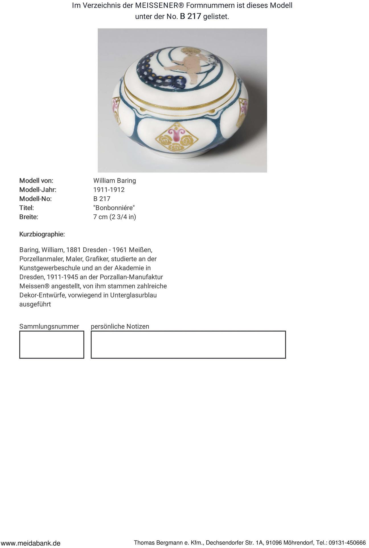 Baring, Maler, Porzellanmaler und Grafiker, studierte an der Akademie in Dresden. Seit 1910 Figurenmaler an der Manufaktur Meissen, 1911-1945 als freischaffender Künstler mit festem Gehalt ebenda, 1937-1945 Leiter der Malereiabteilung * Partnerauktion Bergmann.