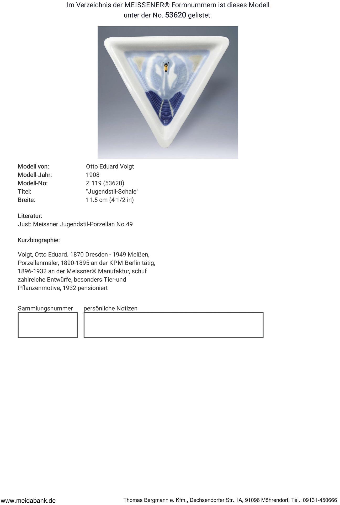Voigt, Porzellanmaler, 1890-1895 an der KPM Berlin tätig, 1896-1932 an der Manufaktur Meissen, schuf zahlreiche Entwürfe, besonders Tier- und Pflanzenmotive, 1932 pensioniert * Partnerauktion Bergmann.