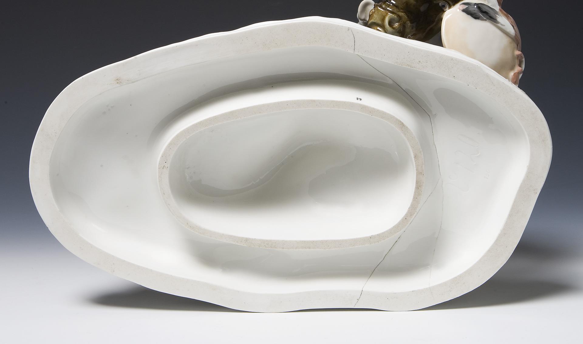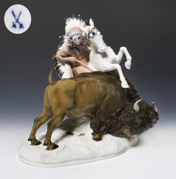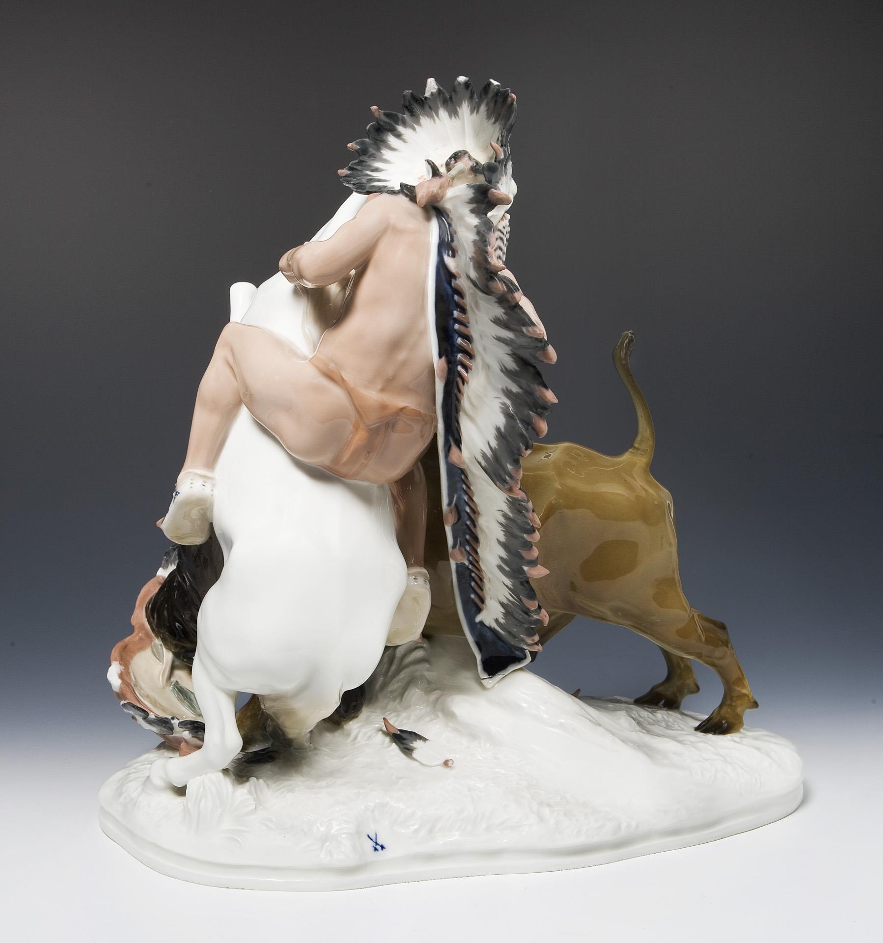 Modell-Jahr: 1906, farbig bemalt, Ritzmarke, Pressmarke, Schwertermarke am Sockel zweimal gestrichen. Büffelschwanzende, eine Federschmuckspitze restauriert, Glasurdefekt am Sockelrand, quer durch den Sockel zwei Haar-Brandrisse, am Federschmuckende unten ein Brandriss, eine kleine Grasecke, ein Büffelbein minimal, Federschmuckspitzen bestoßen, Ende der Lanze fehlt.
