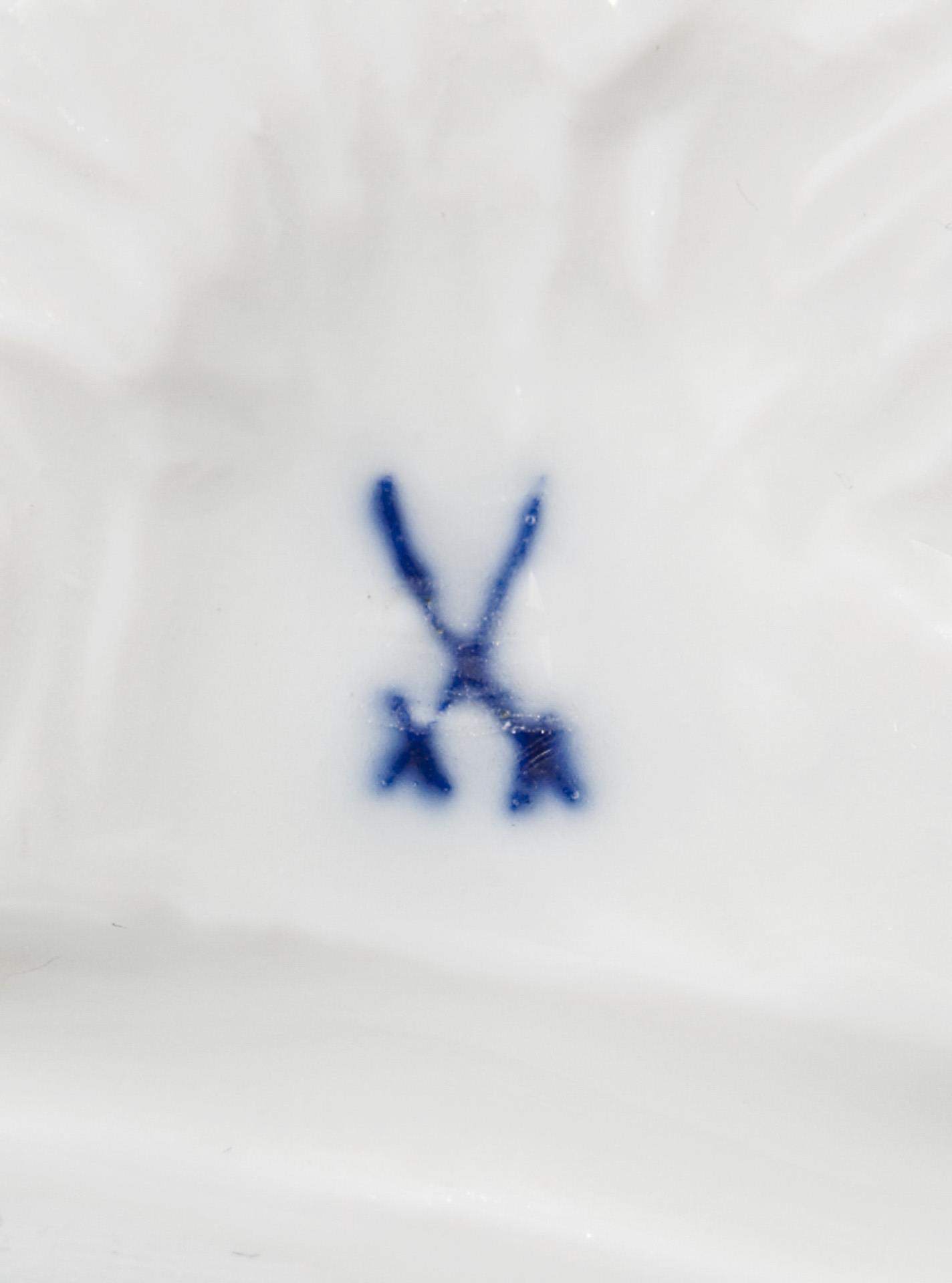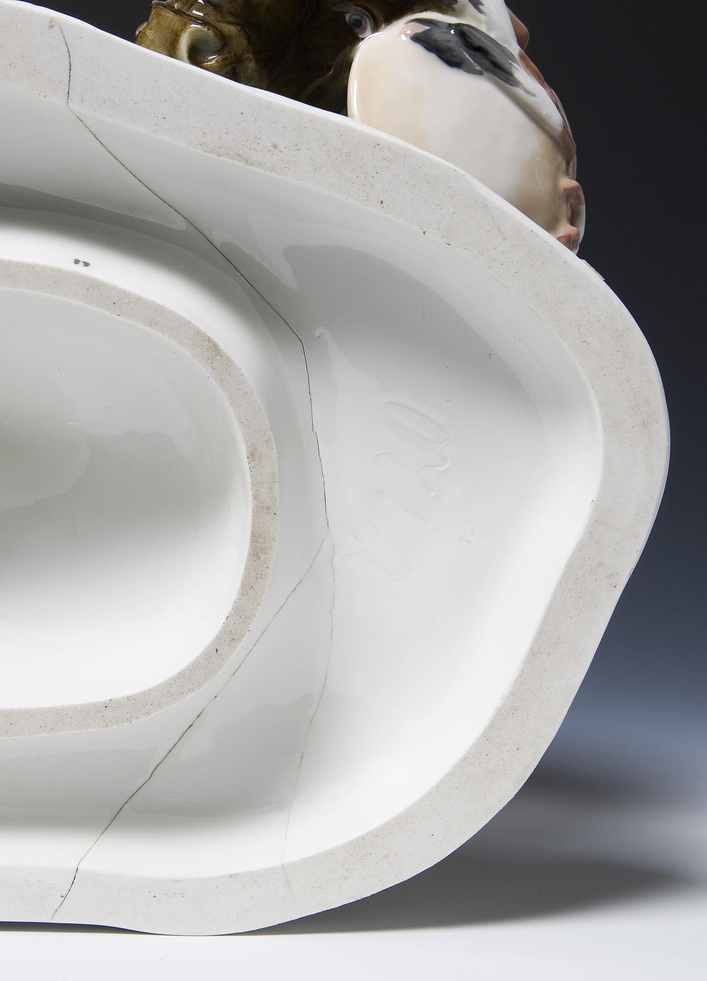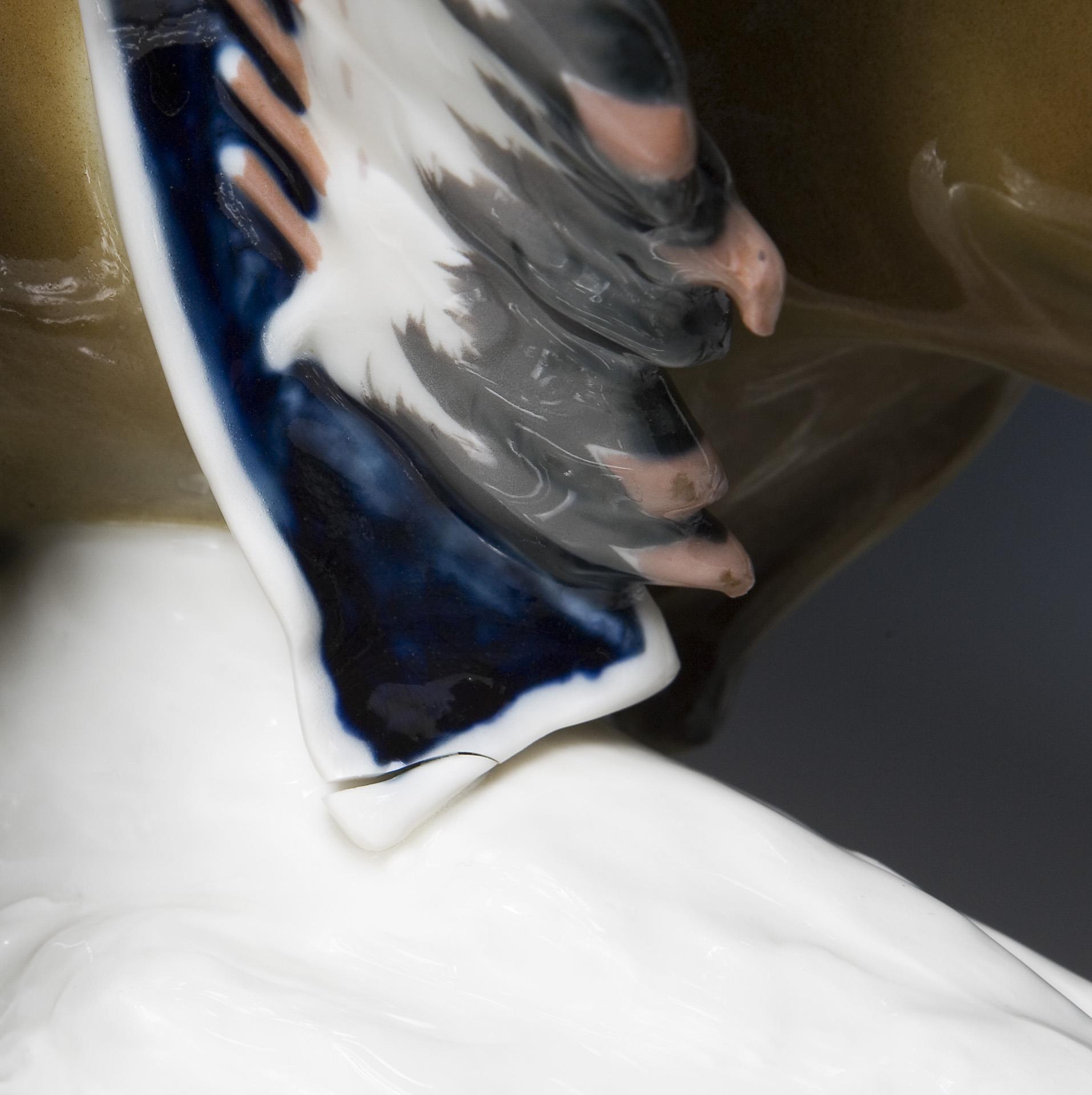 Modell-Jahr: 1906, farbig bemalt, Ritzmarke, Pressmarke, Schwertermarke am Sockel zweimal gestrichen. Büffelschwanzende, eine Federschmuckspitze restauriert, Glasurdefekt am Sockelrand, quer durch den Sockel zwei Haar-Brandrisse, am Federschmuckende unten ein Brandriss, eine kleine Grasecke, ein Büffelbein minimal, Federschmuckspitzen bestoßen, Ende der Lanze fehlt.