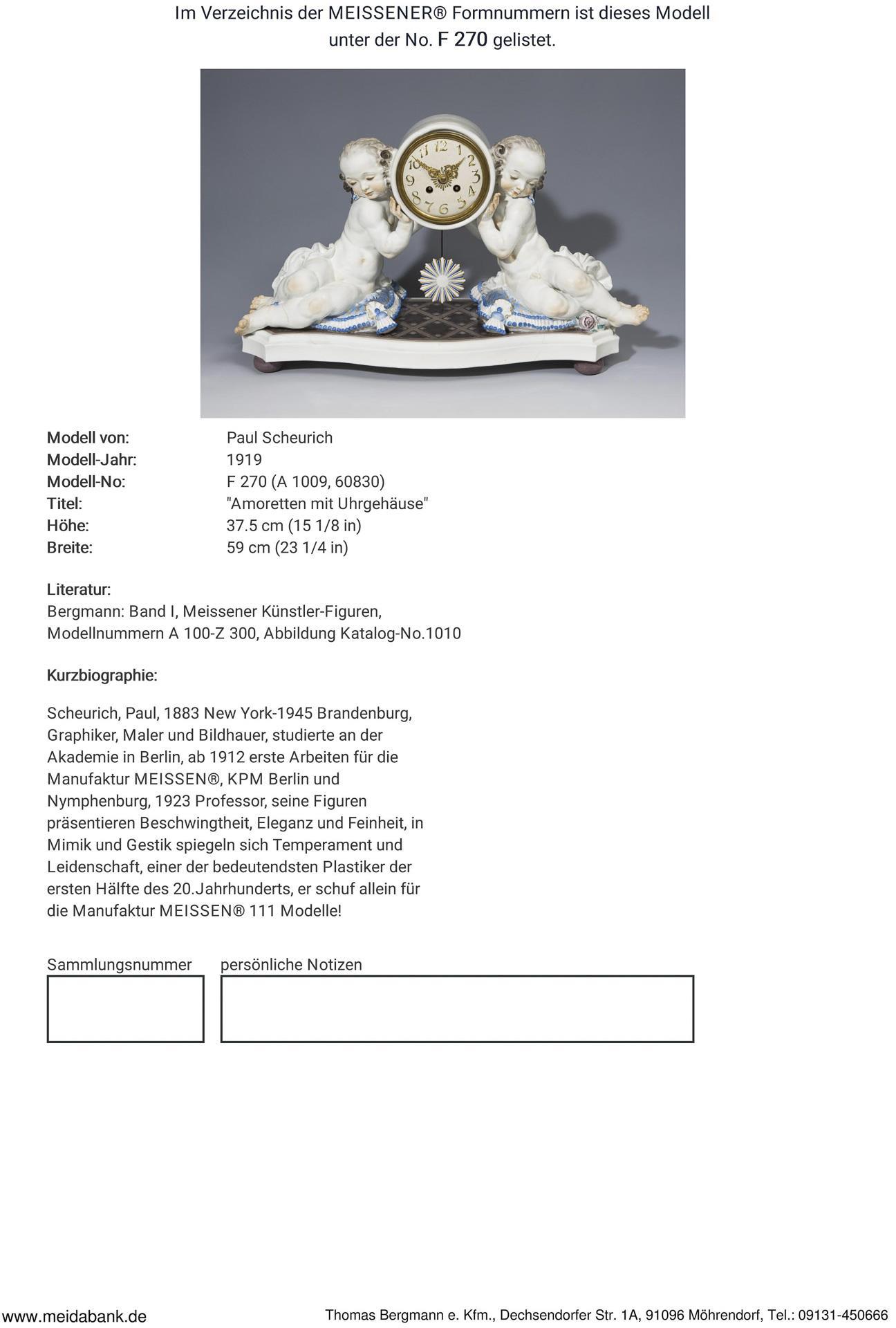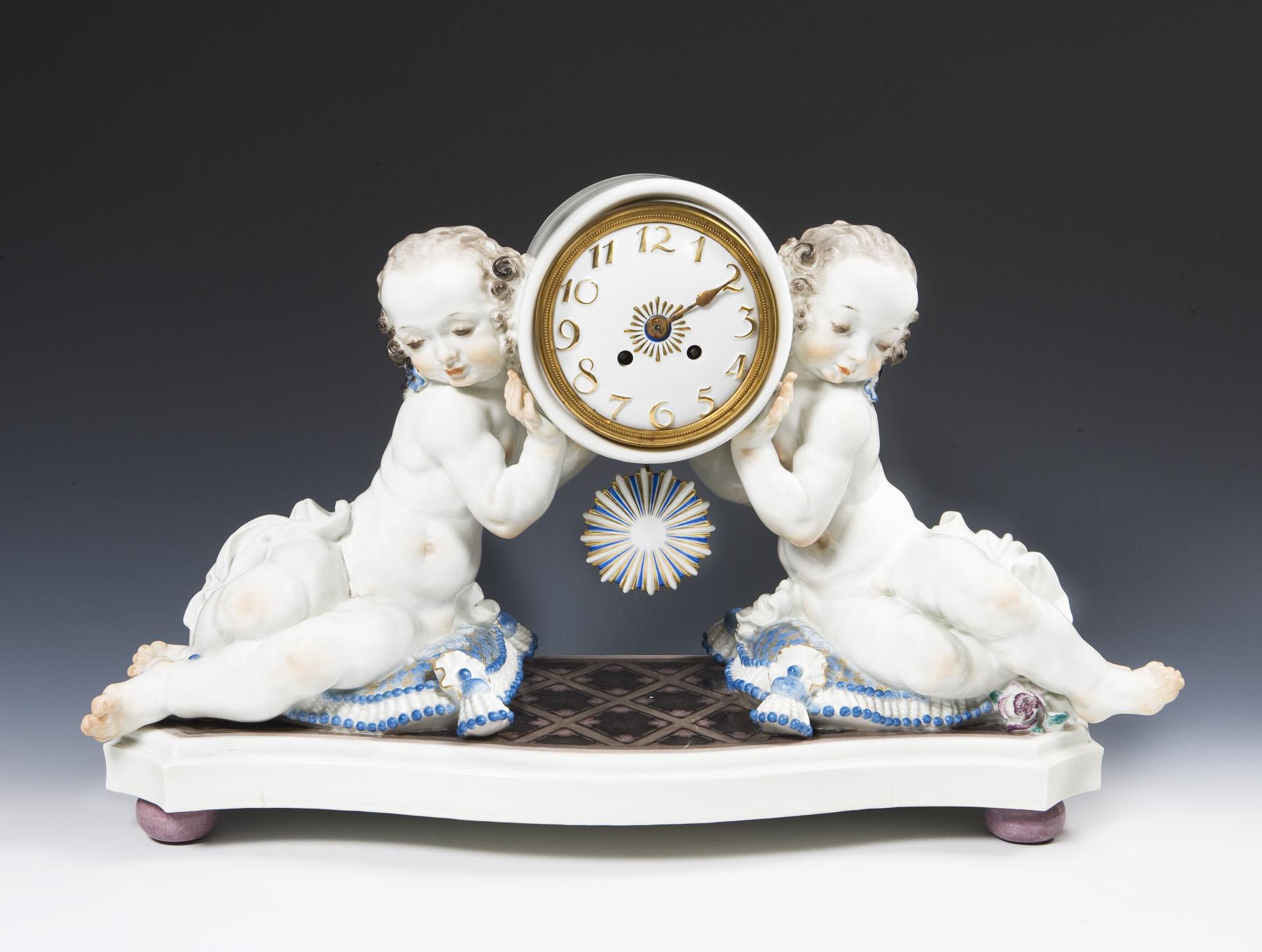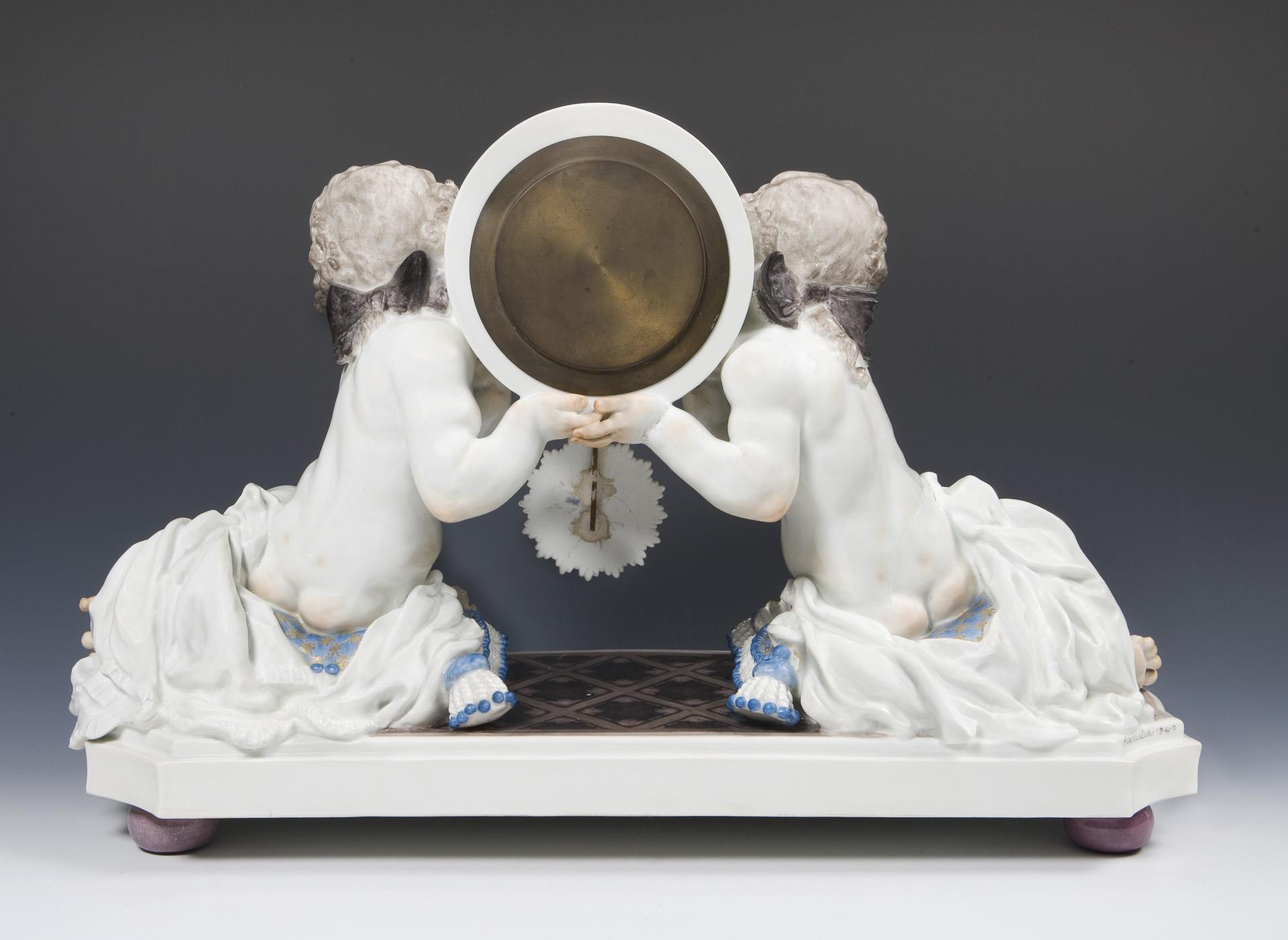 Modell-Jahr: 1920, farbig bemalt. Original-Porzellan-Zifferblatt mit reliefierten arabischen Zahlen, originale Porzellan-Pendellinse. Lenzkirch-Uhrwerk mit Schlagwerk auf Glocke, Schlüsselaufzug, montierte Kugelfüße. Ritzmarke Pressmarke, Malermarke, Schwertermarke, Pressmarke: von 5 Urstücken Nr. 5, handschriftliches Künstler-Signet, datiert: 1920. 1918 wurde die Herstellung von Urstücken (Künstler-Exemplare) eingeführt. Die Ausformung und Staffierung dieser Exemplare wurde vom Künstler selbst überwacht oder nochmals überarbeitet. Daher sind Urstücke meist vom Künstler selbst in Überglasurfarbe signiert. Brandrisse zeugen von den technischen Schwierigkeiten bei der Herstellung von Urstücken. Mittig und an den Seiten mehrere Risse durch den Sockel, kleiner Ausbruch am Sockelboden, mittig am Sockel kleiner Farbabplatzer, eine Amorette mit nachgebesserten Brandrissen an Handgelenk und Unterkörper, eine Amorette mit Haarriss an Beinen und Tuch, Pendel mit Haarriss an der Unterseite, Pendel-Montierung ergänzt, Uhrwerk defekt, ein Zeiger und Schlüssel fehlen.