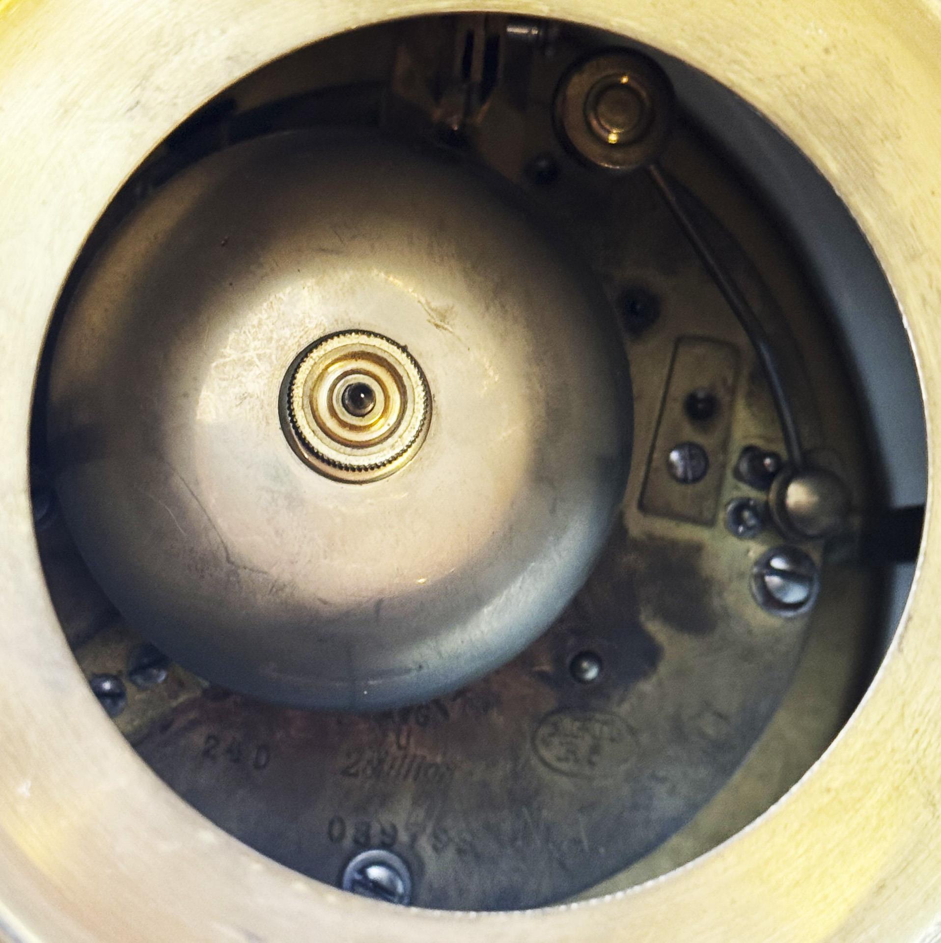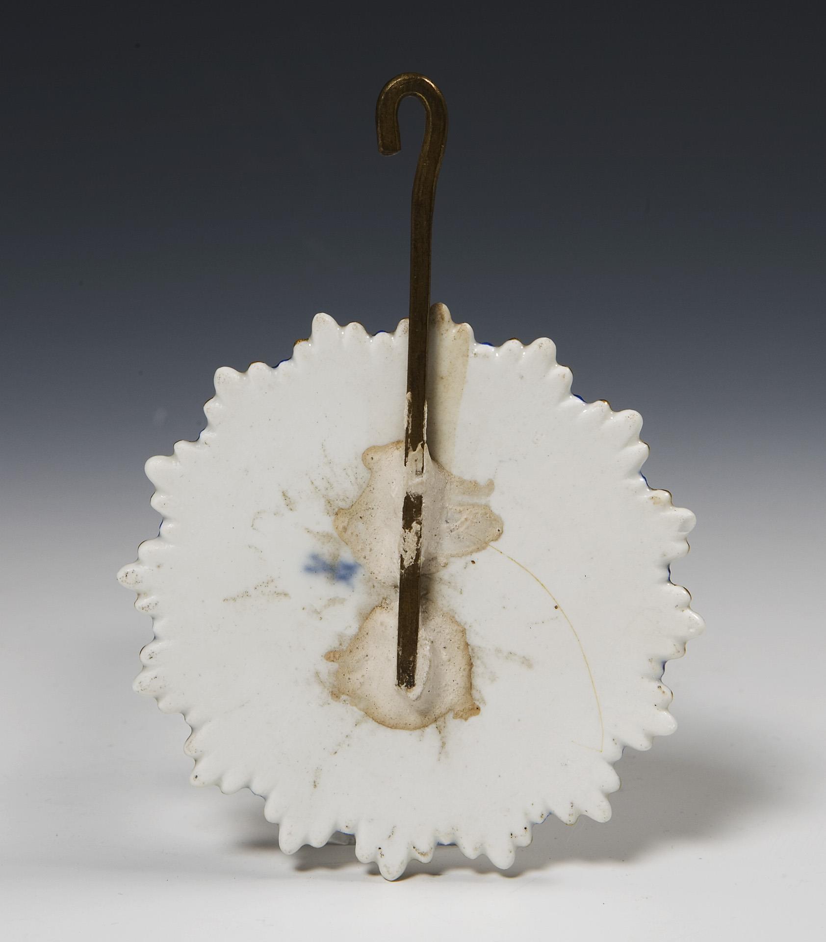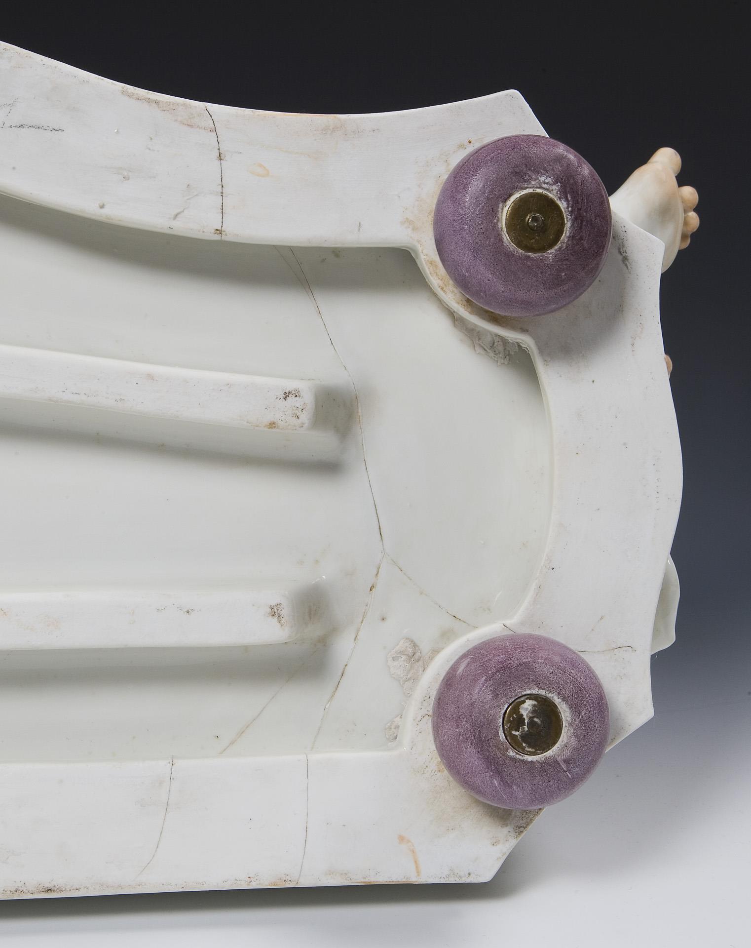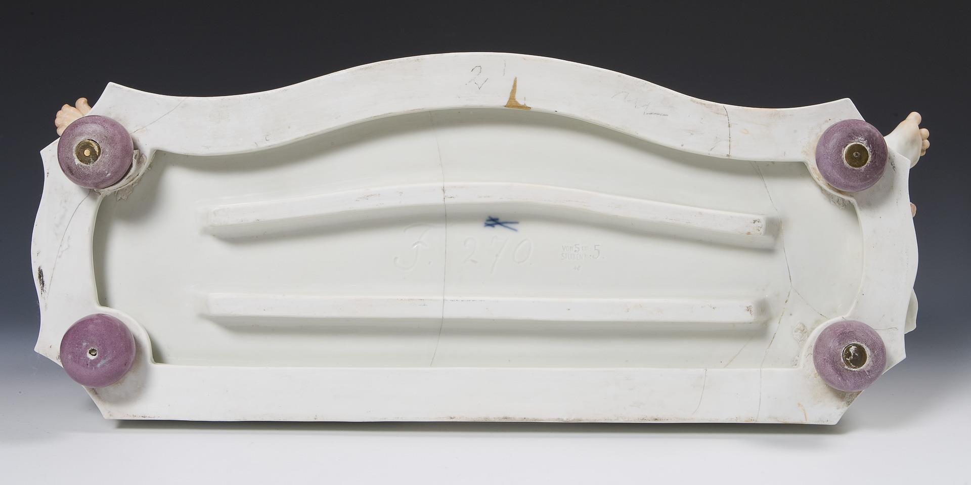 Modell-Jahr: 1920, farbig bemalt. Original-Porzellan-Zifferblatt mit reliefierten arabischen Zahlen, originale Porzellan-Pendellinse. Lenzkirch-Uhrwerk mit Schlagwerk auf Glocke, Schlüsselaufzug, montierte Kugelfüße. Ritzmarke Pressmarke, Malermarke, Schwertermarke, Pressmarke: von 5 Urstücken Nr. 5, handschriftliches Künstler-Signet, datiert: 1920. 1918 wurde die Herstellung von Urstücken (Künstler-Exemplare) eingeführt. Die Ausformung und Staffierung dieser Exemplare wurde vom Künstler selbst überwacht oder nochmals überarbeitet. Daher sind Urstücke meist vom Künstler selbst in Überglasurfarbe signiert. Brandrisse zeugen von den technischen Schwierigkeiten bei der Herstellung von Urstücken. Mittig und an den Seiten mehrere Risse durch den Sockel, kleiner Ausbruch am Sockelboden, mittig am Sockel kleiner Farbabplatzer, eine Amorette mit nachgebesserten Brandrissen an Handgelenk und Unterkörper, eine Amorette mit Haarriss an Beinen und Tuch, Pendel mit Haarriss an der Unterseite, Pendel-Montierung ergänzt, Uhrwerk defekt, ein Zeiger und Schlüssel fehlen.