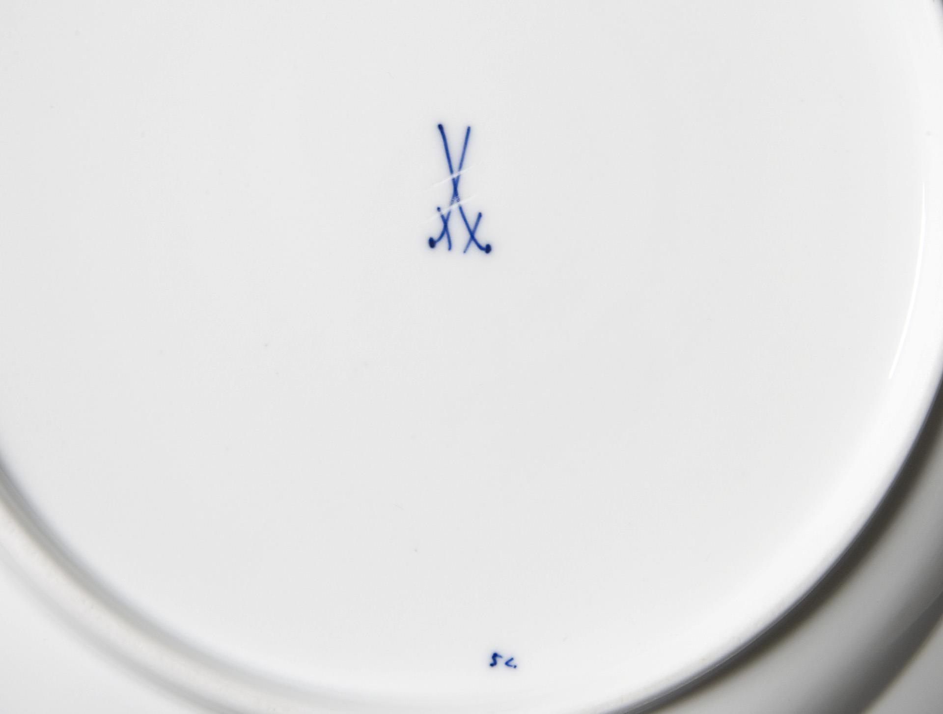 Form-Modell von 1901, Dekor von Theodor Grust 1907. Kobaltblaue Unterglasurbemalung, geometrisches Dekor aus dem sogenannten "Bügelservice". Form "T-glatt", Schwertermarken zweimal gestrichen.