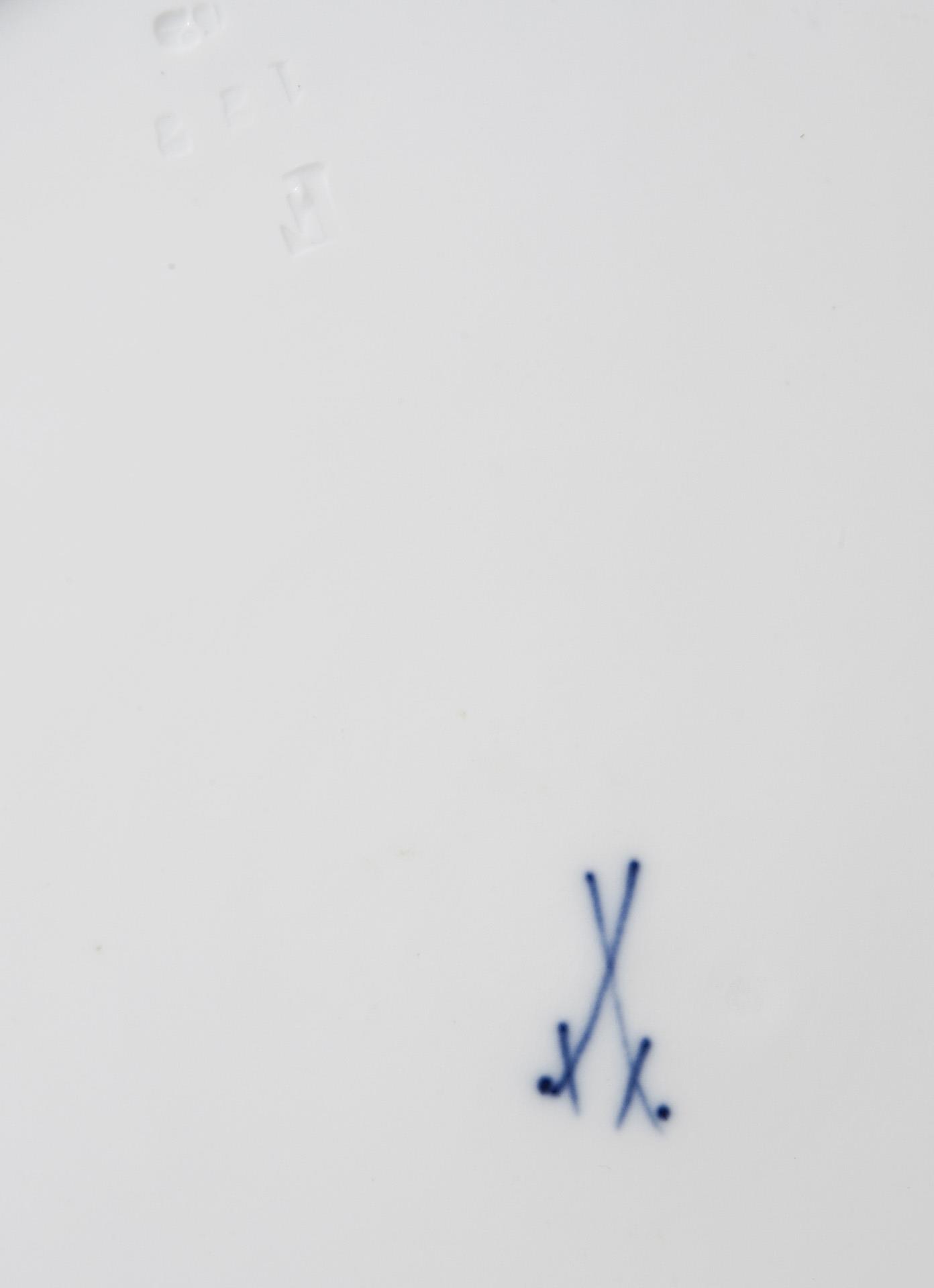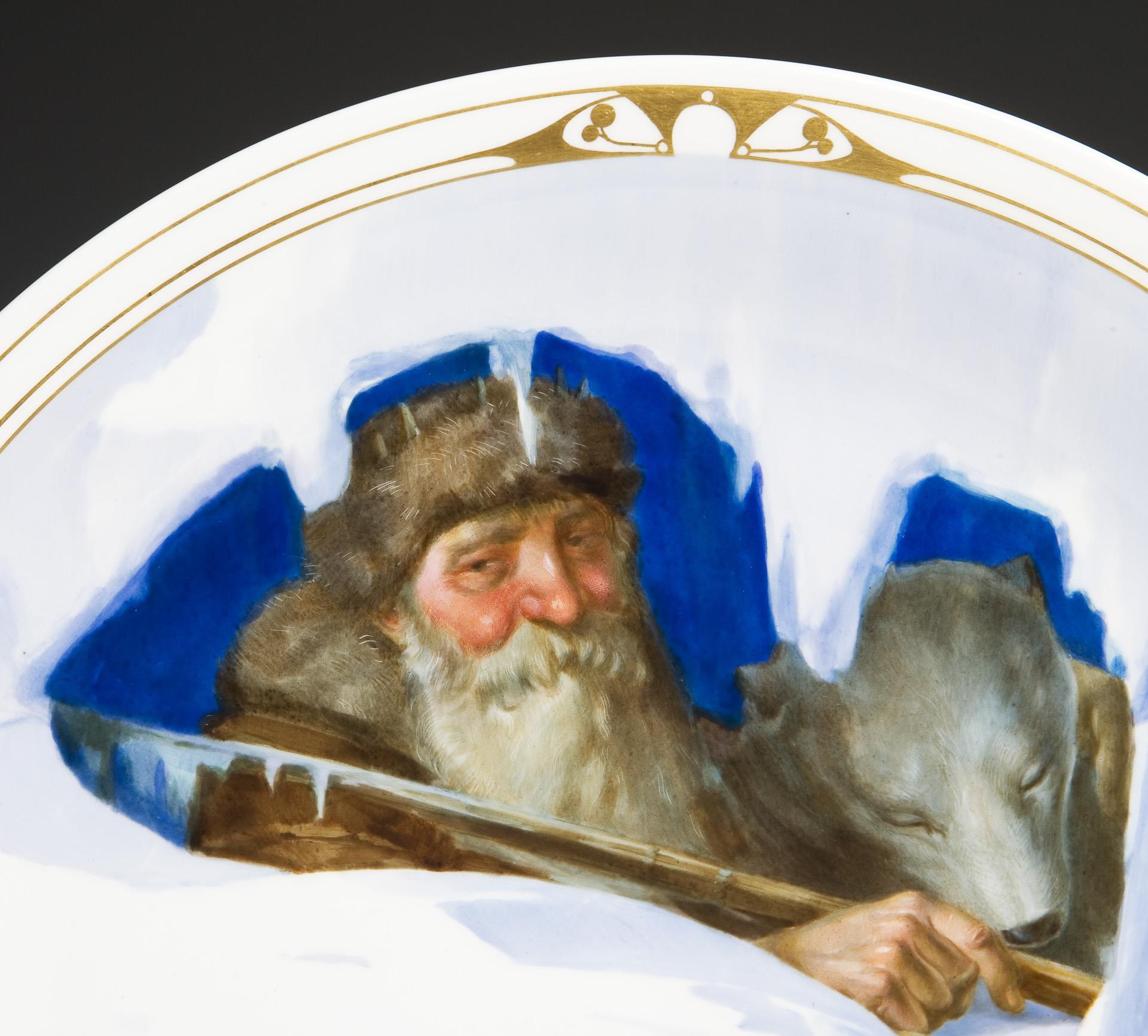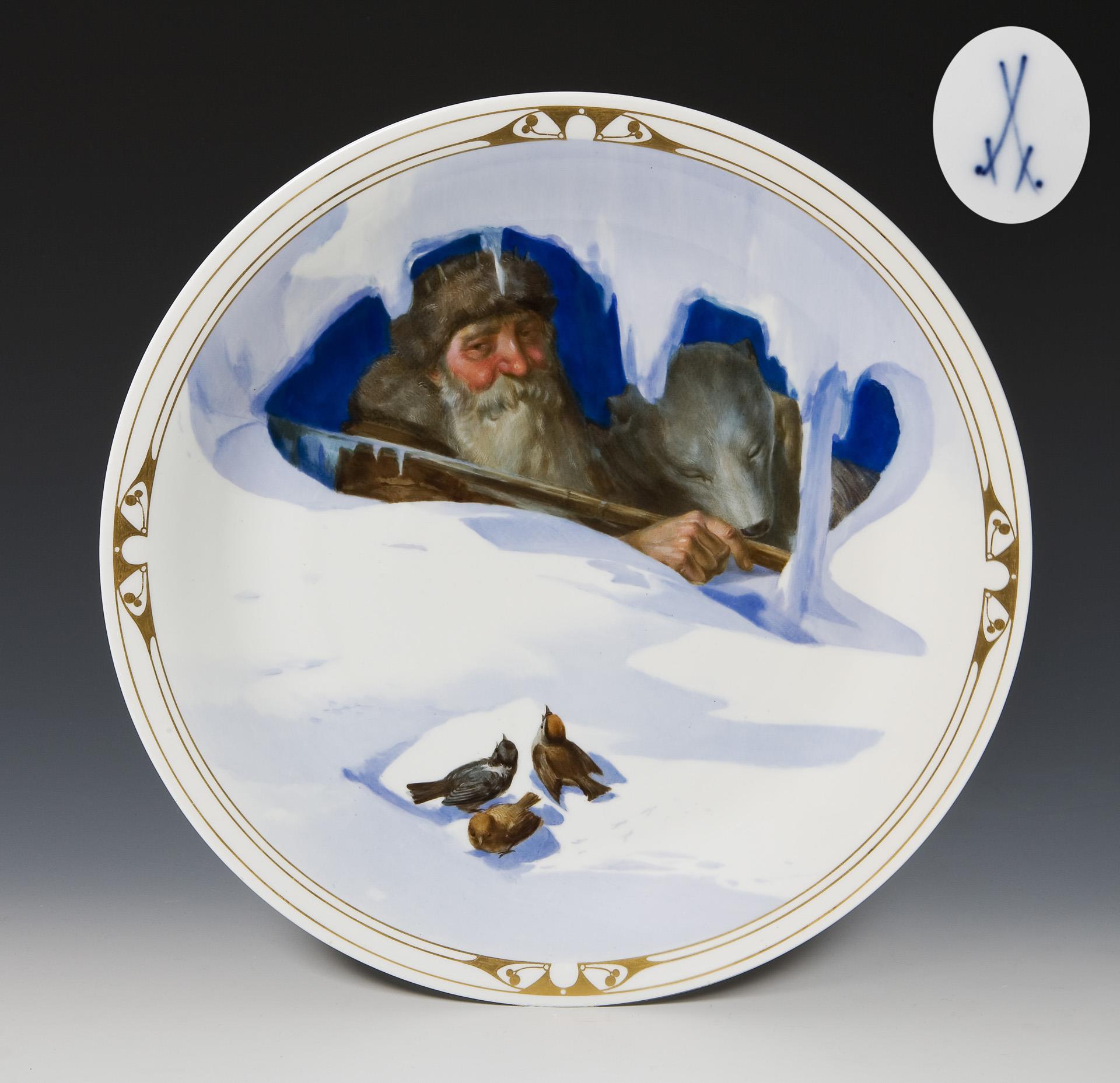 Form-Modell von Ernst August Leuteritz und Mitarbeiter, Modell-Jahr: 1863-1865 (Form). Motiv "Väterchen Frost" in farbiger Unterglasurmalerei, ornamentales Golddekor am Rand. Pressmarken, Schwertermarke.