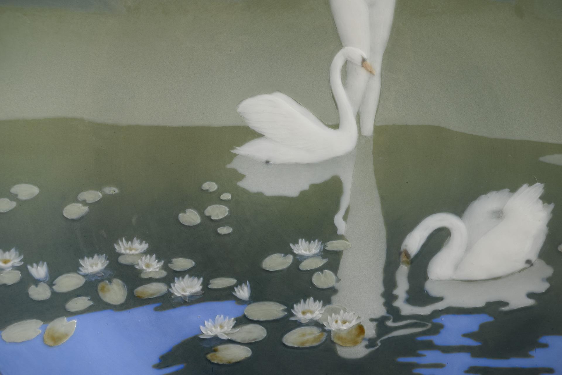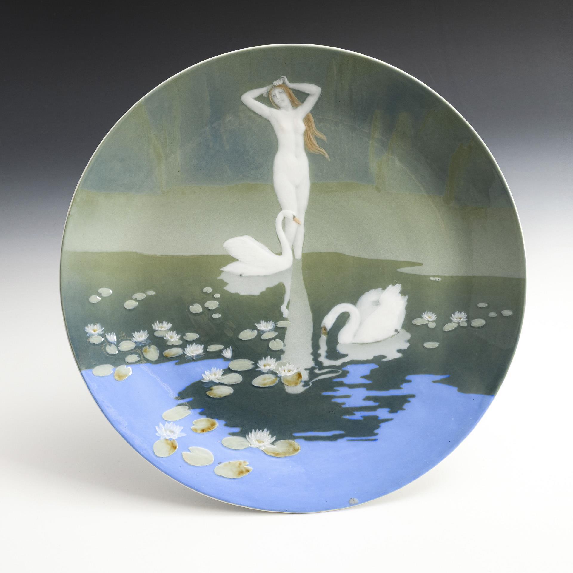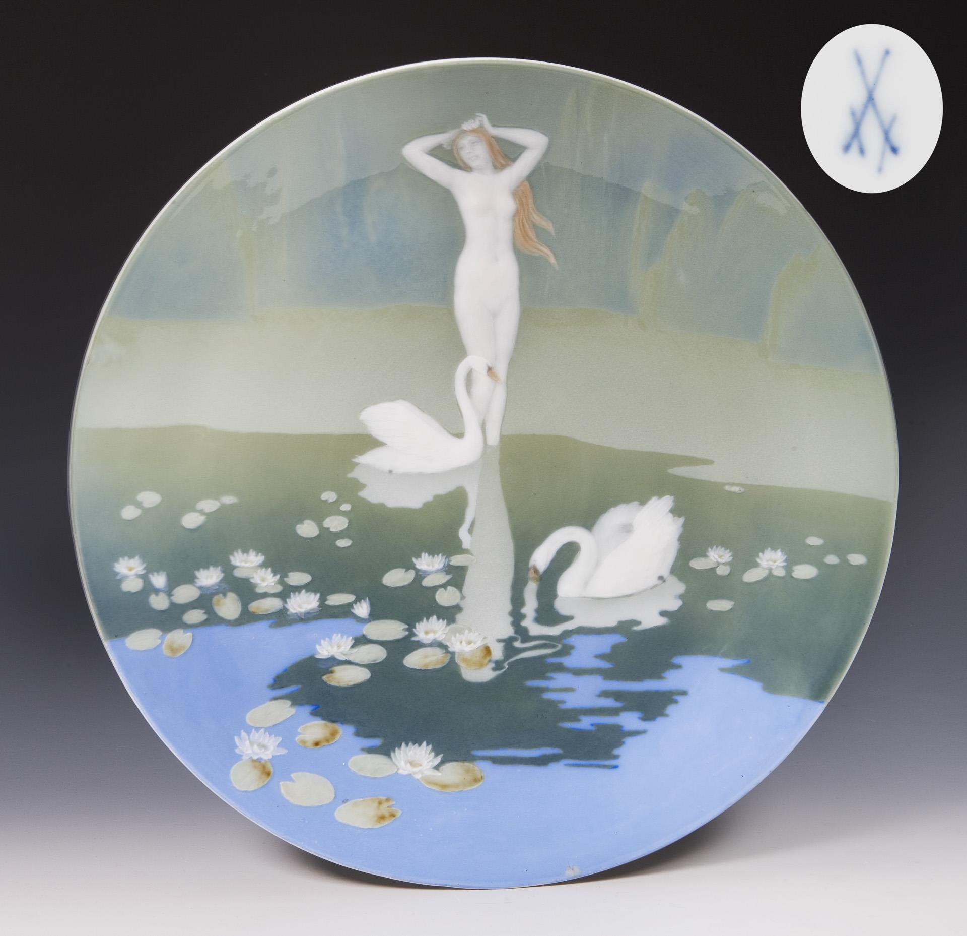 Form-Modell von Ernst August Leuteritz und Mitarbeiter, Modell-Jahr: 1863-1865 (Form), farbige Unterglasurmalerei, Motiv in Pâte-sur-pâte-Technik: "Nymphe mit Schwänen am Seerosen-Teich", rückseitig montierter Messingring mit Öse zum Aufhängen, Ritzmarke, Pressmarke, Schwertermarke. Standring minimal bestoßen.