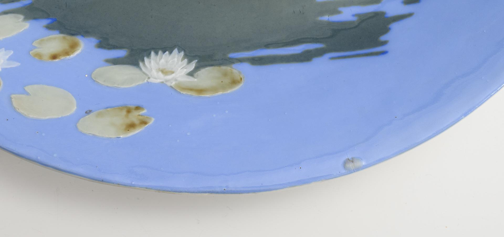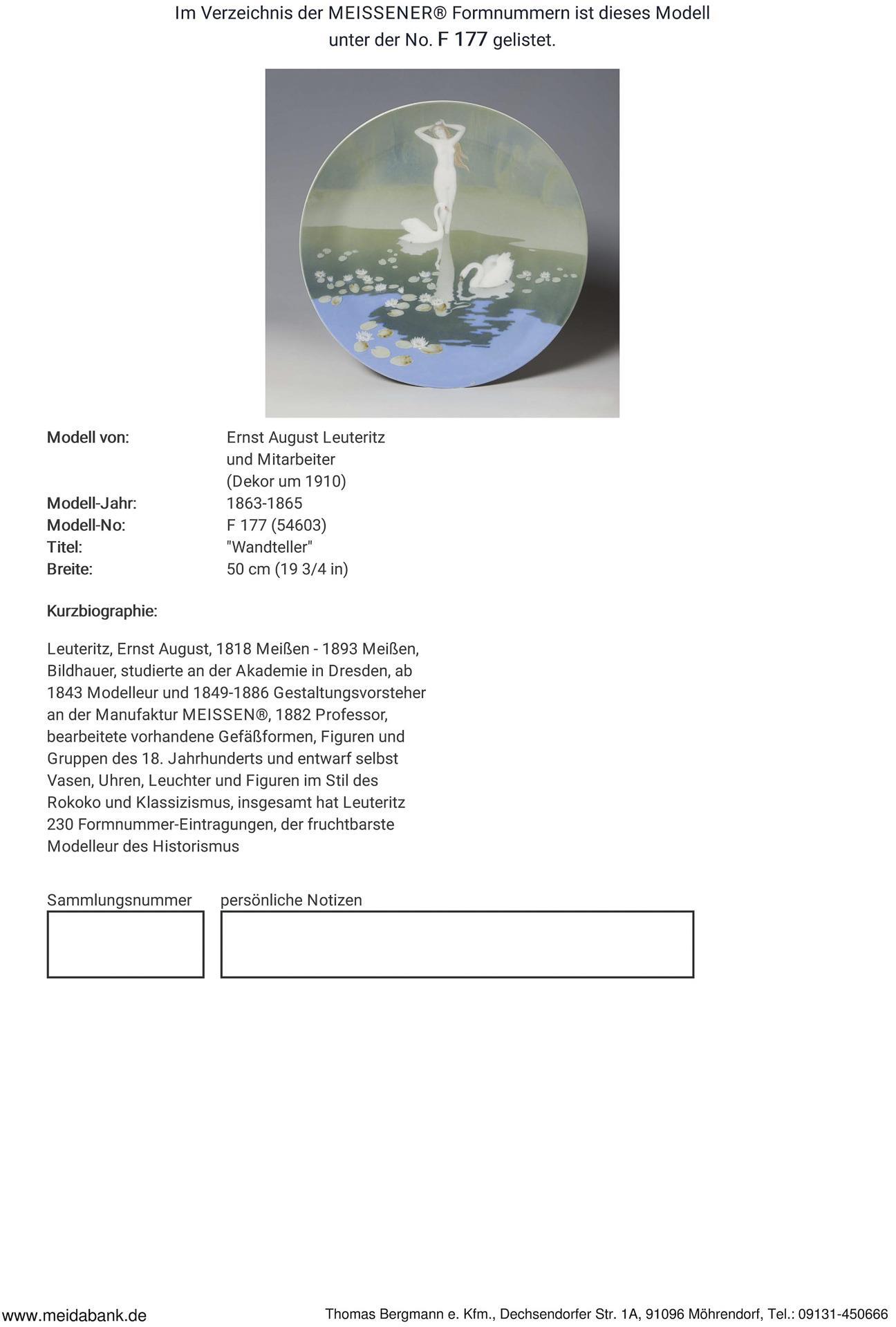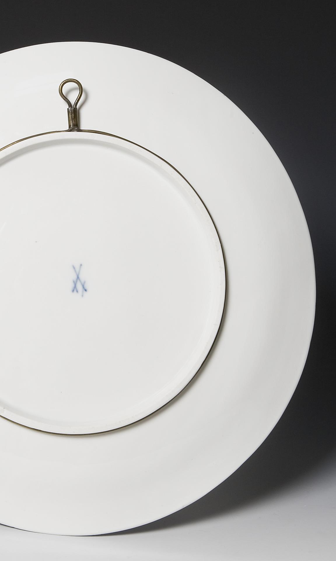 Form-Modell von Ernst August Leuteritz und Mitarbeiter, Modell-Jahr: 1863-1865 (Form), farbige Unterglasurmalerei, Motiv in Pâte-sur-pâte-Technik: "Nymphe mit Schwänen am Seerosen-Teich", rückseitig montierter Messingring mit Öse zum Aufhängen, Ritzmarke, Pressmarke, Schwertermarke. Standring minimal bestoßen.