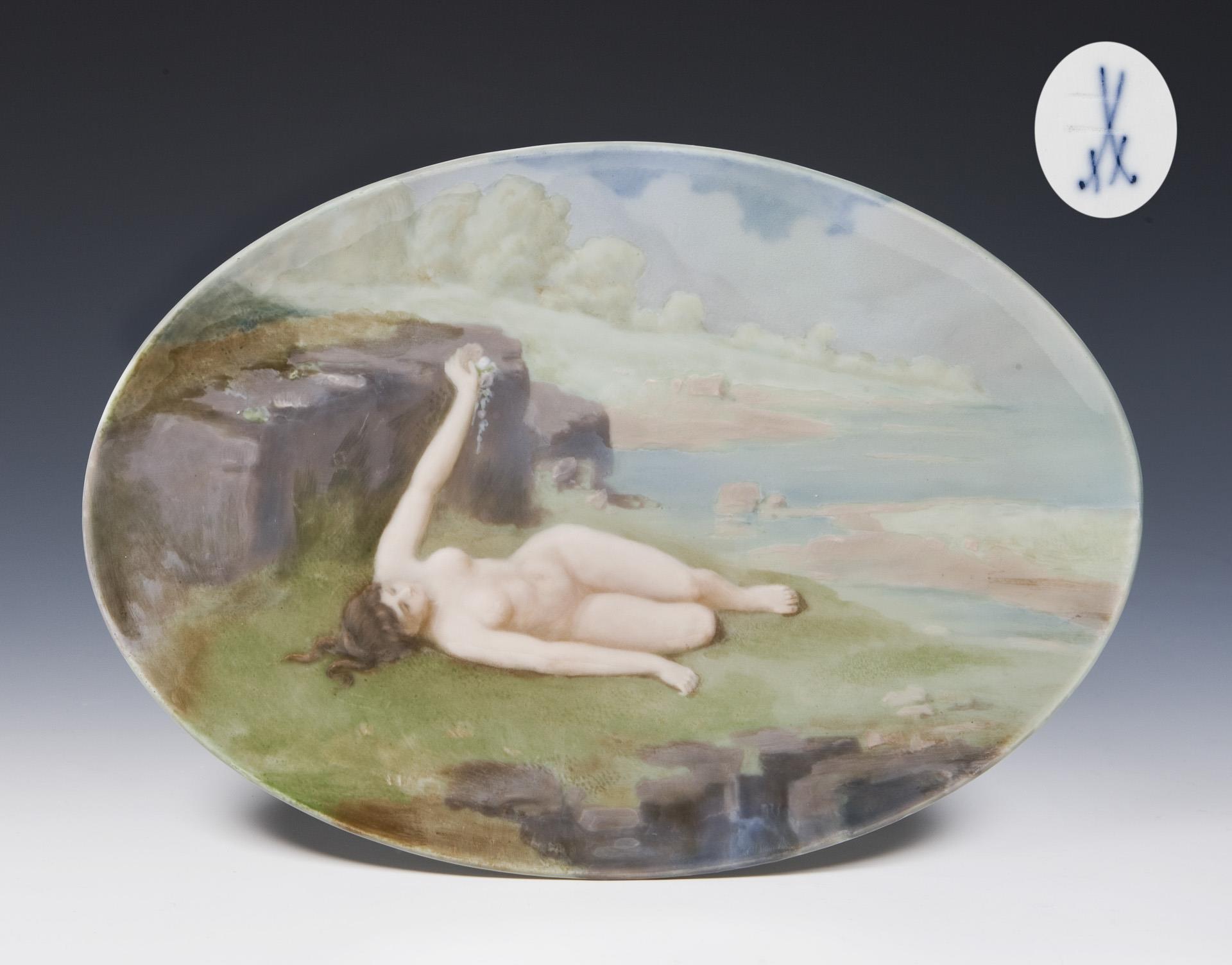 Jugendstil-Plateau: Weiblicher Akt in Küstenlandschaft. Meissen.